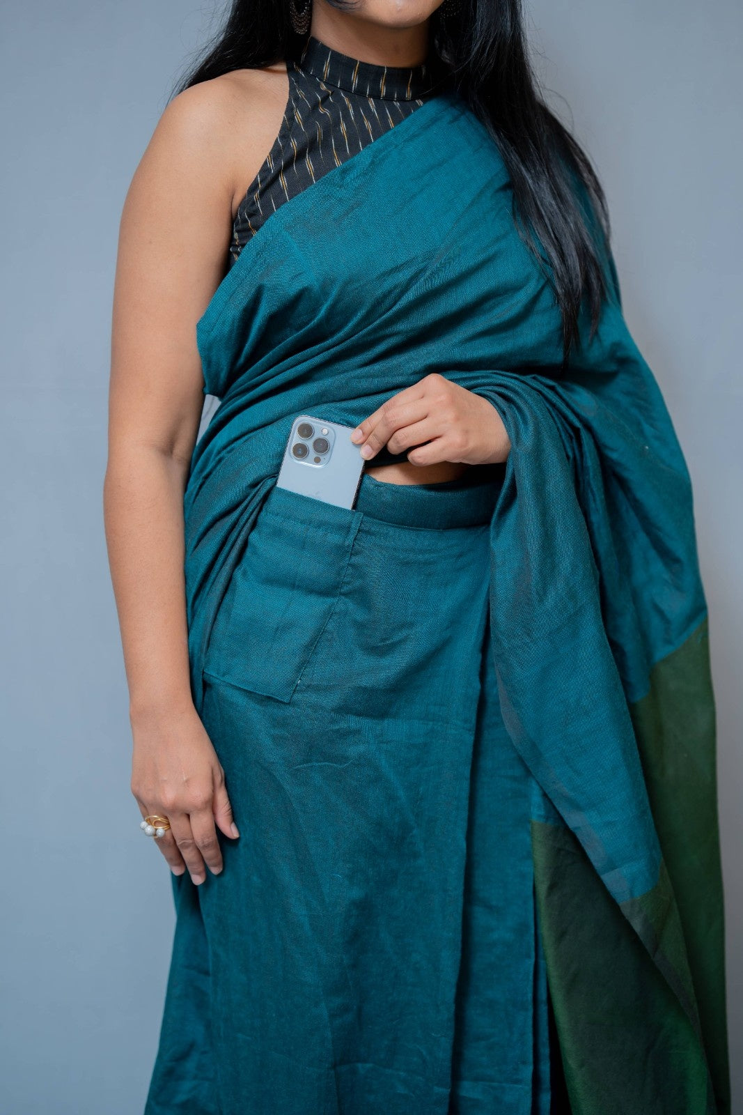 Aanchal - 1 minute Ready-to-wear saree in Teal with green in Khadi fabric