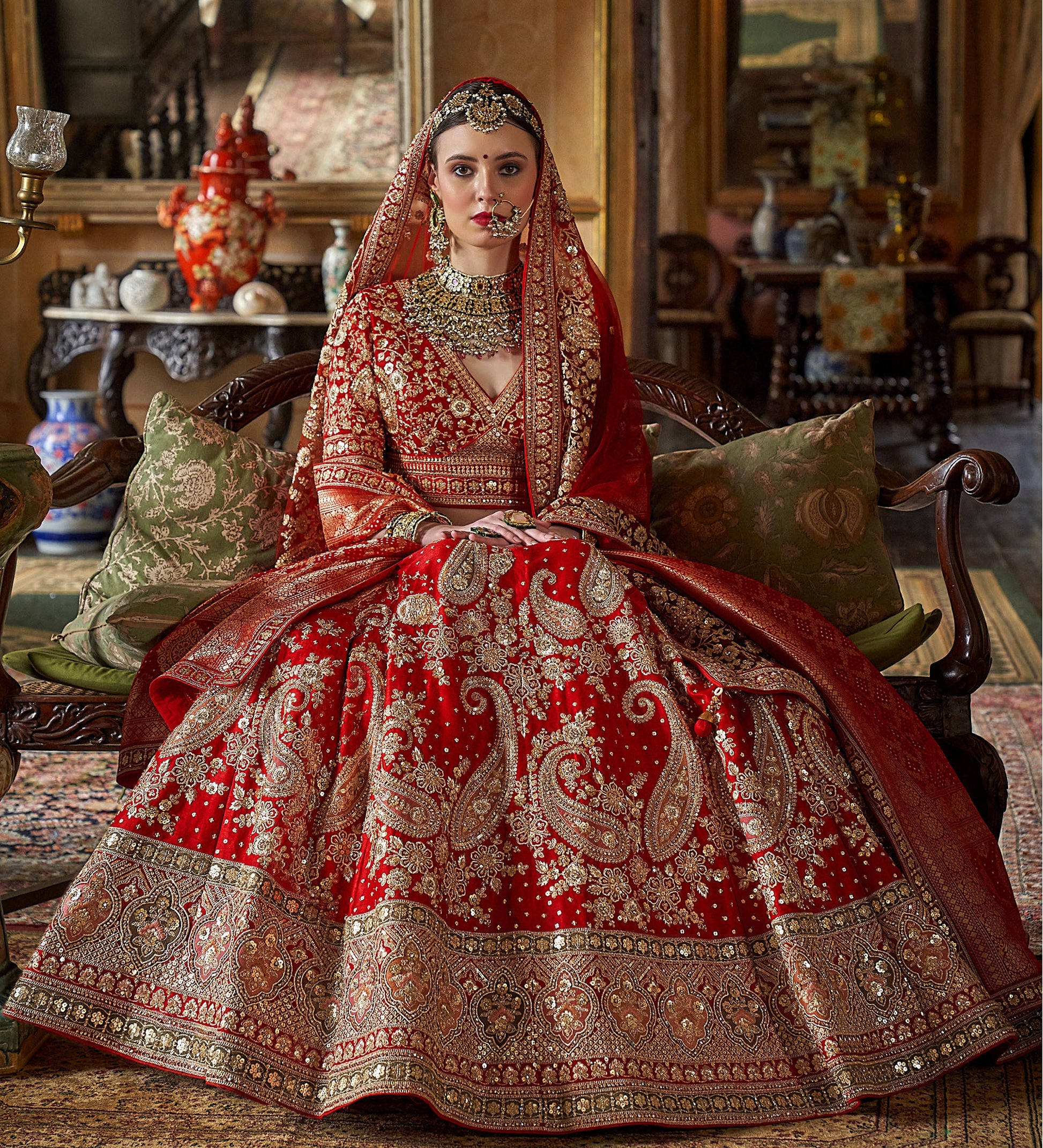 Red Banarasi Silk Zari, Sequins and Floral Embroidery Wedding Lehenga