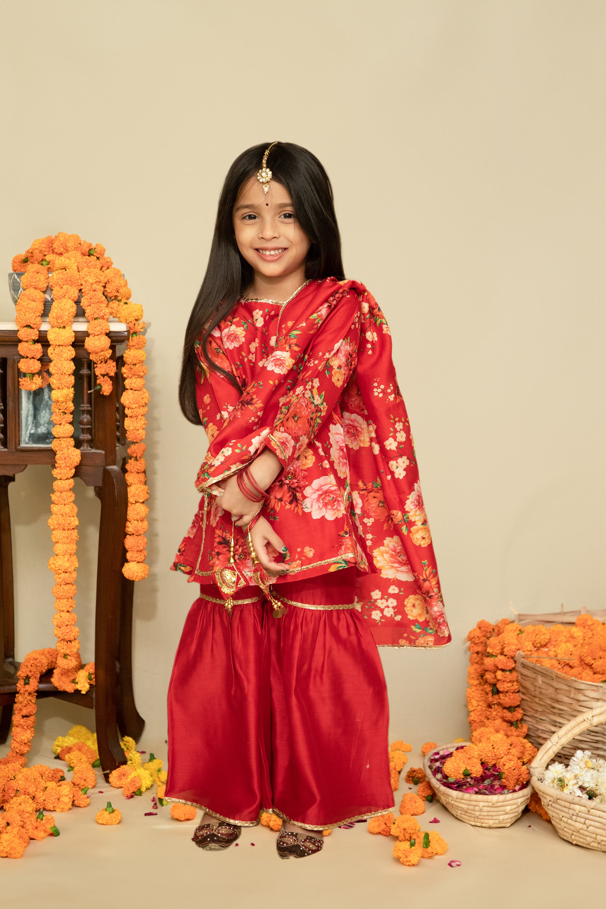 Crimson Red Sharara Set with multi-colour floral motif print.Butterfly Net Dupatta