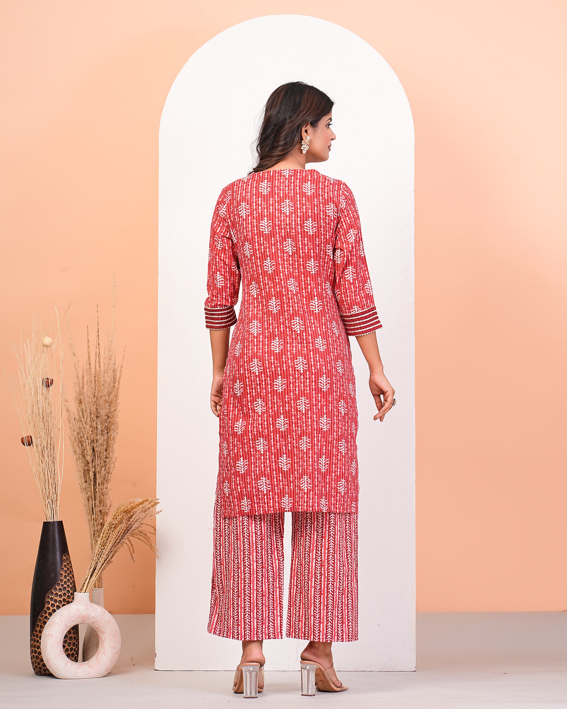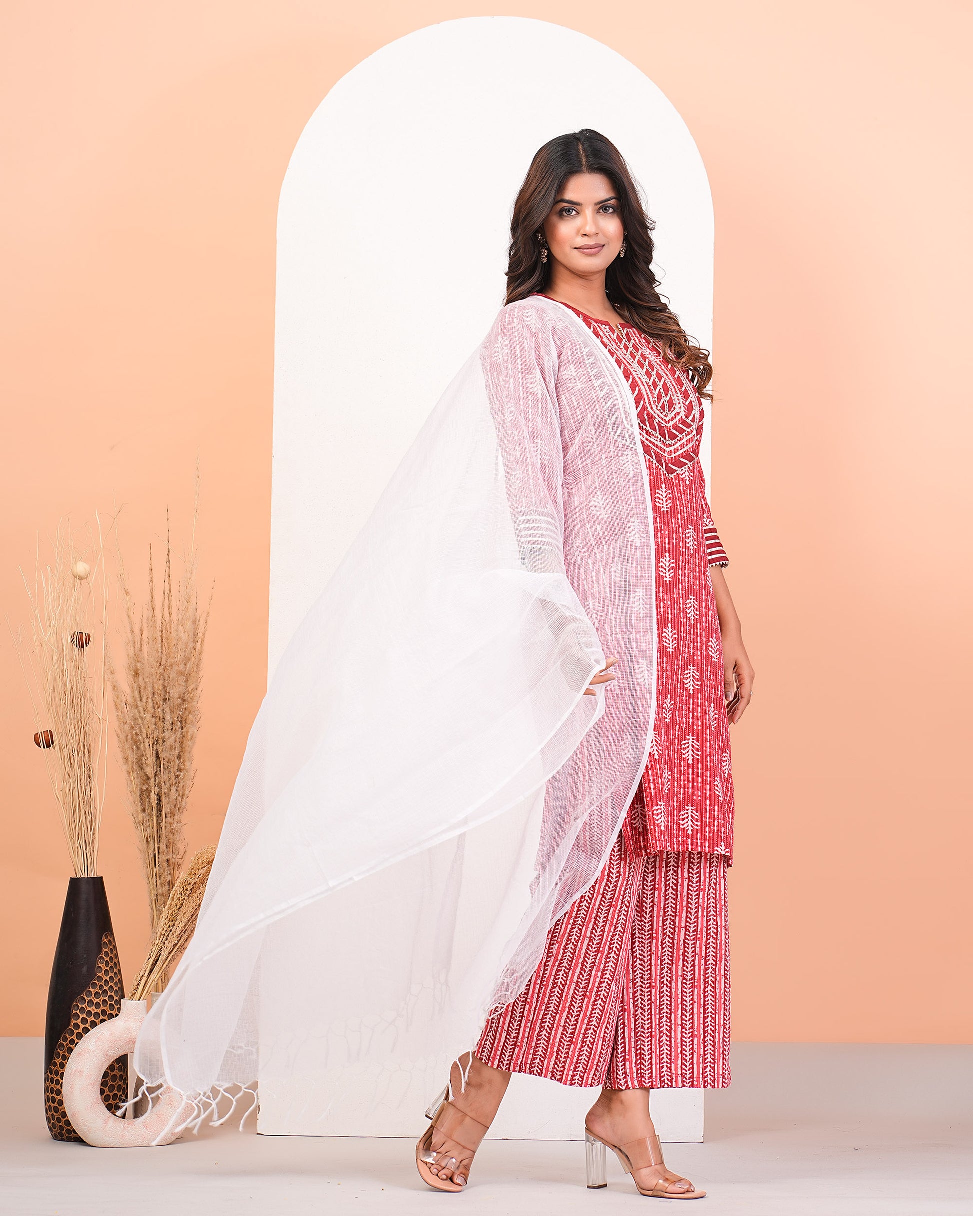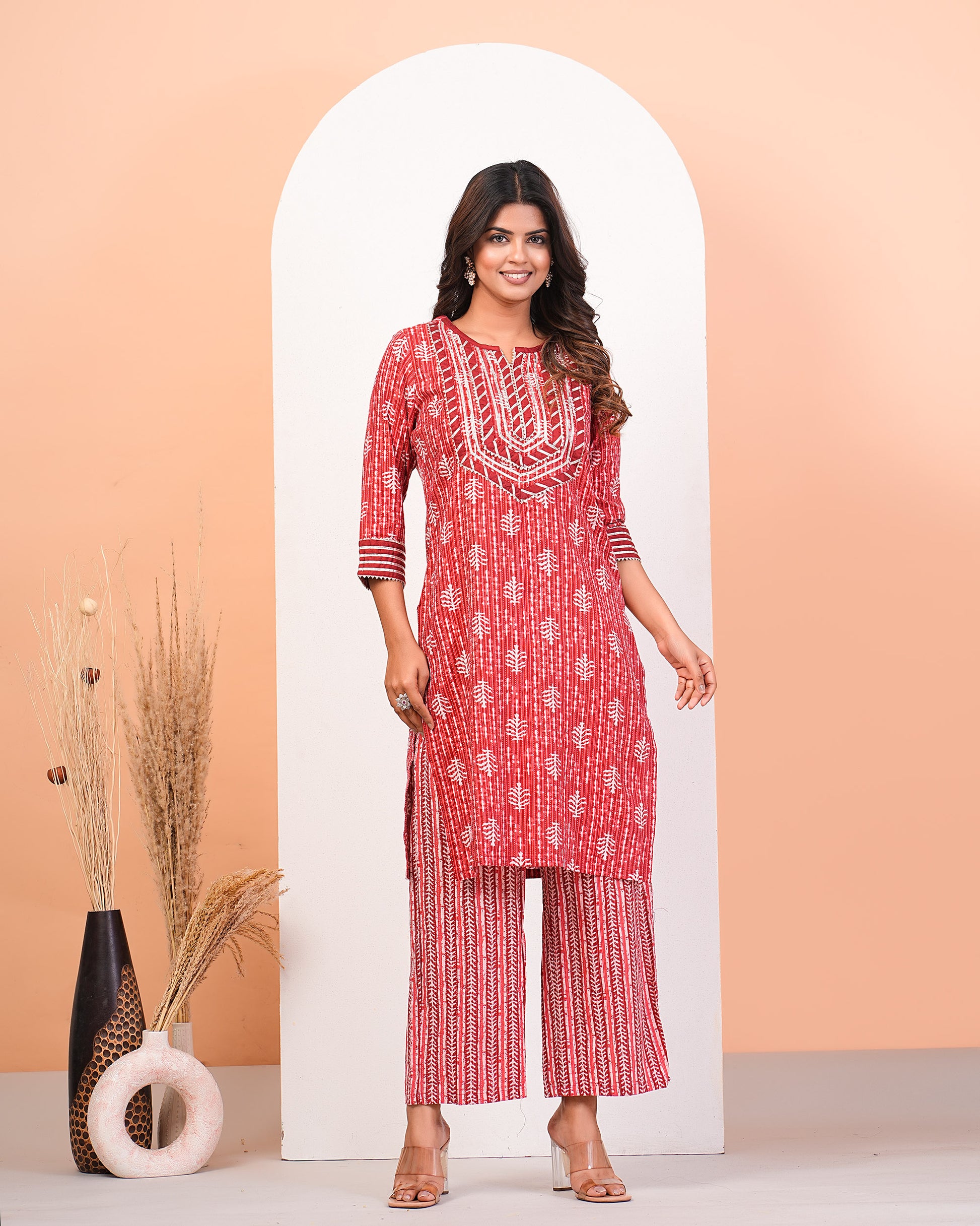 Red Katha Printed Kurta Set With Gota Lace Detailing