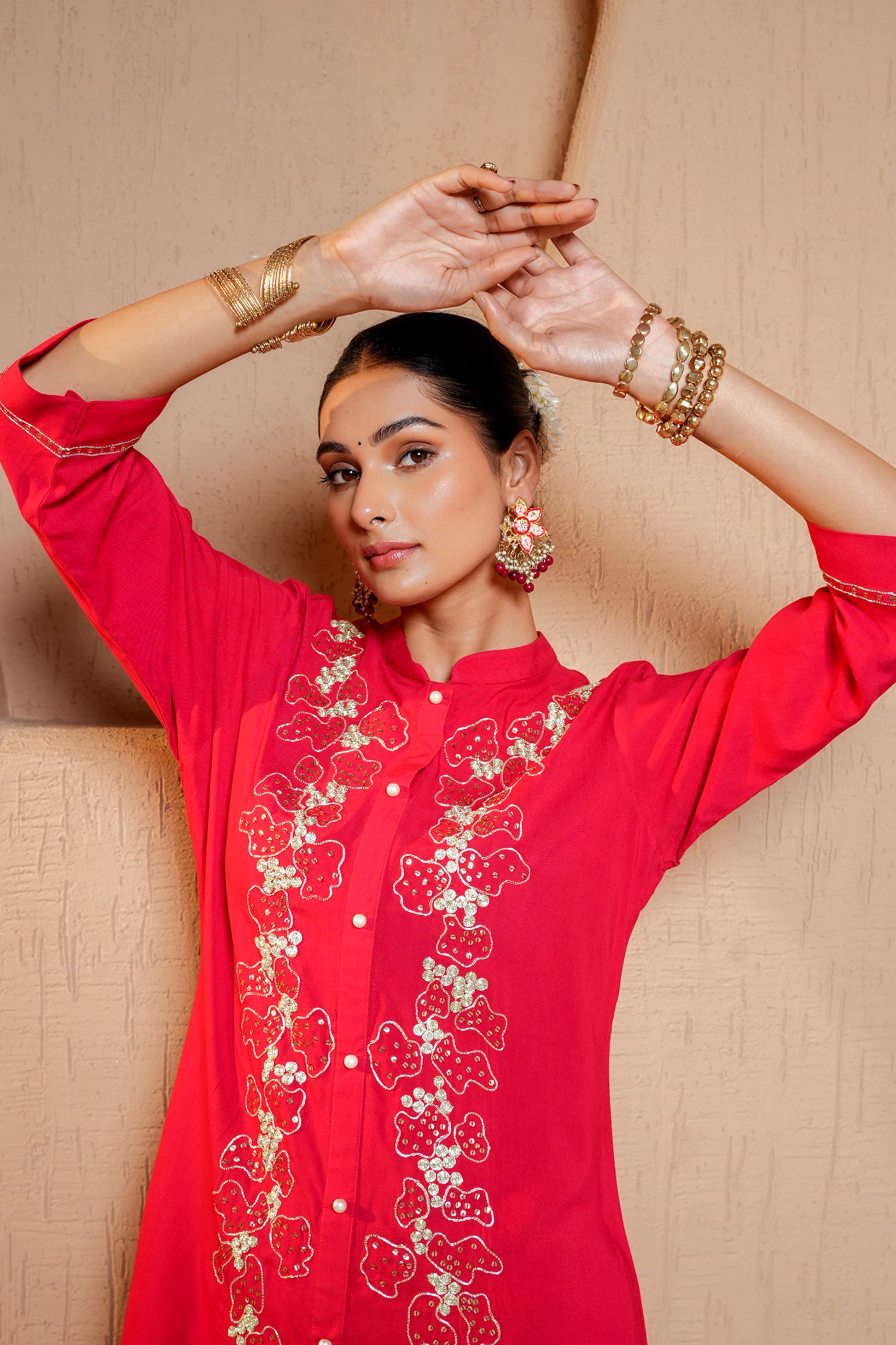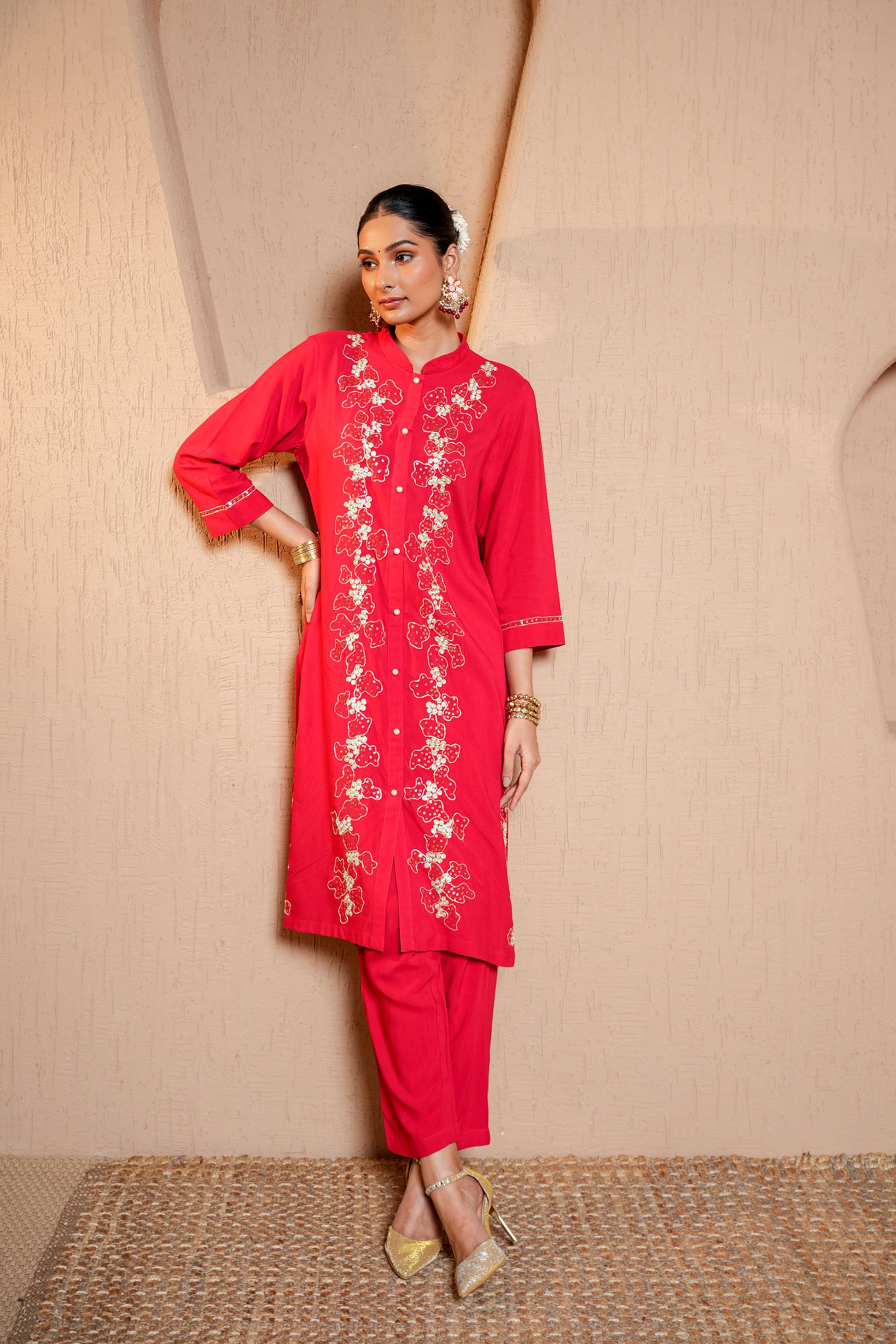 Red Rayon Zari & Dori Machine Embroidery Kurta Set