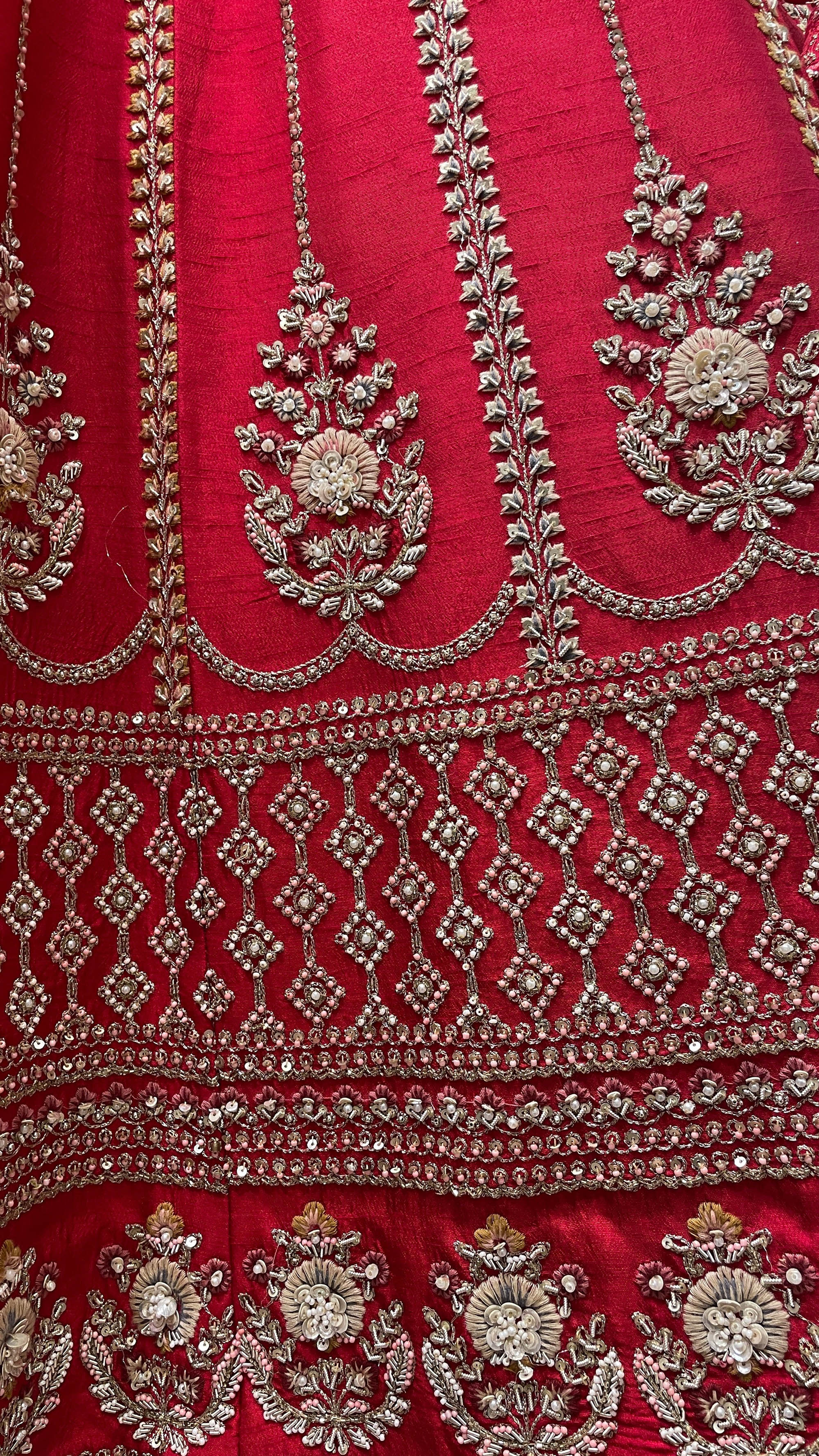 This one-of-a-kind lehenga is made from high-quality net fabric and features intricate embroidery, sequins, and pearl work. With a vibrant red color, this lehenga is sure to make a statement on your special day.