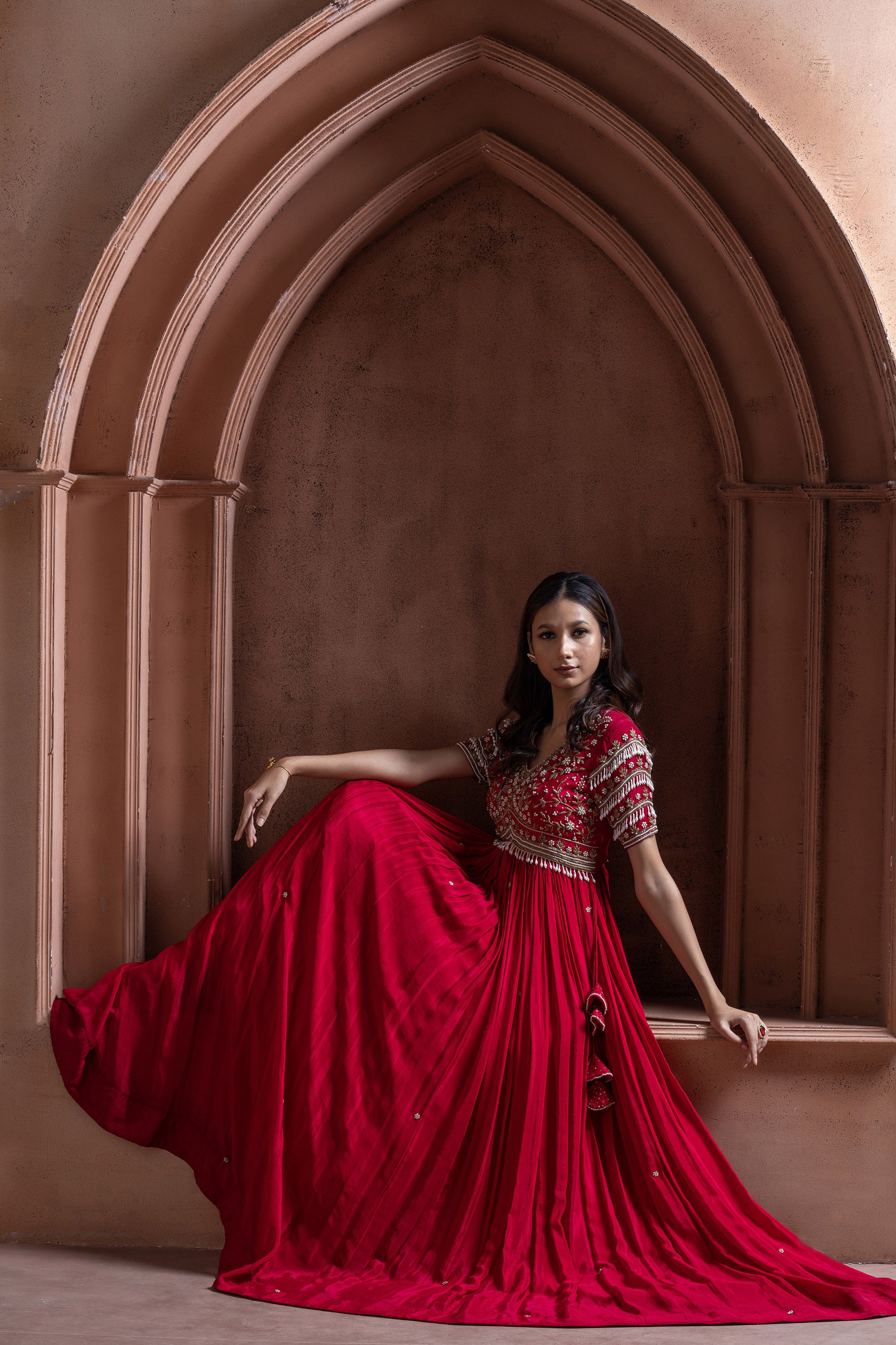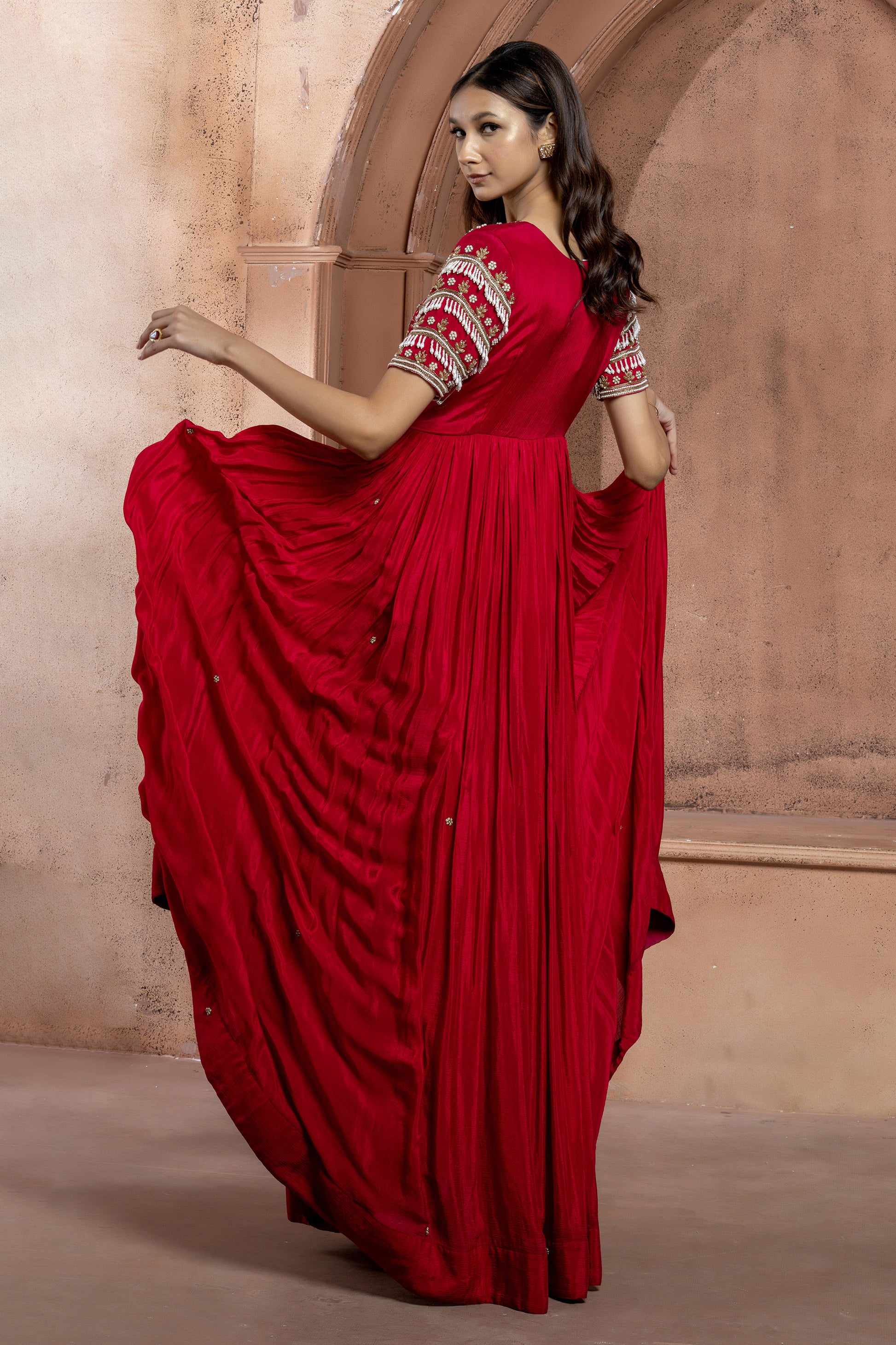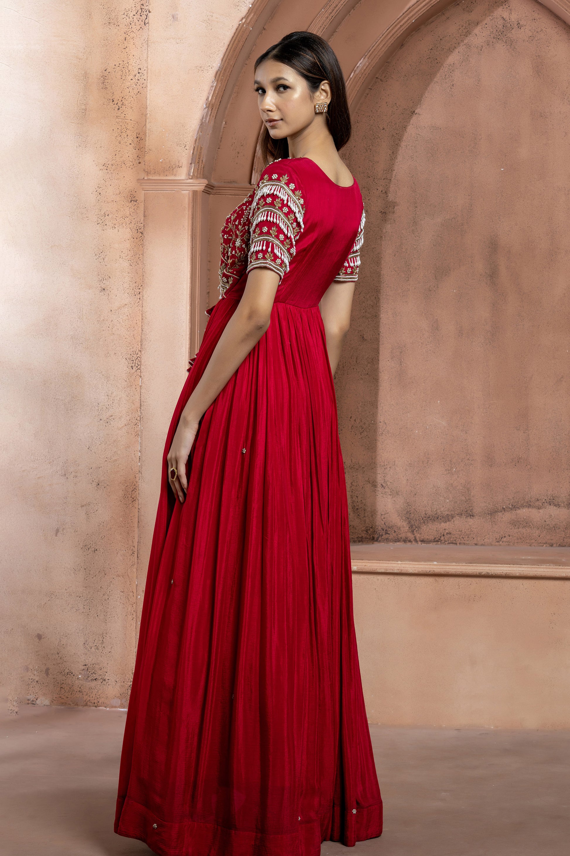 Reddish Pink Crepe Long Embellished Gown