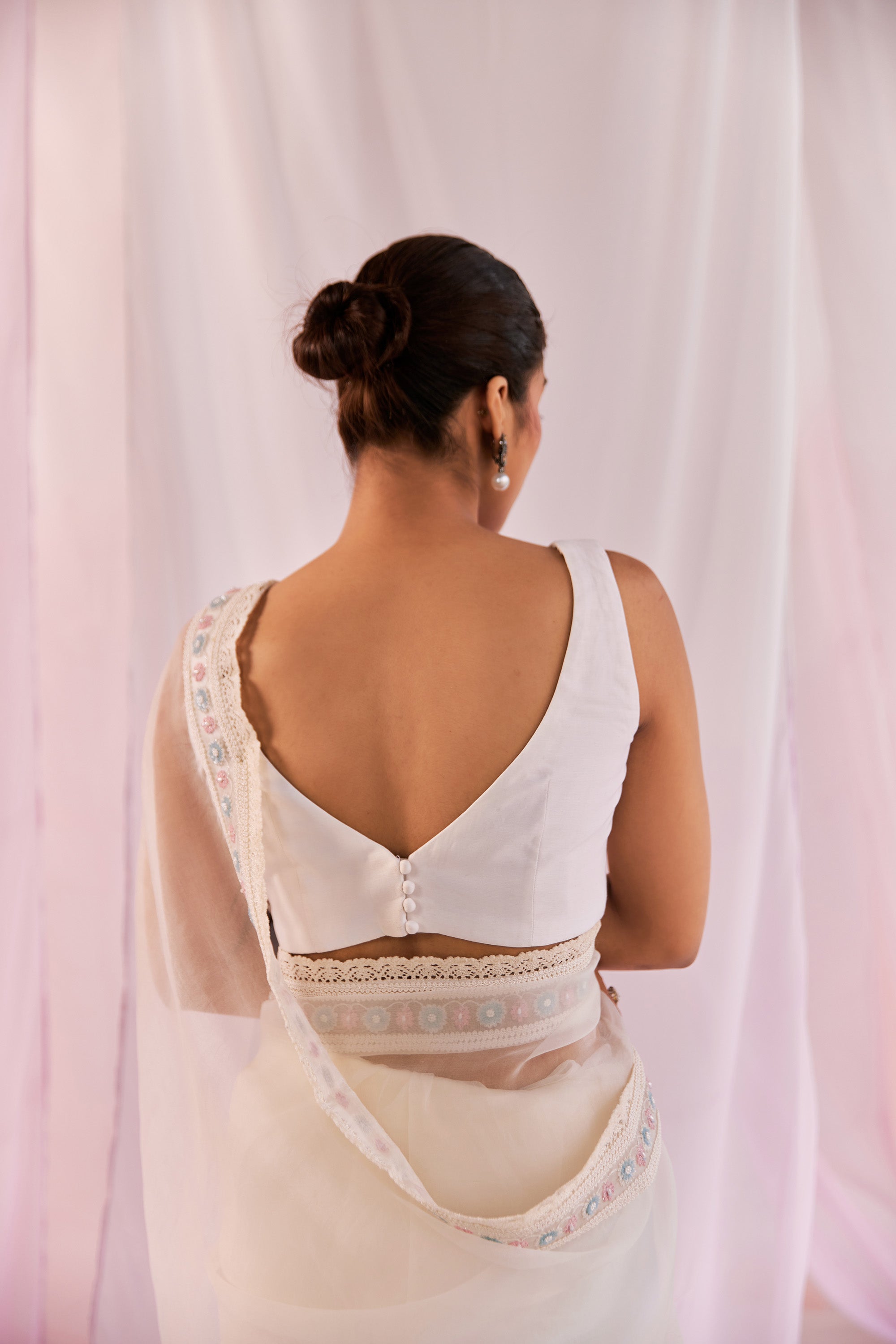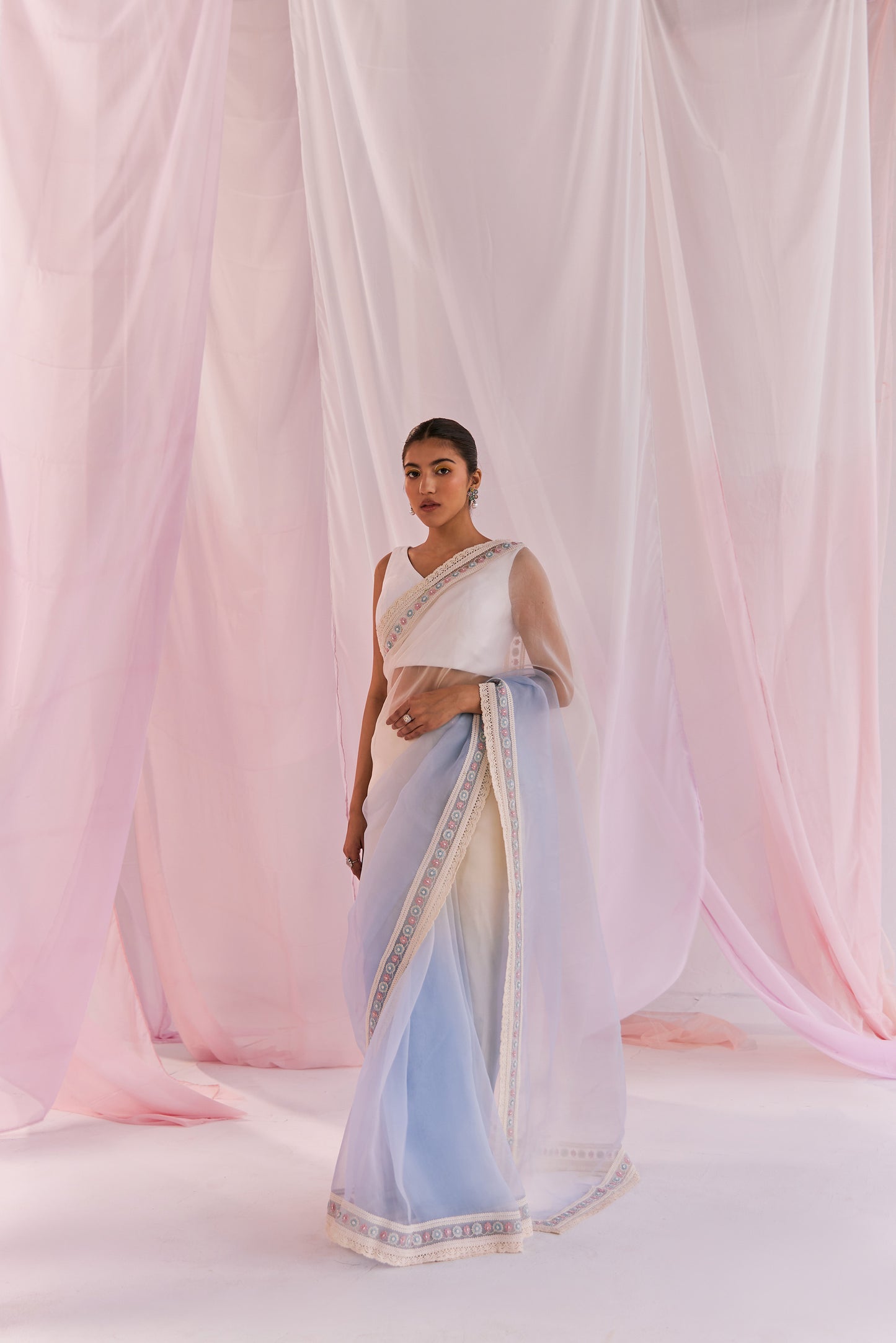 RENEE SAREE - Featuring an Ivory-blue ombre Saree in Silk Organza base with Dori embroidery, sequin and pearl embellishments