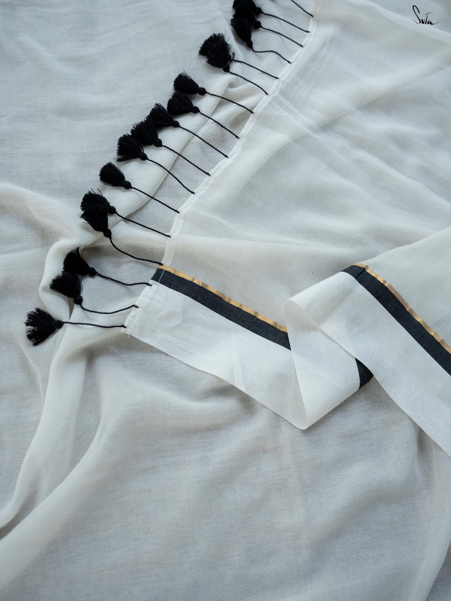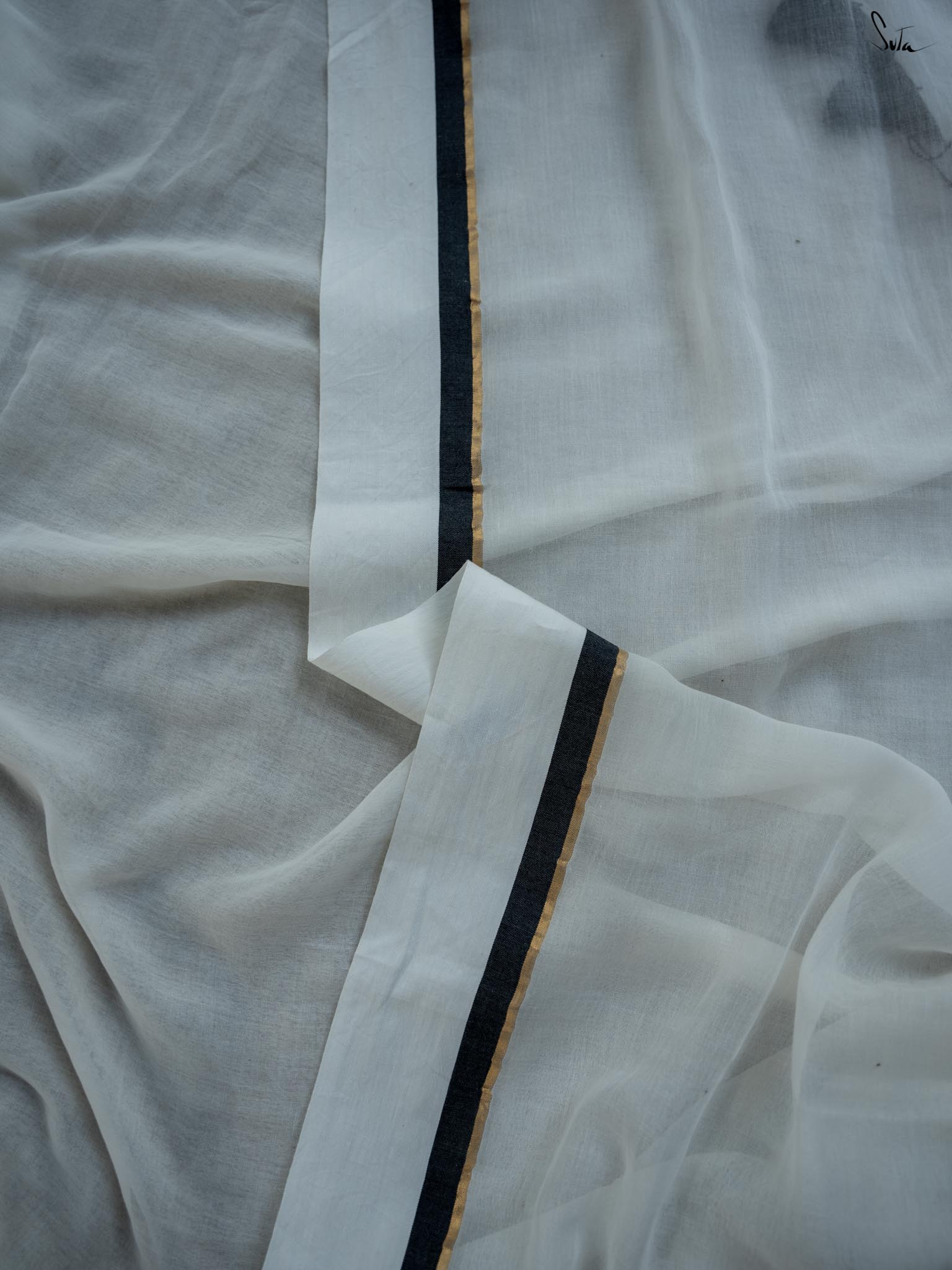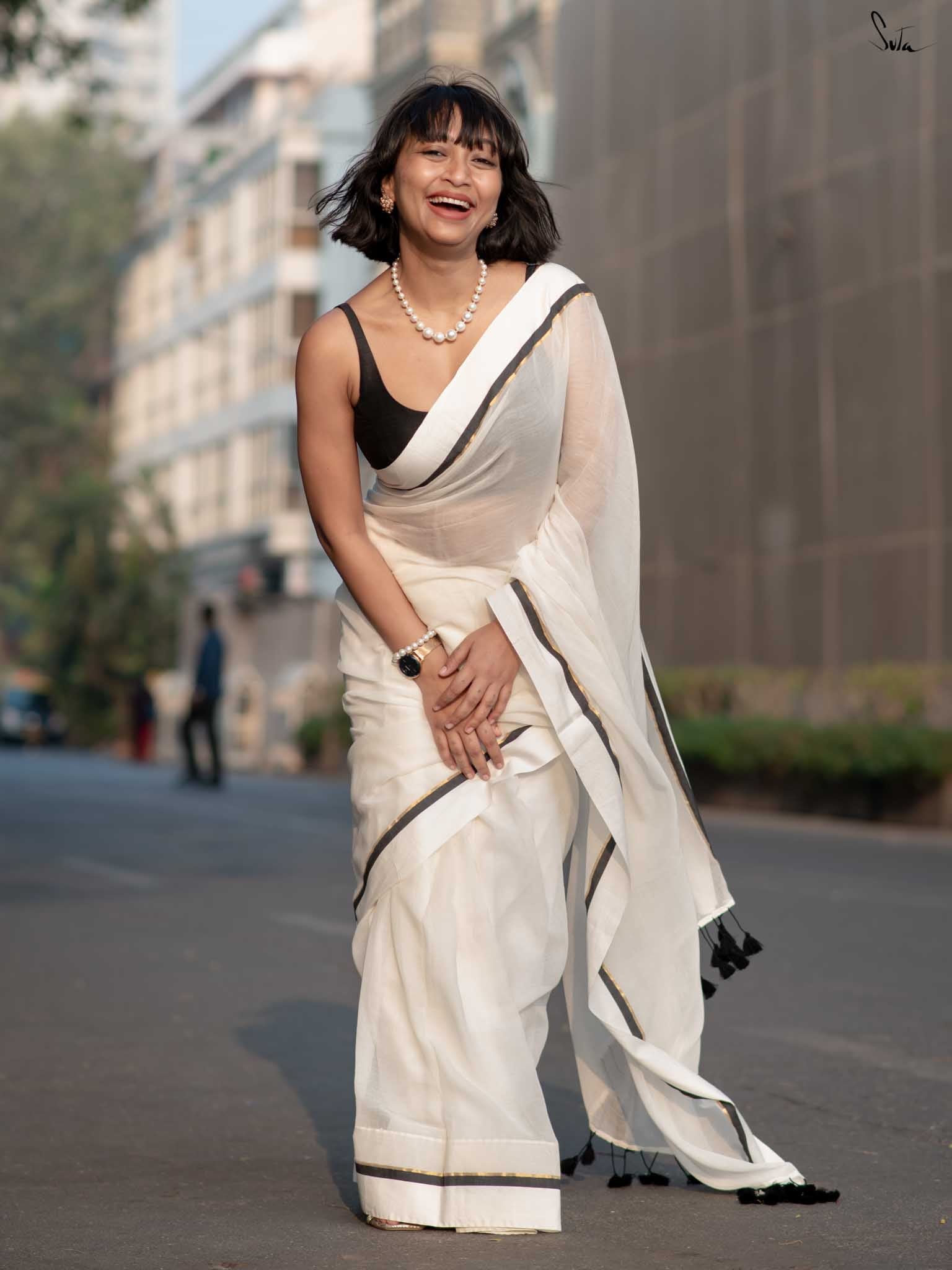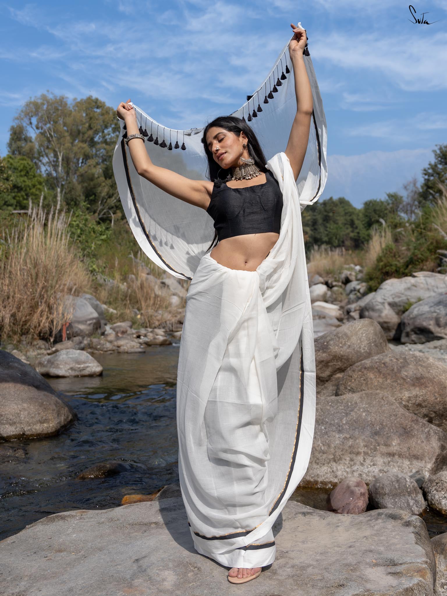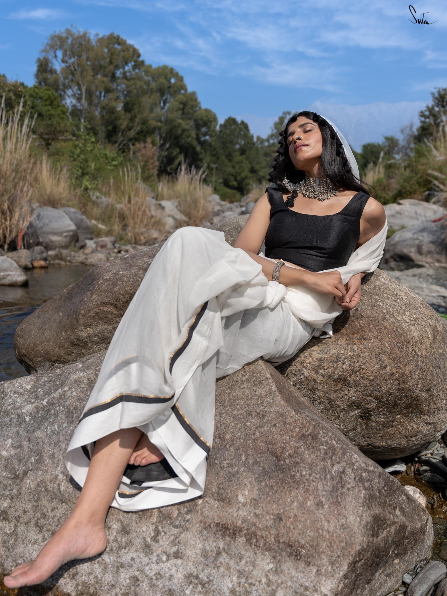 The word Rohi means “a flower that touches a heart". Drawing inspiration from its name, this saree spreads a message of celebrating the simple joys of day-to-day life and inspires us to sport a bright smile even in the most adverse situations. The serenity of the color white gets intertwined with the mysterious black, and it all together creates a symphony that describes beauty, warmth, and timelessness. Honoring the hands that weave magic with their tireless efforts, the saree is a beauty waiting to be explored!