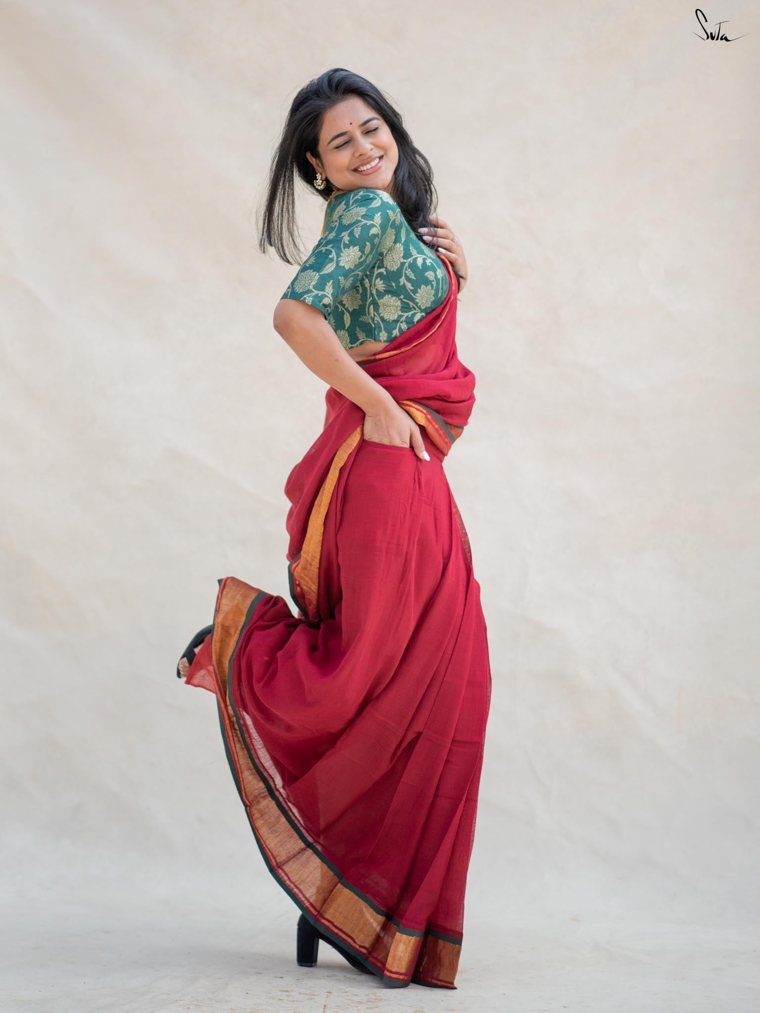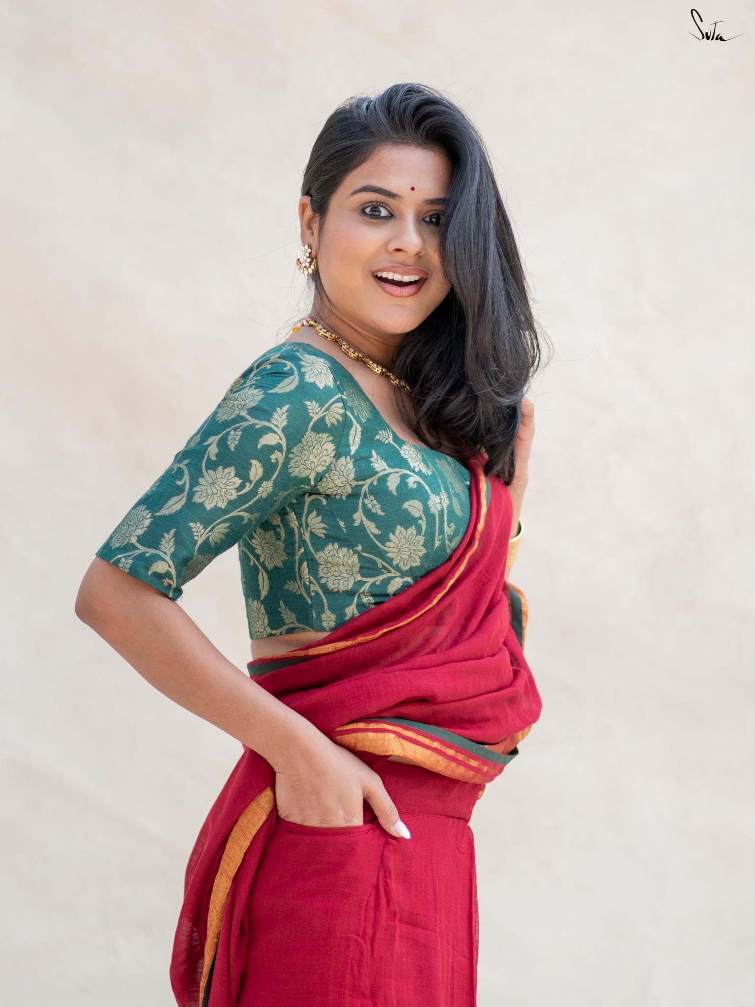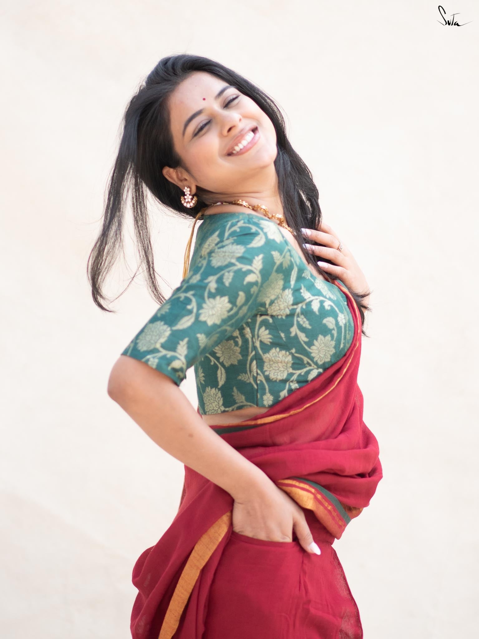 Blouse: Su, the model is wearing size S of the blouse called Hara kamal