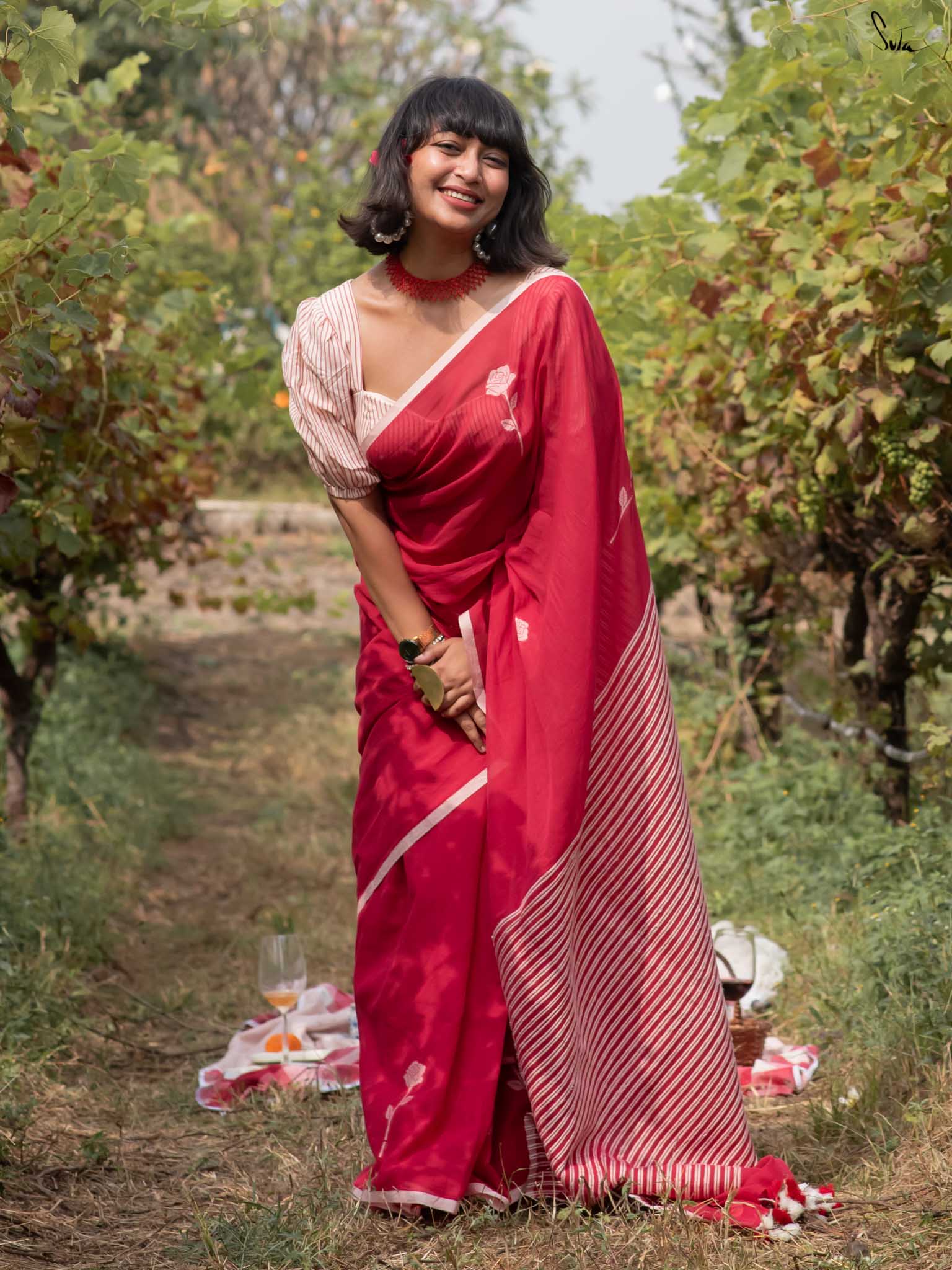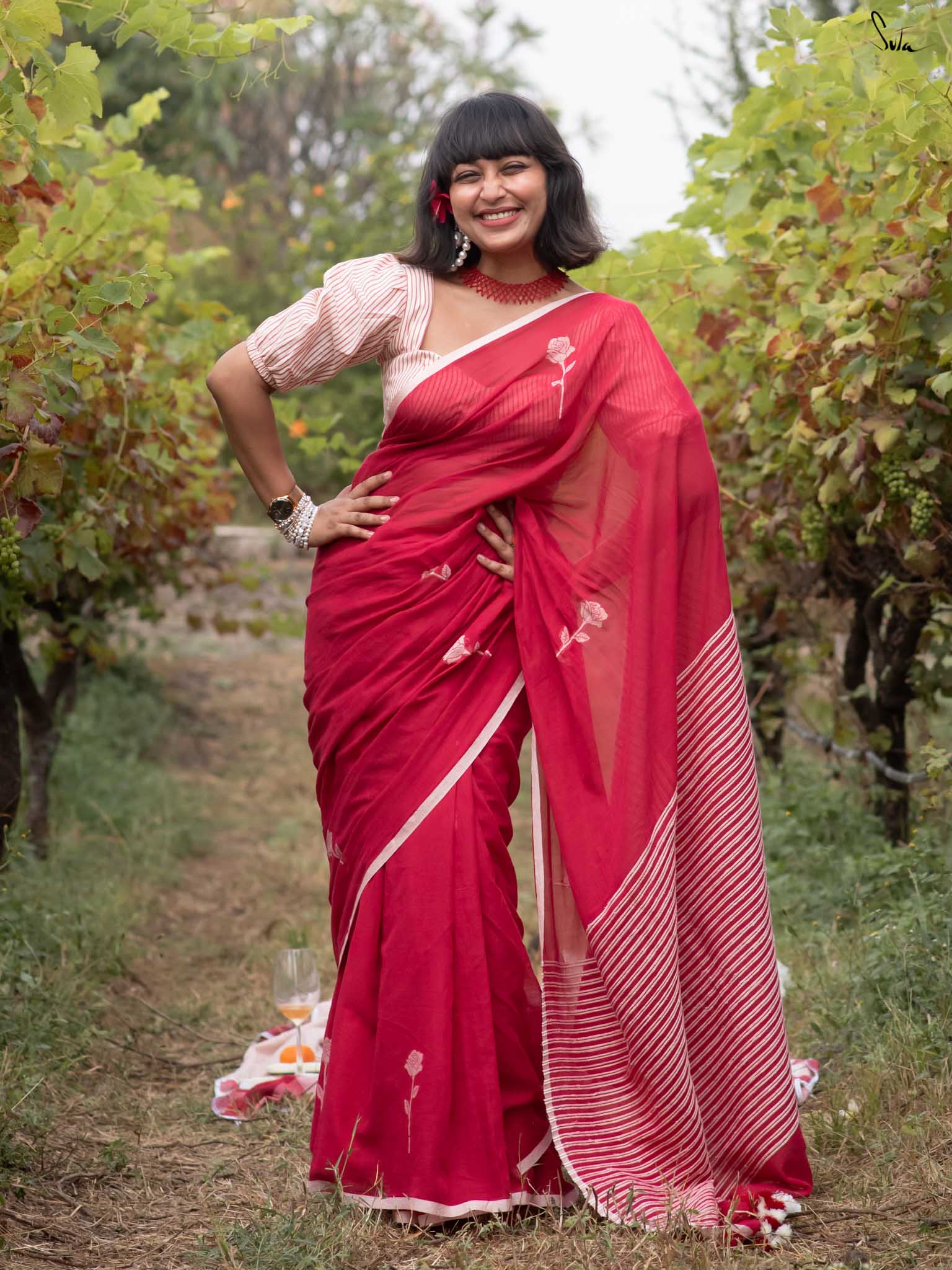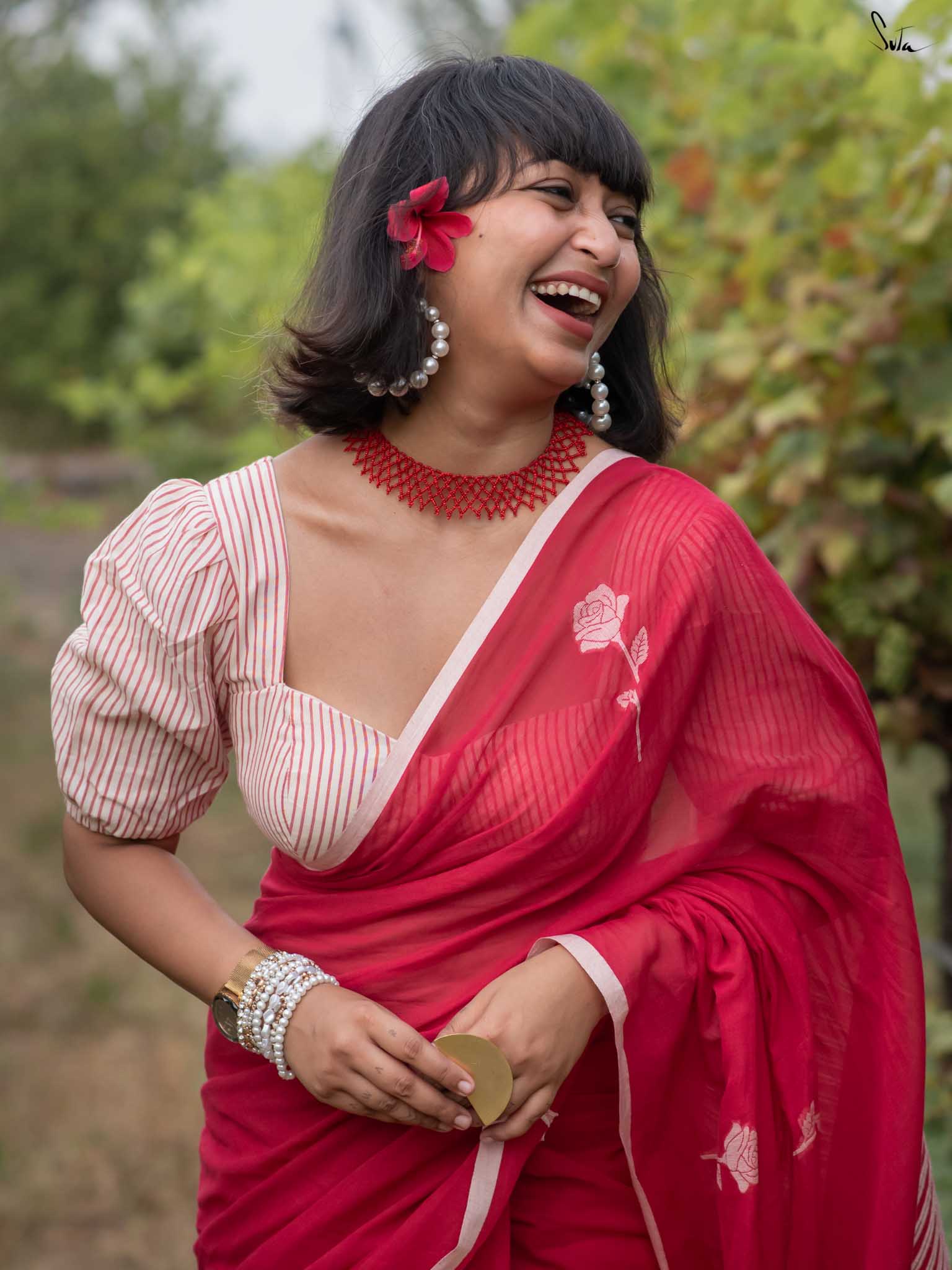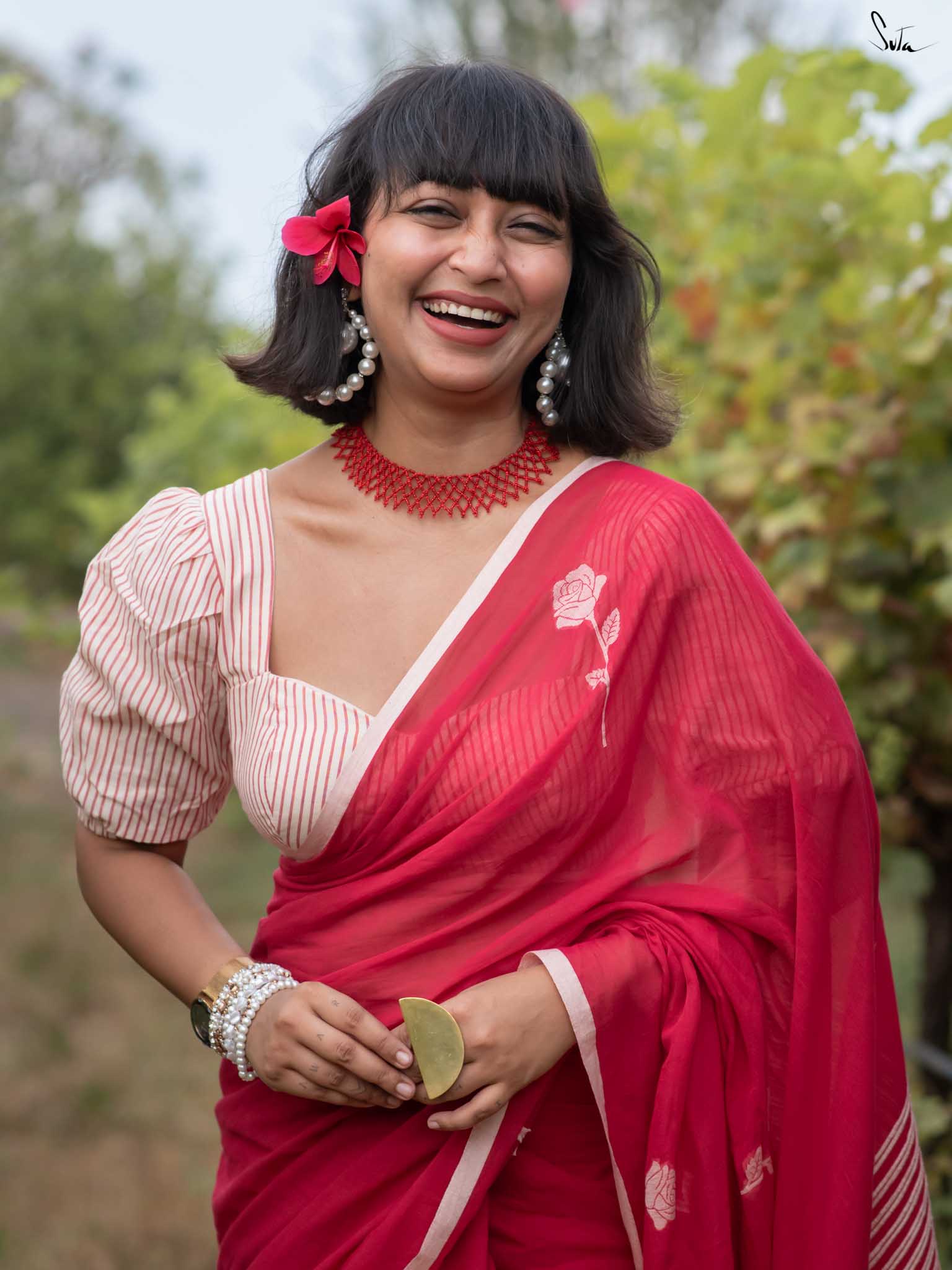 Roses ki Baarish is a mesmerizing red saree that captures the soul of love, purity, and passion. Delicately woven rose motifs bloom across the smooth mul cotton fabric, like whispers of heartfelt emotions woven into every thread. The khesh stripes on the pallu cascade like poetry, enchanting every gaze they meet. This saree comes with a matching white-and-red striped blouse piece attached.