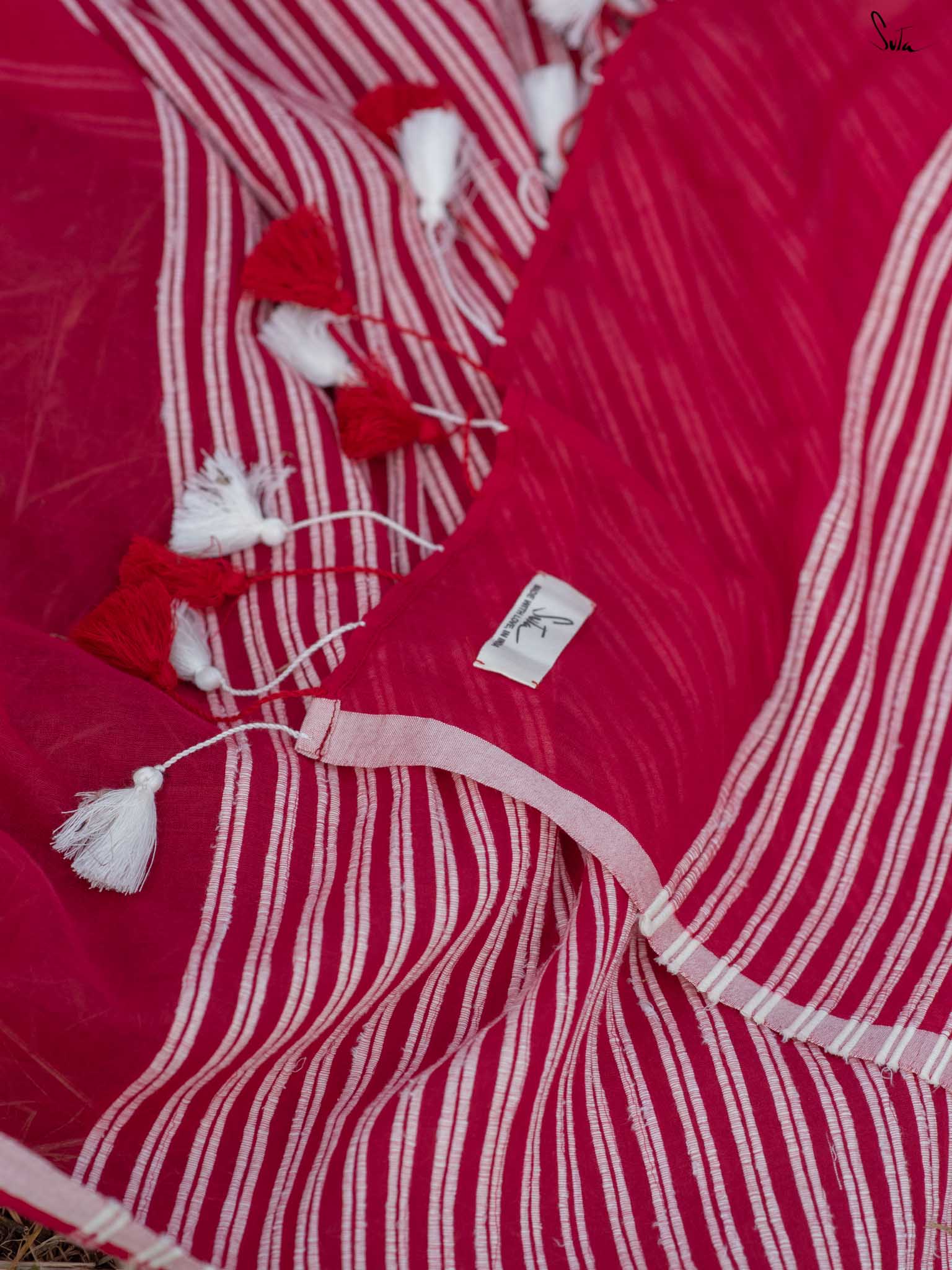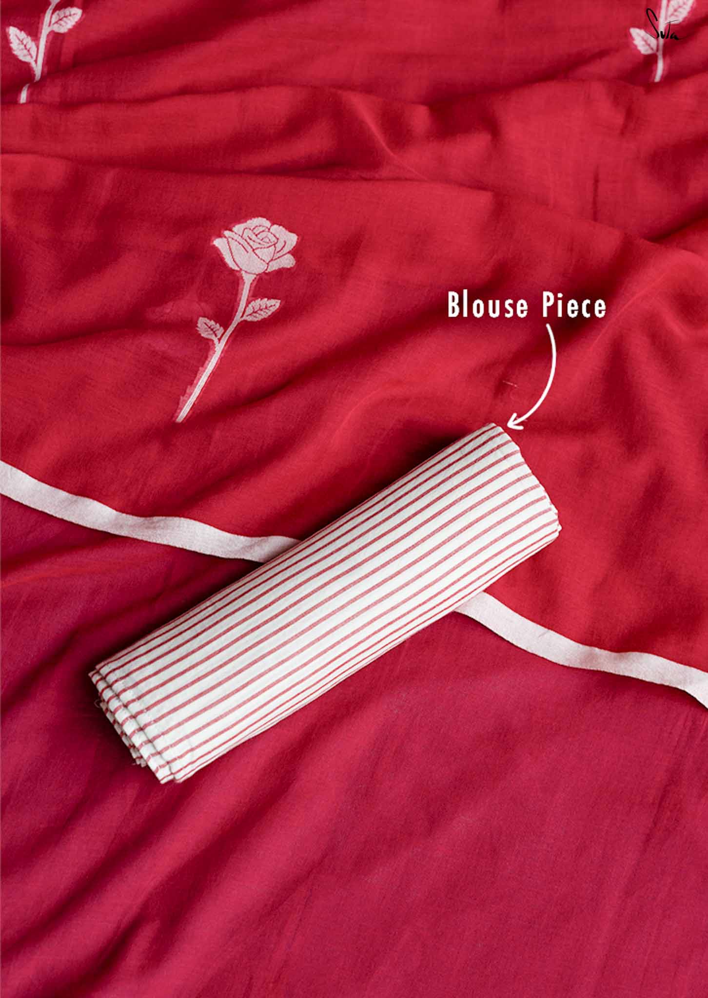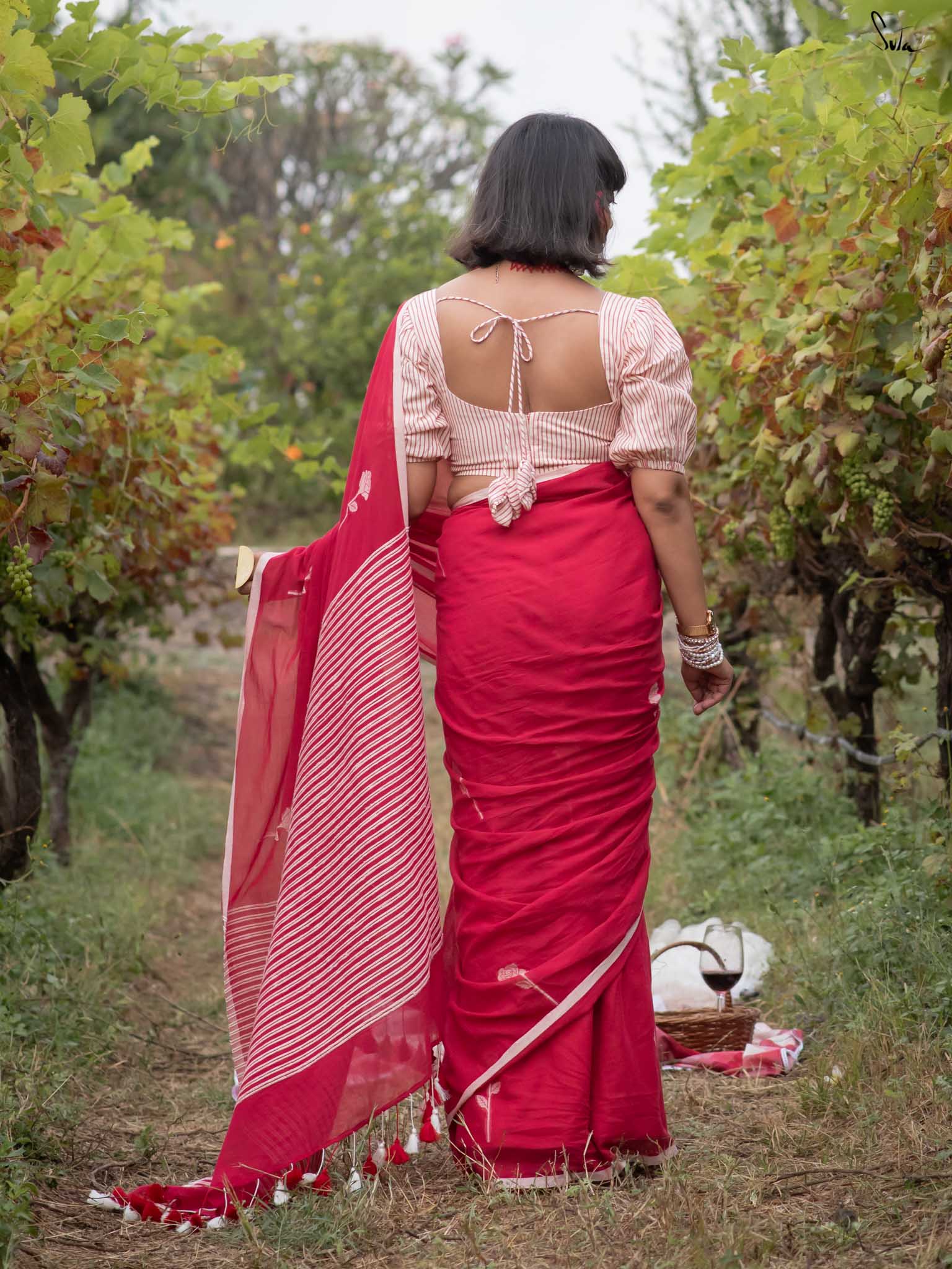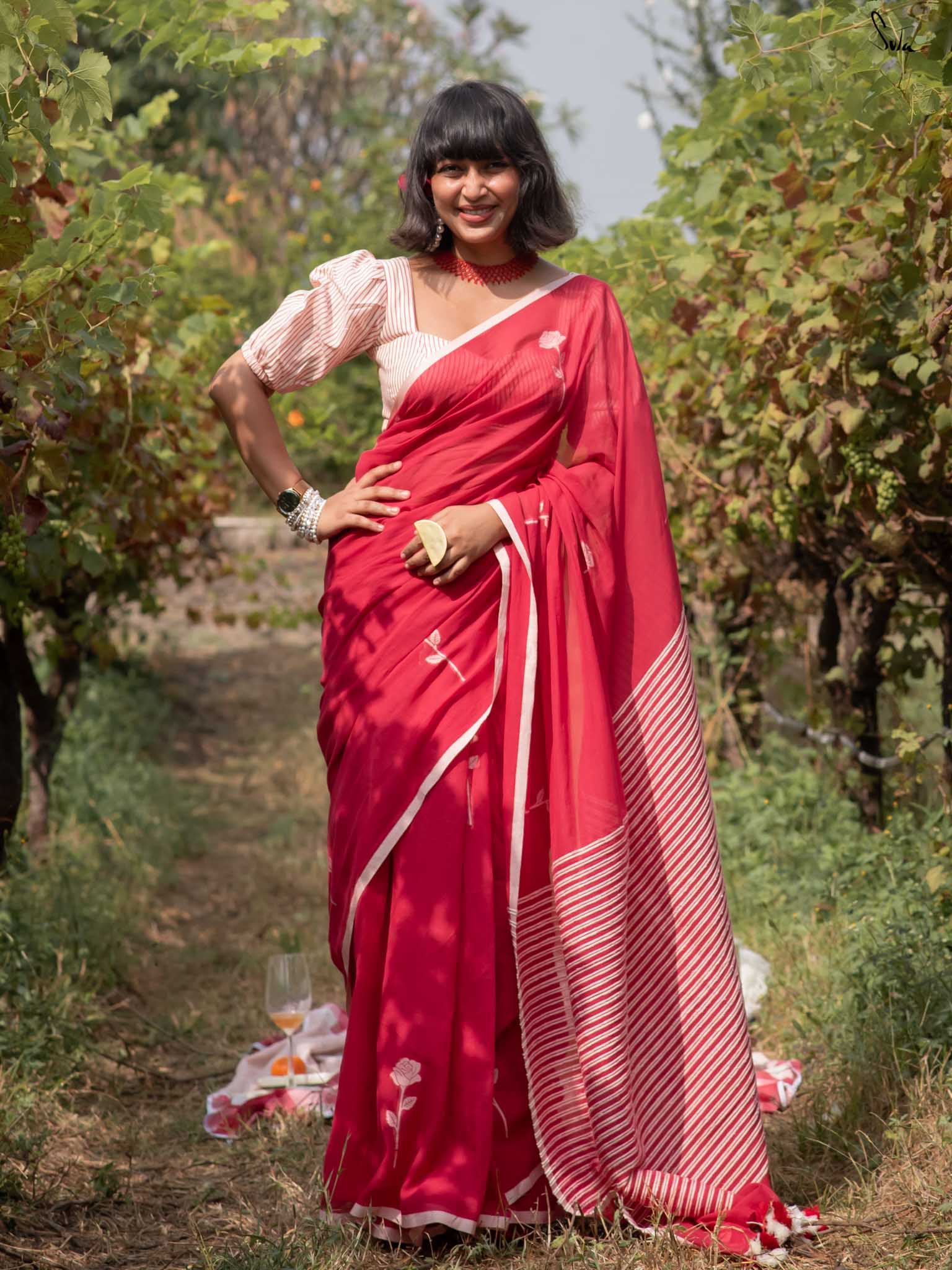 Roses ki Baarish is a mesmerizing red saree that captures the soul of love, purity, and passion. Delicately woven rose motifs bloom across the smooth mul cotton fabric, like whispers of heartfelt emotions woven into every thread. The khesh stripes on the pallu cascade like poetry, enchanting every gaze they meet. This saree comes with a matching white-and-red striped blouse piece attached.