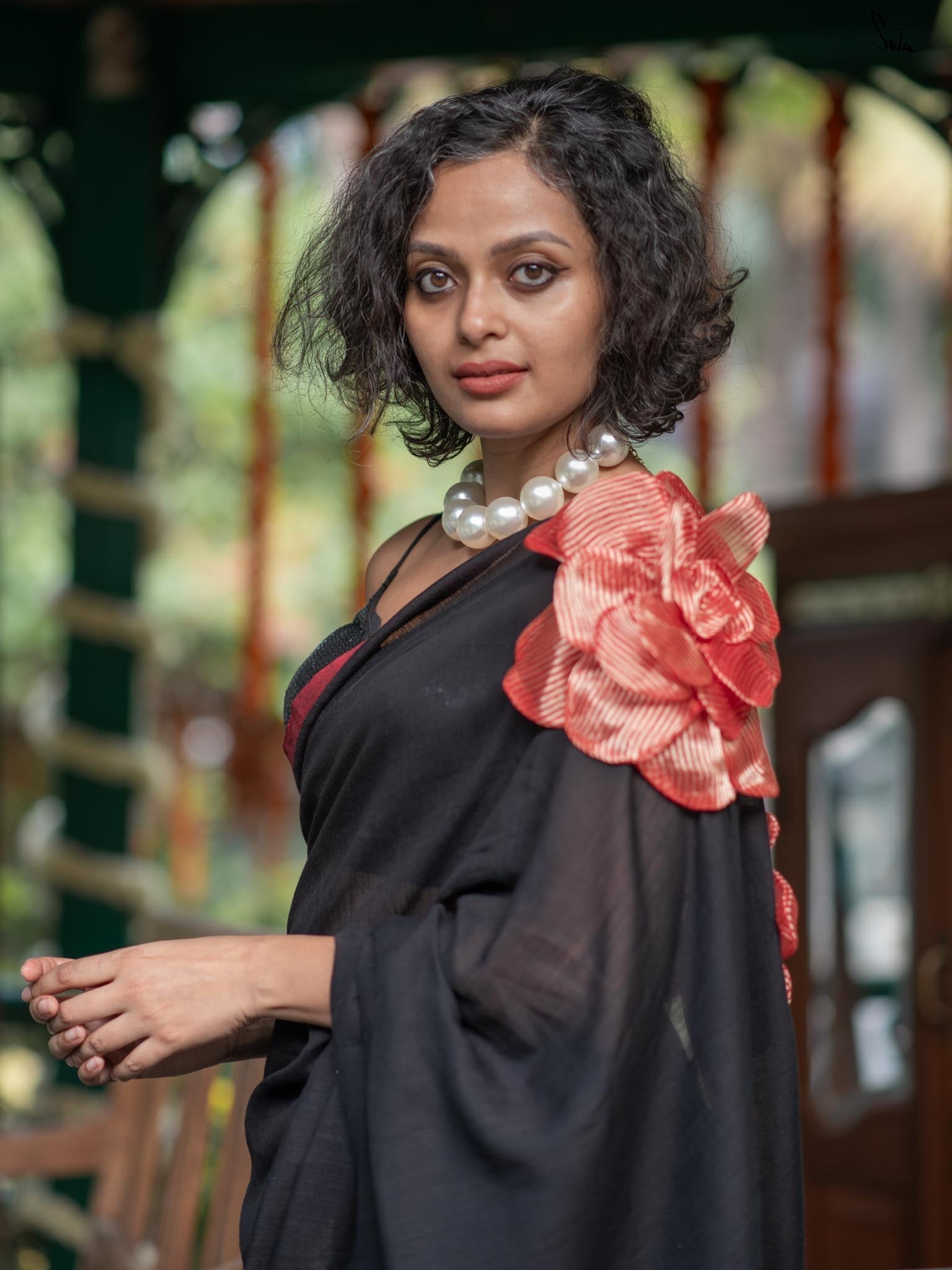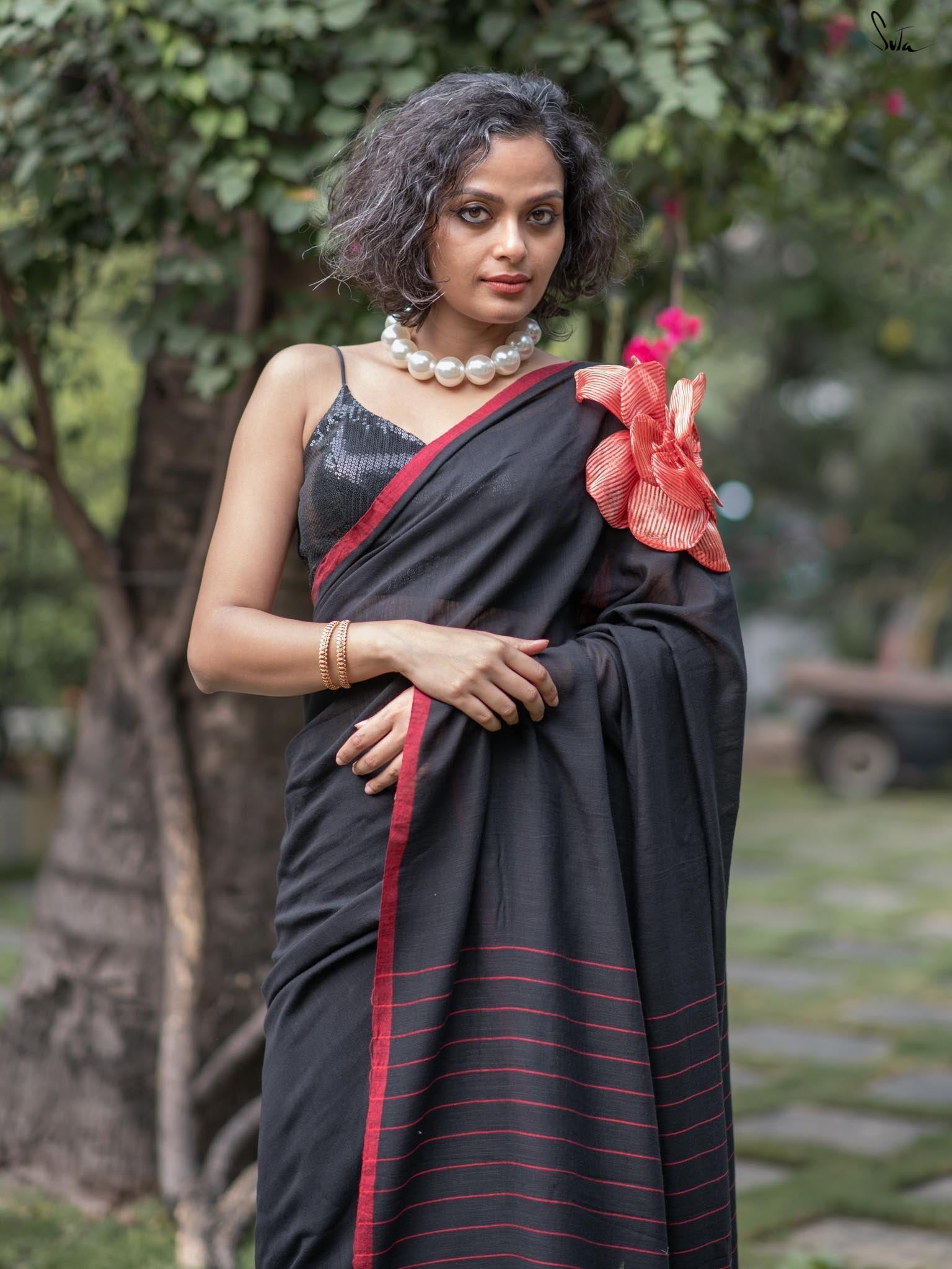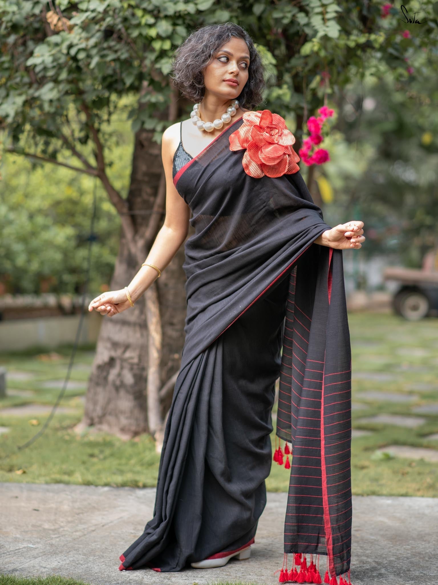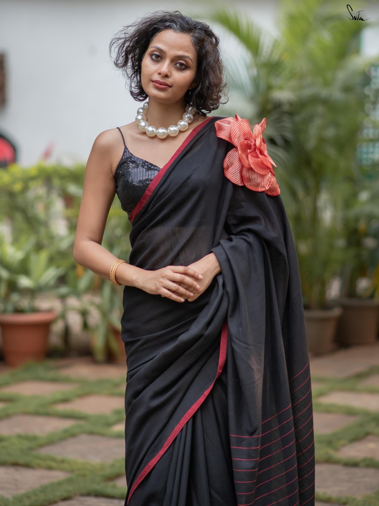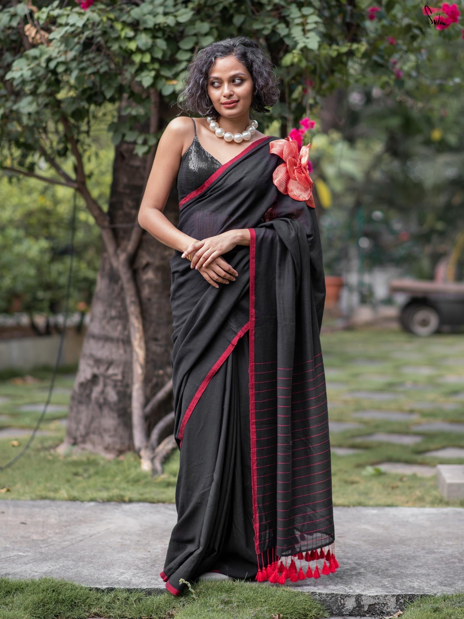 A perfect blend of style and elegance, Rosette Rhapsody is a stunning black saree crafted from luxurious Mul-Viscose-Slub. Its delicate red border and exquisite 3D silk tissue flower elevate this saree to pure opulence. Ideal for evening parties, Rosette Rhapsody lets you unleash your inner style queen and make a dazzling entrance wherever you go.