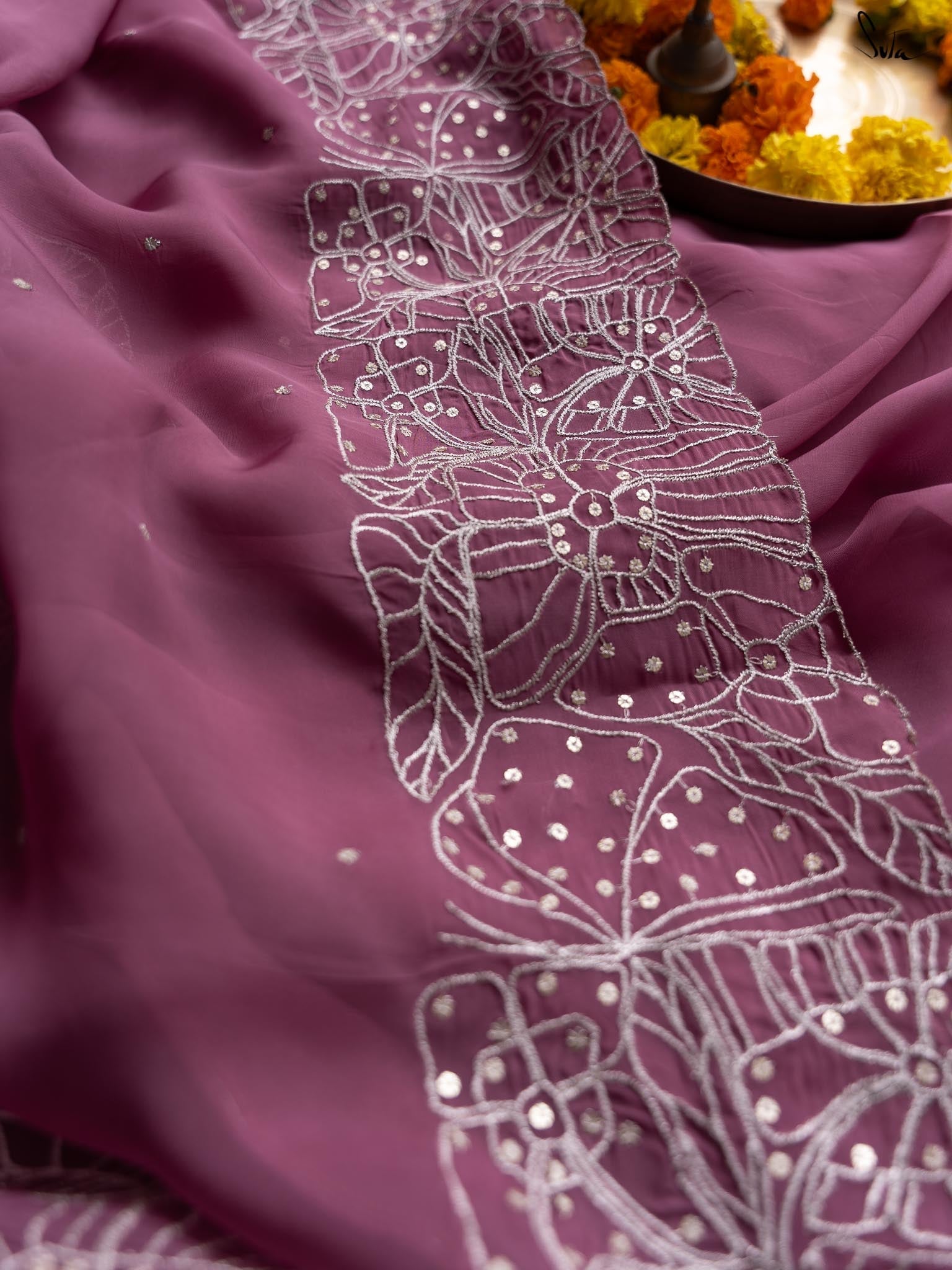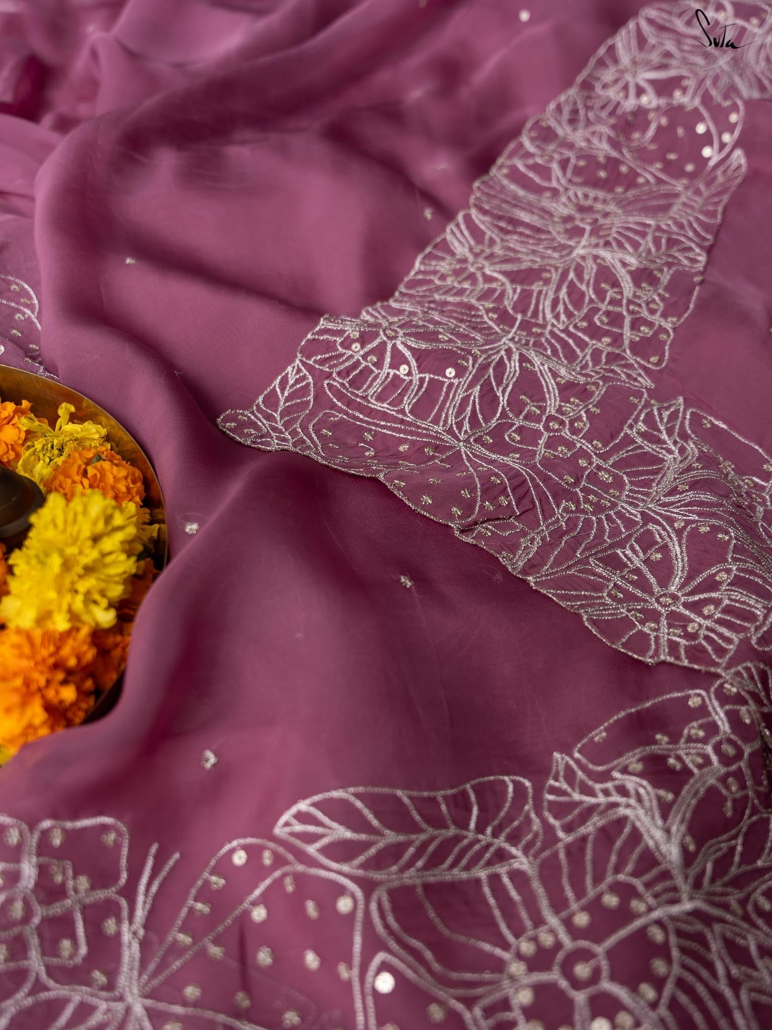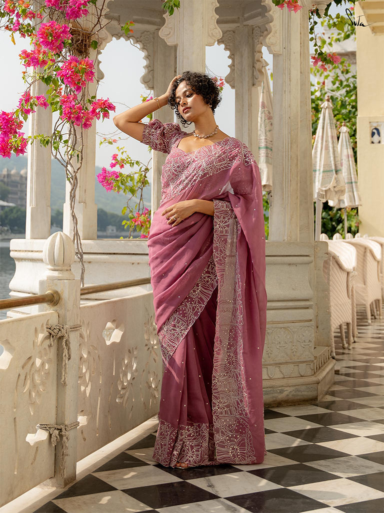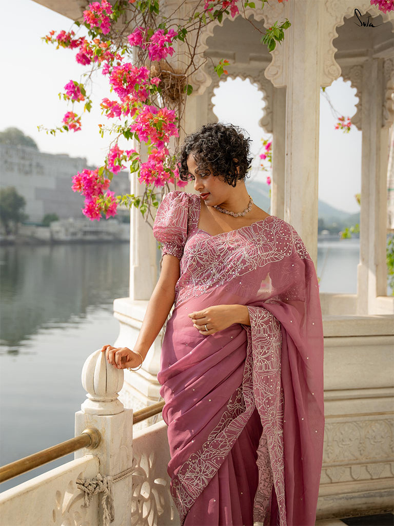 This lavender saree is crafted from viscose organza fabric with intricate silver zari embroidery, creating a fractal of butterflies and flowers. Sequins dancing all over the saree are the optimal final touch.