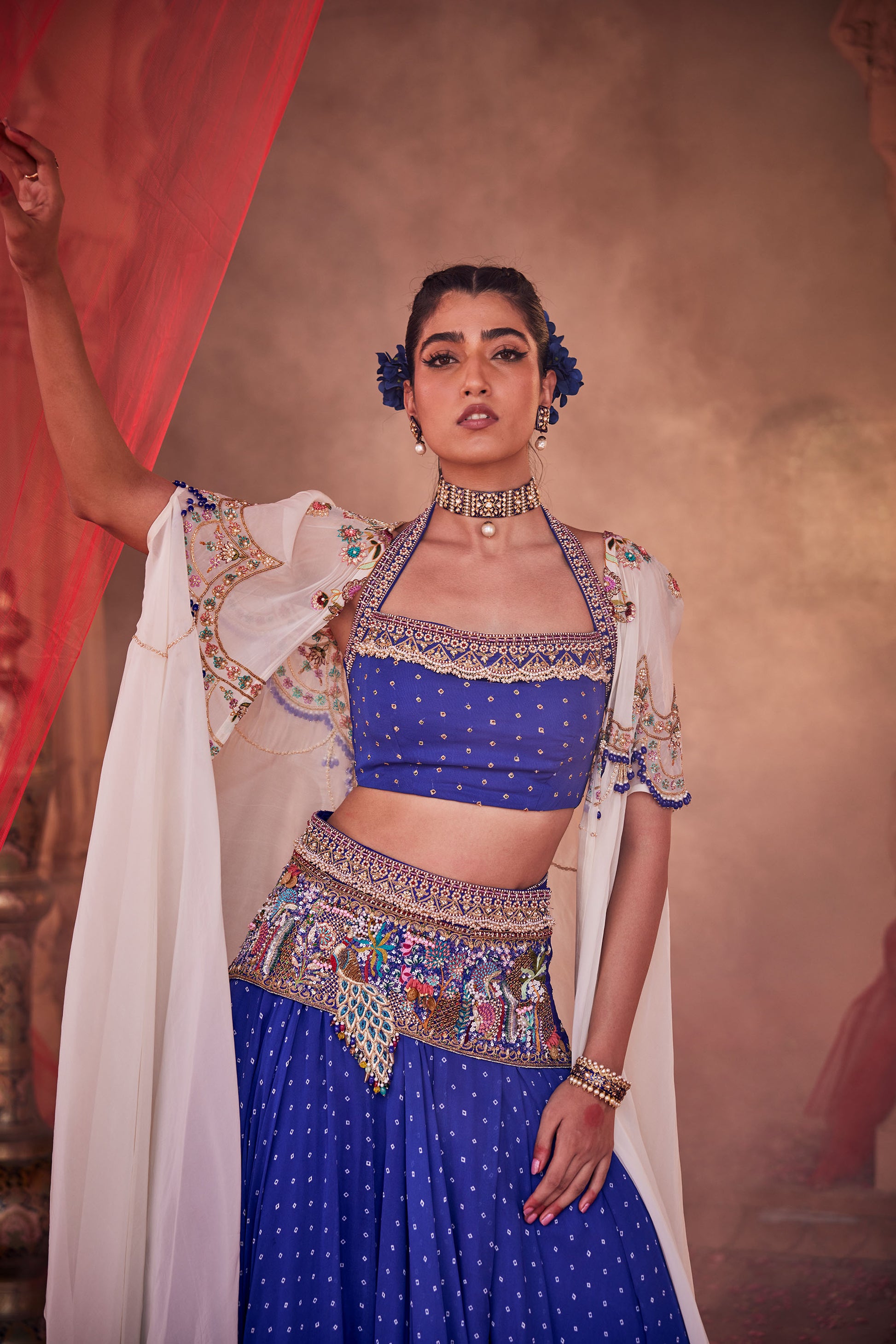 Grace and Elegance Personified: Royal Blue Lehenga and Bustier with Cape. This breathtaking ensemble is a perfect fit for those looking to make a statement at any formal event. The intricate threadwork embellishments on the georgette fabric add a touch of royalty to this beautiful attire. The cape adds an element of mystery and grace to the overall appearance. Perfect for those who want to stand out in a crowd, the Royal Blue Lehenga and Bustier with Cape is a must-have for the fashion-conscious individual.