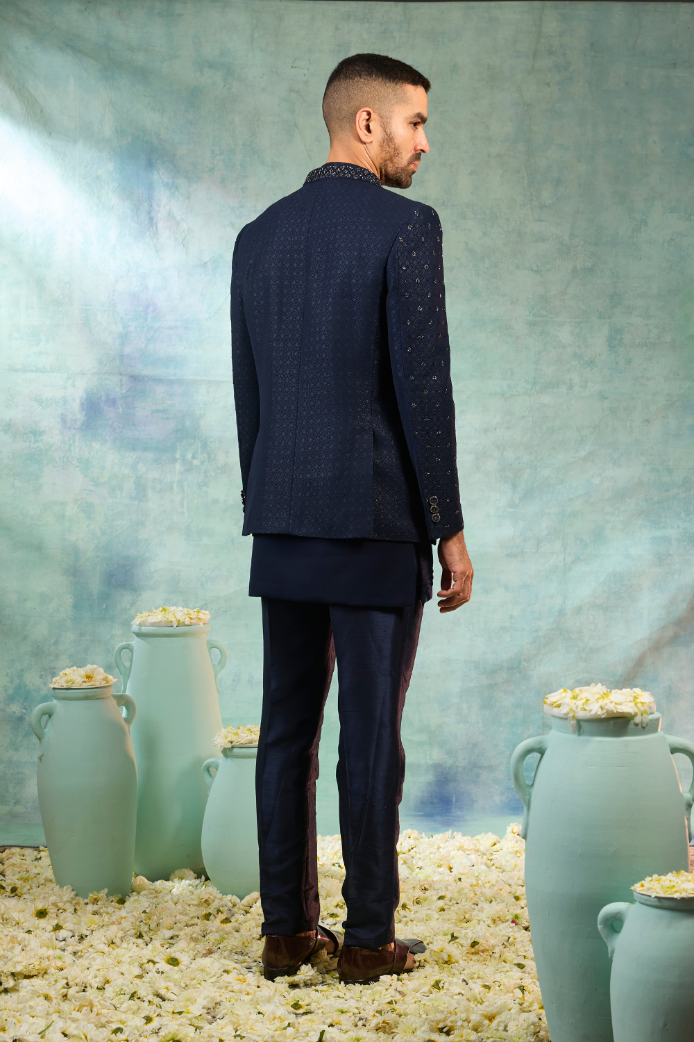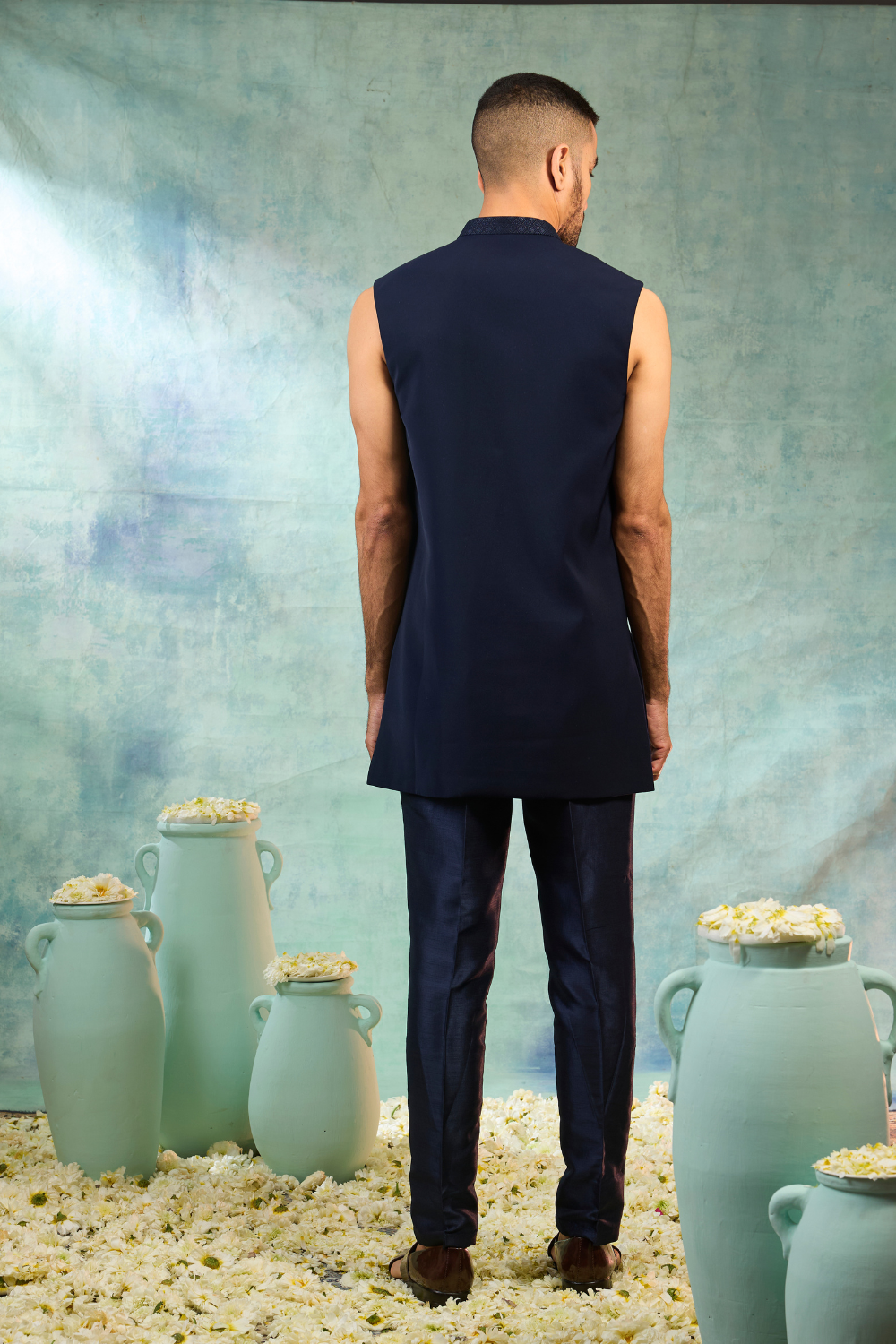Elevate your traditional look with the royal blue silk Indo-Western featuring kurta and jacket, adorned with silver hand cut dana work. Paired with matching pants for a complete look.