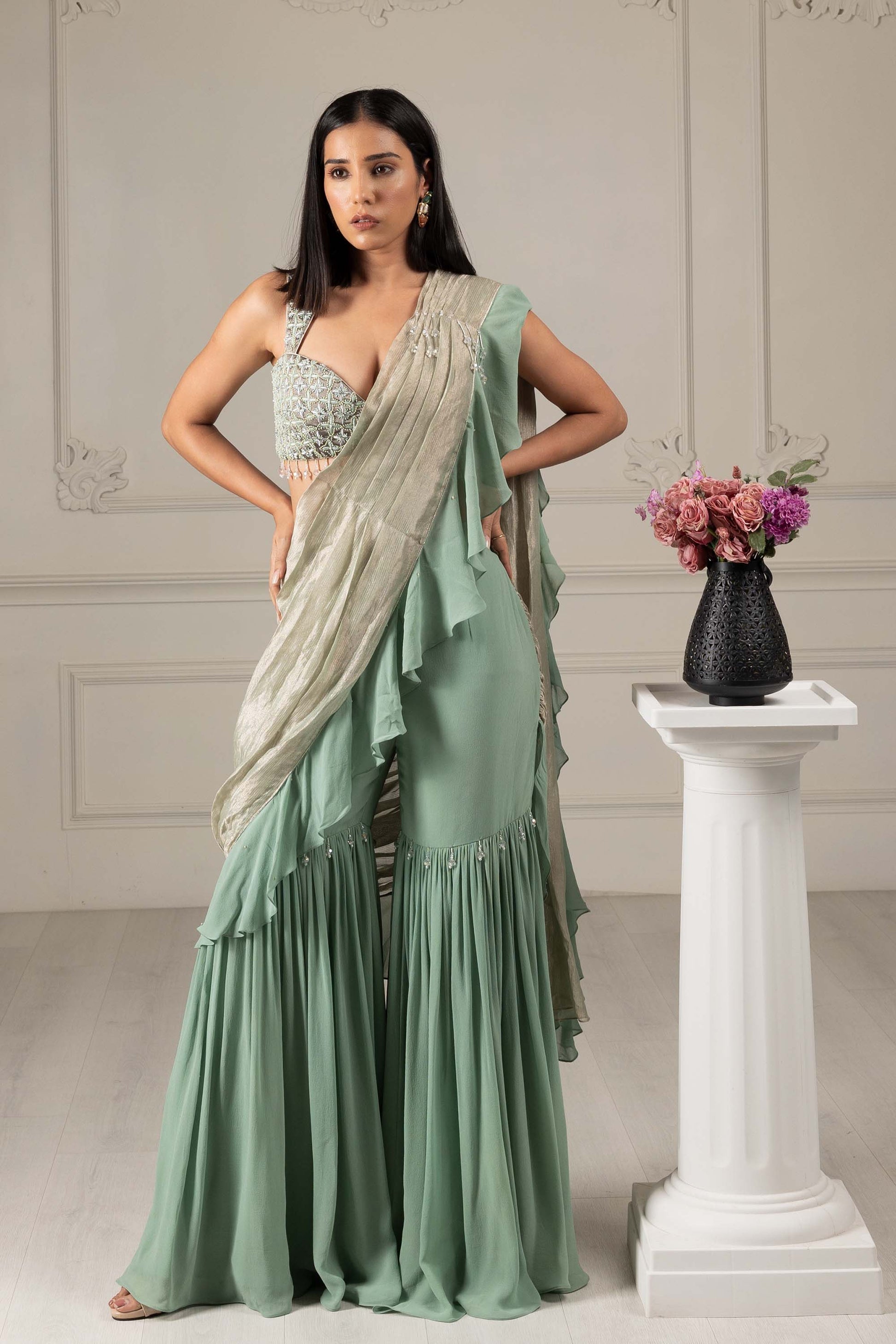 Featuring Tea green silk georgette embroidered blouse with silk georgette sharara and organza drape pallu