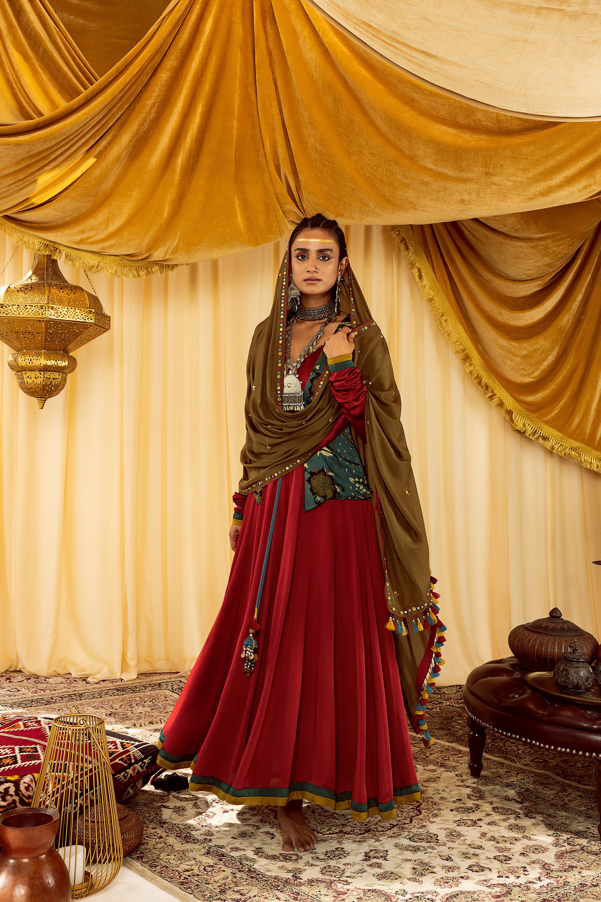 Dark rust Anarkali with mirror work detail on the neck, is paired up with a hand blocked waist coat with tassel detail& a mehendi green duppatta embellished with mirrors & tassels.paired up with a churidaar