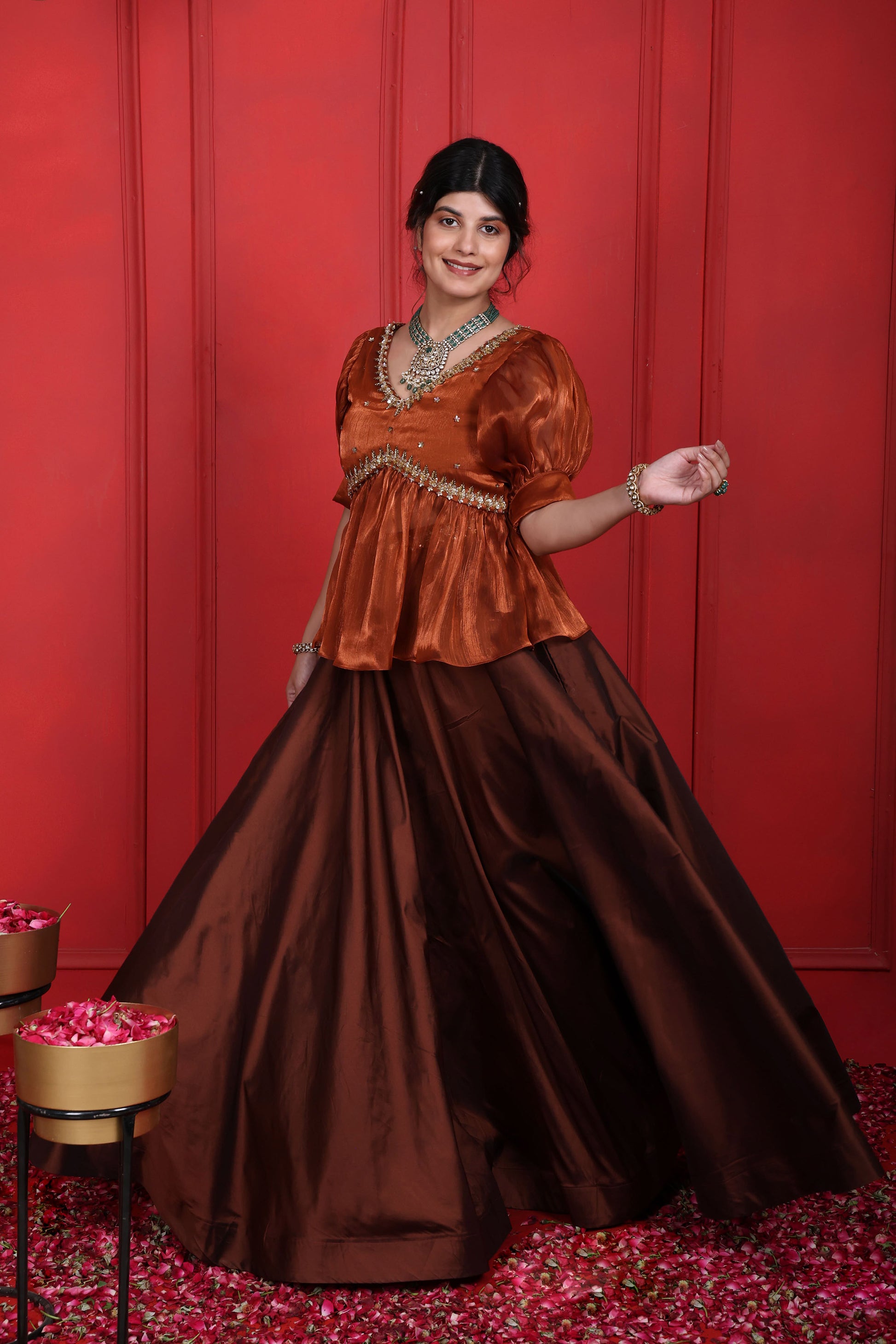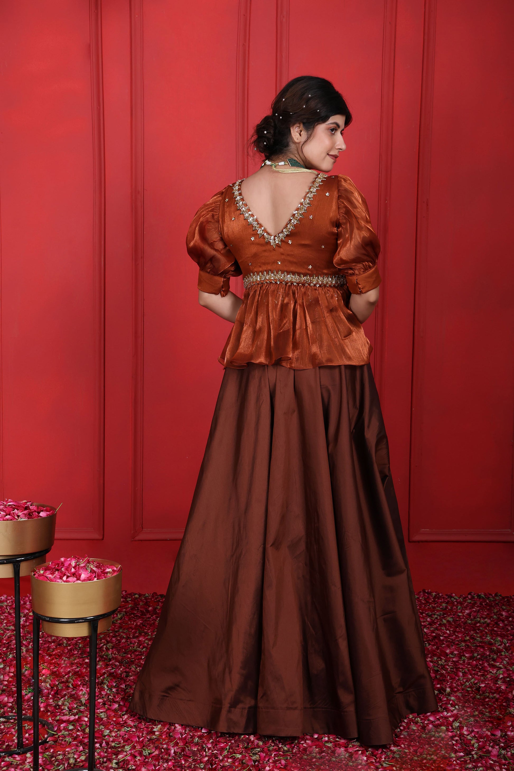 Rust Brown & Brown Derby Peplum Blouse With Long Skirt