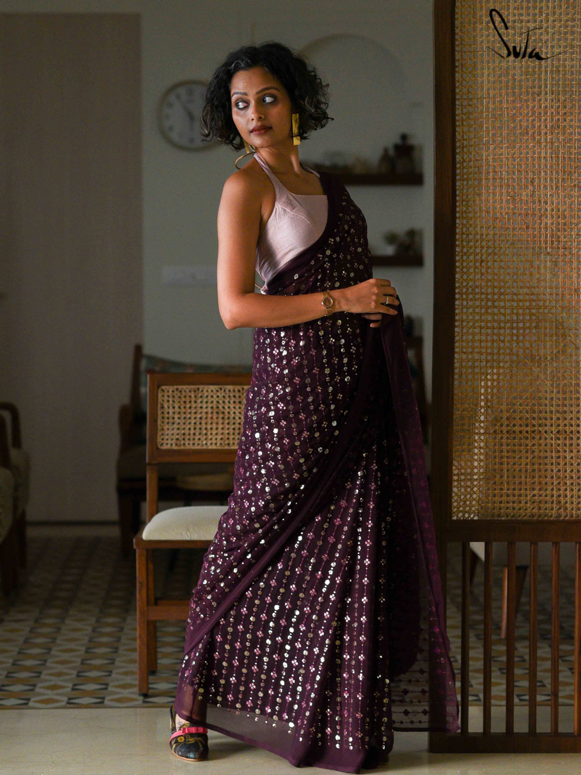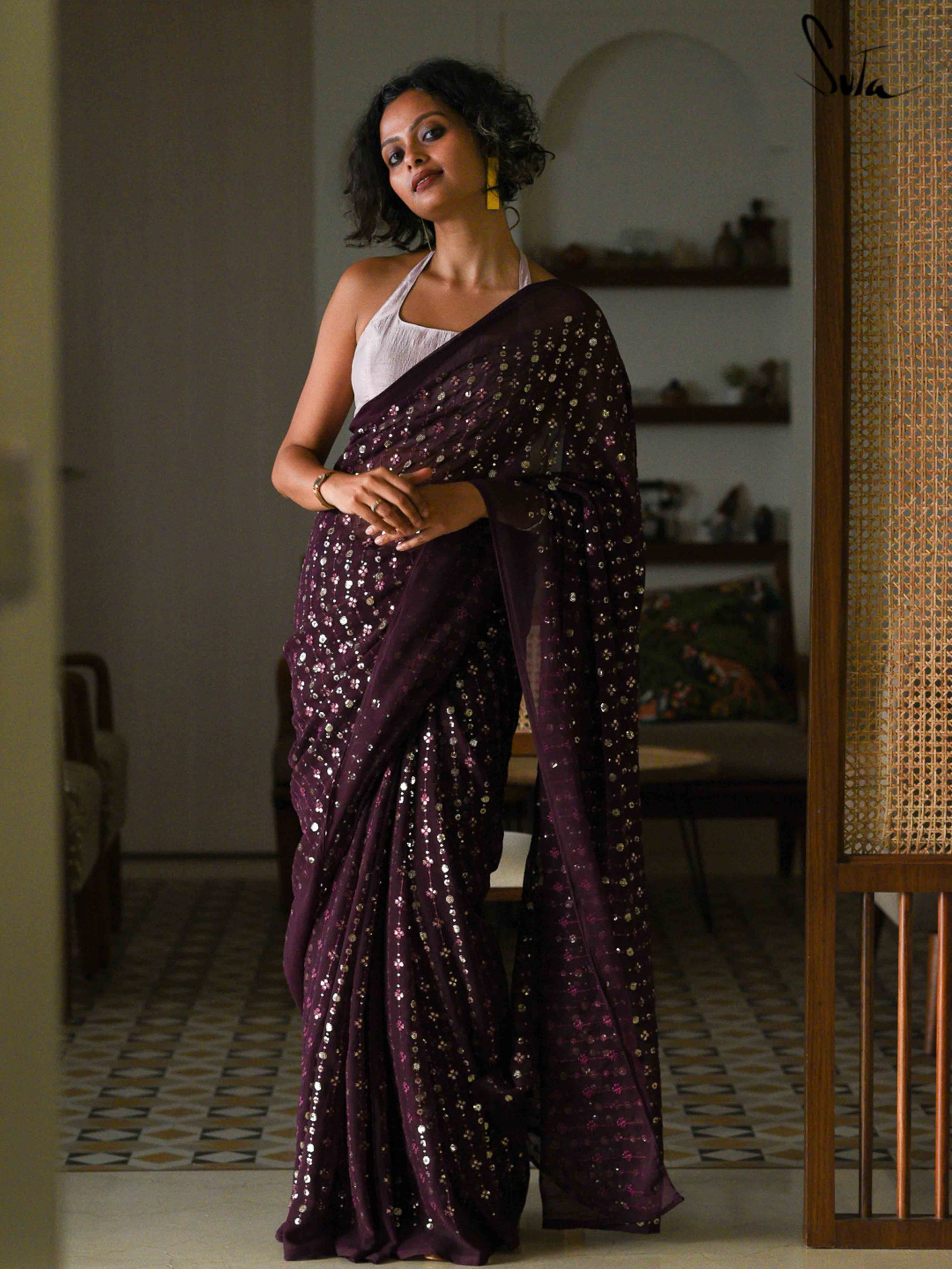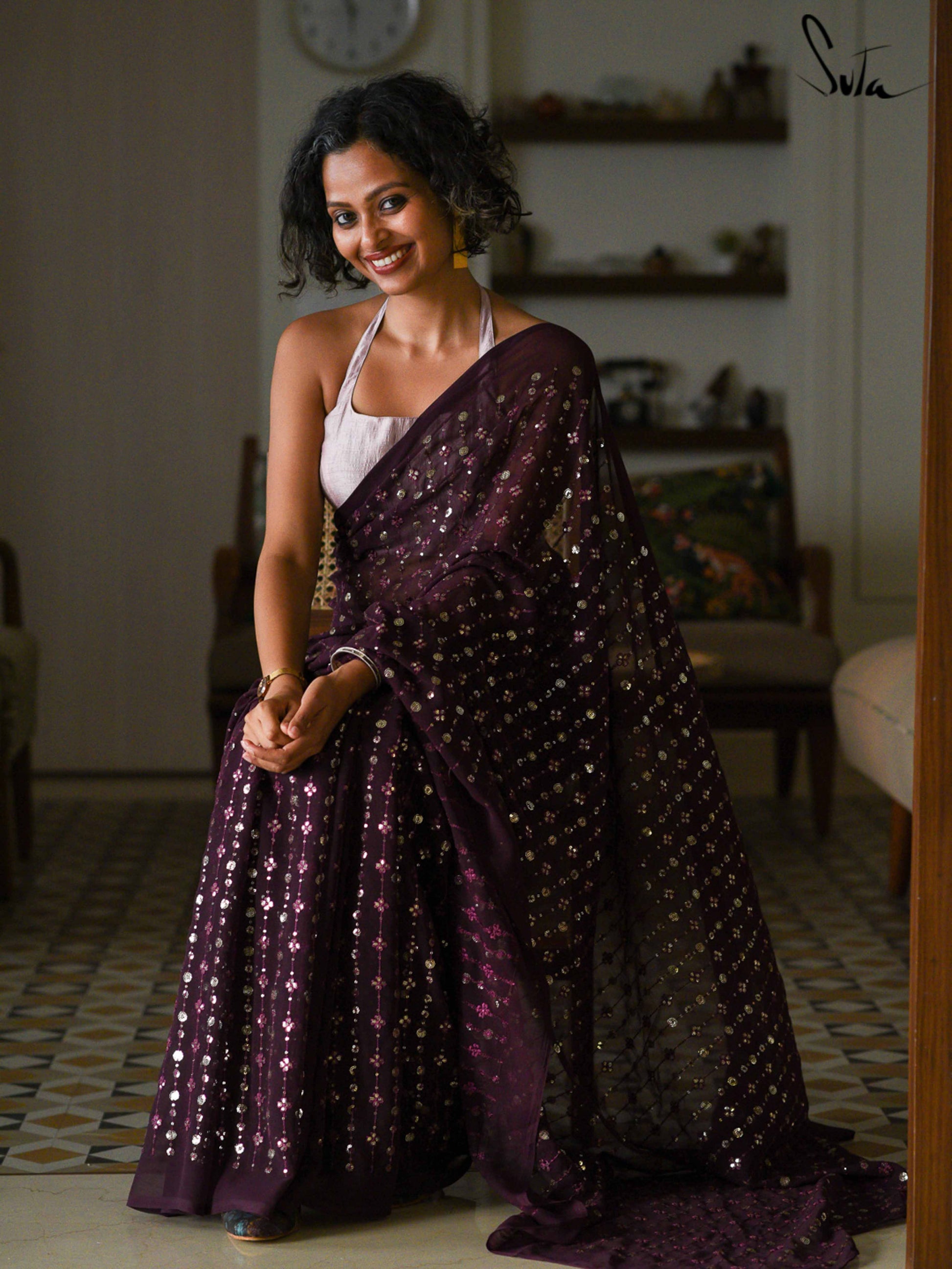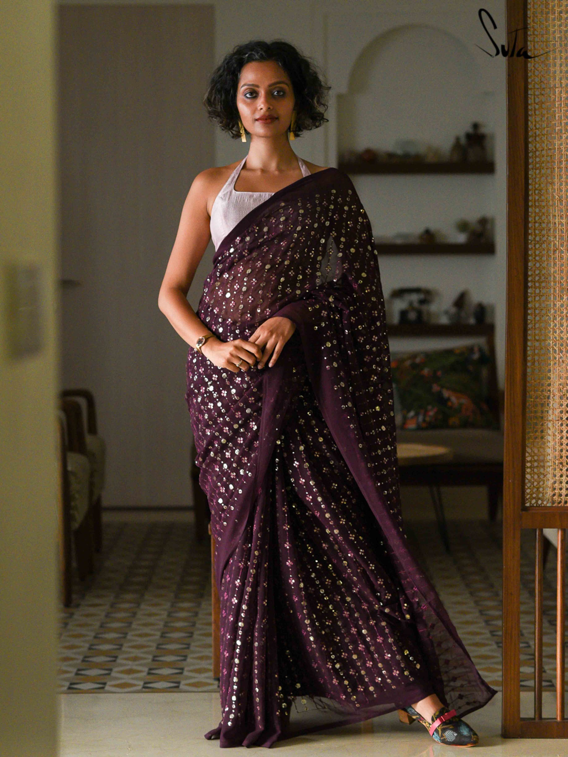 Georgette is a type of crêpe fabric that is sheer and lightweight, and has a dull, matte finish. In this saree, viscose fibres have been used to create the lightest and most effortless georgette.