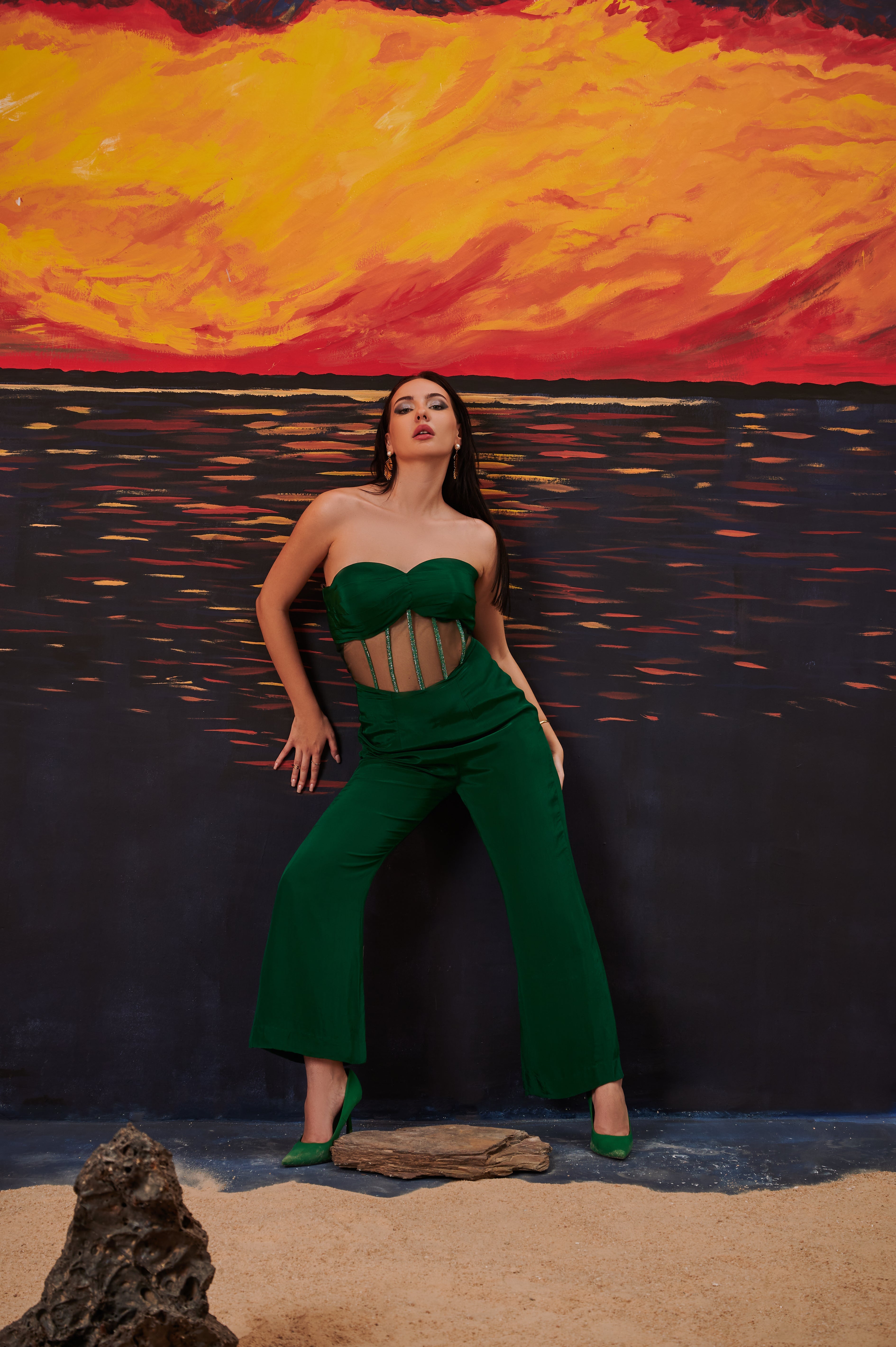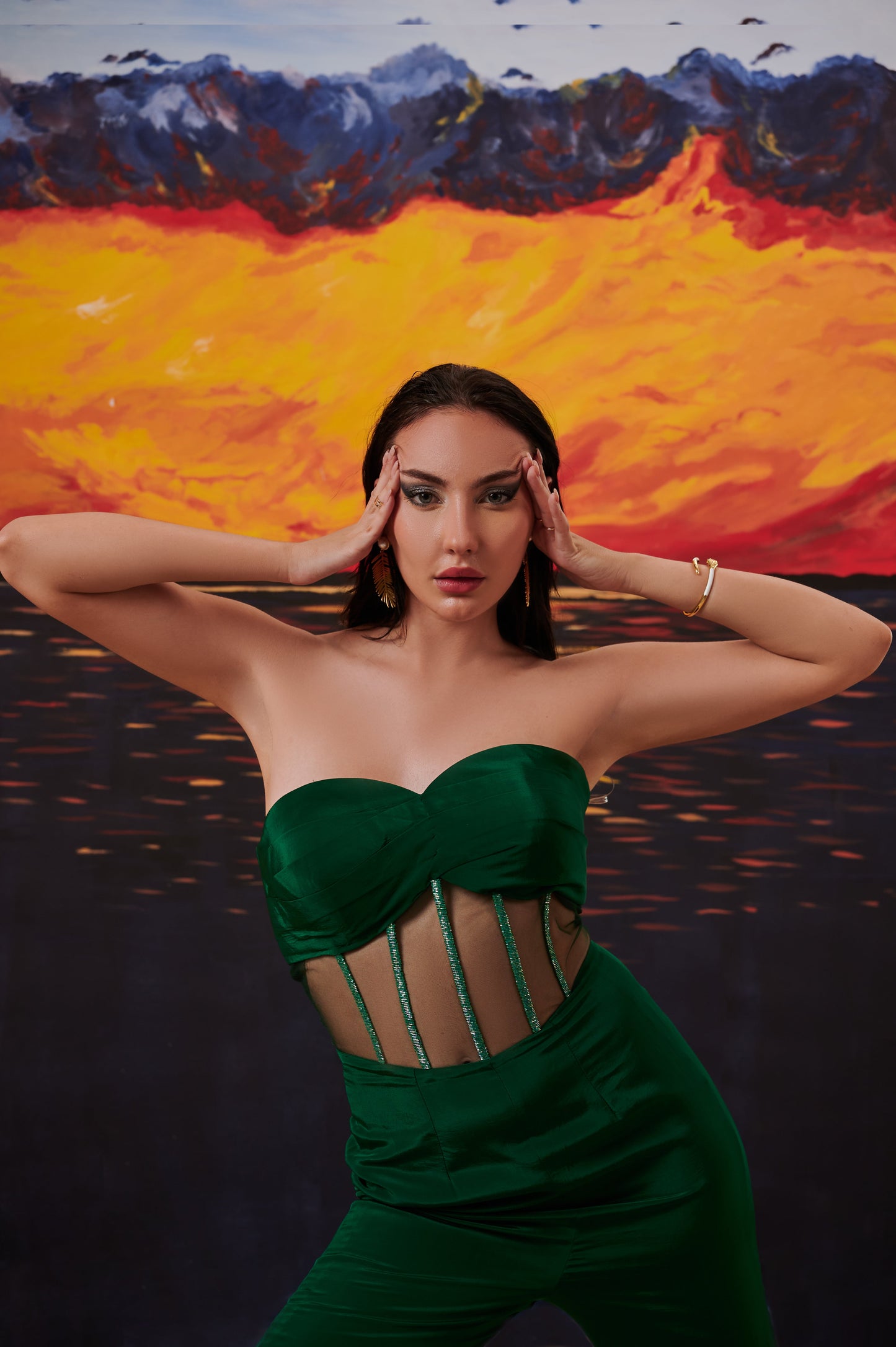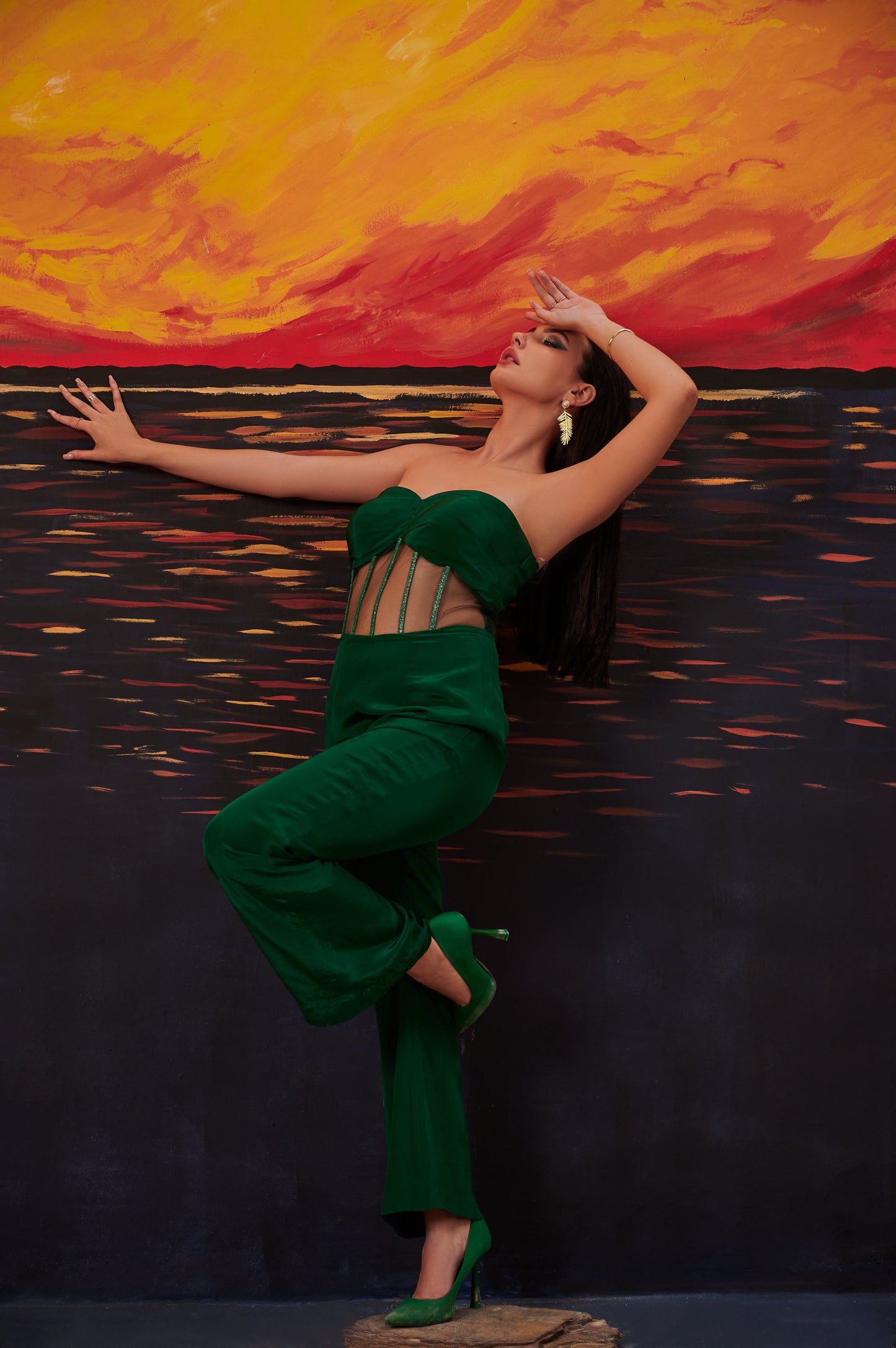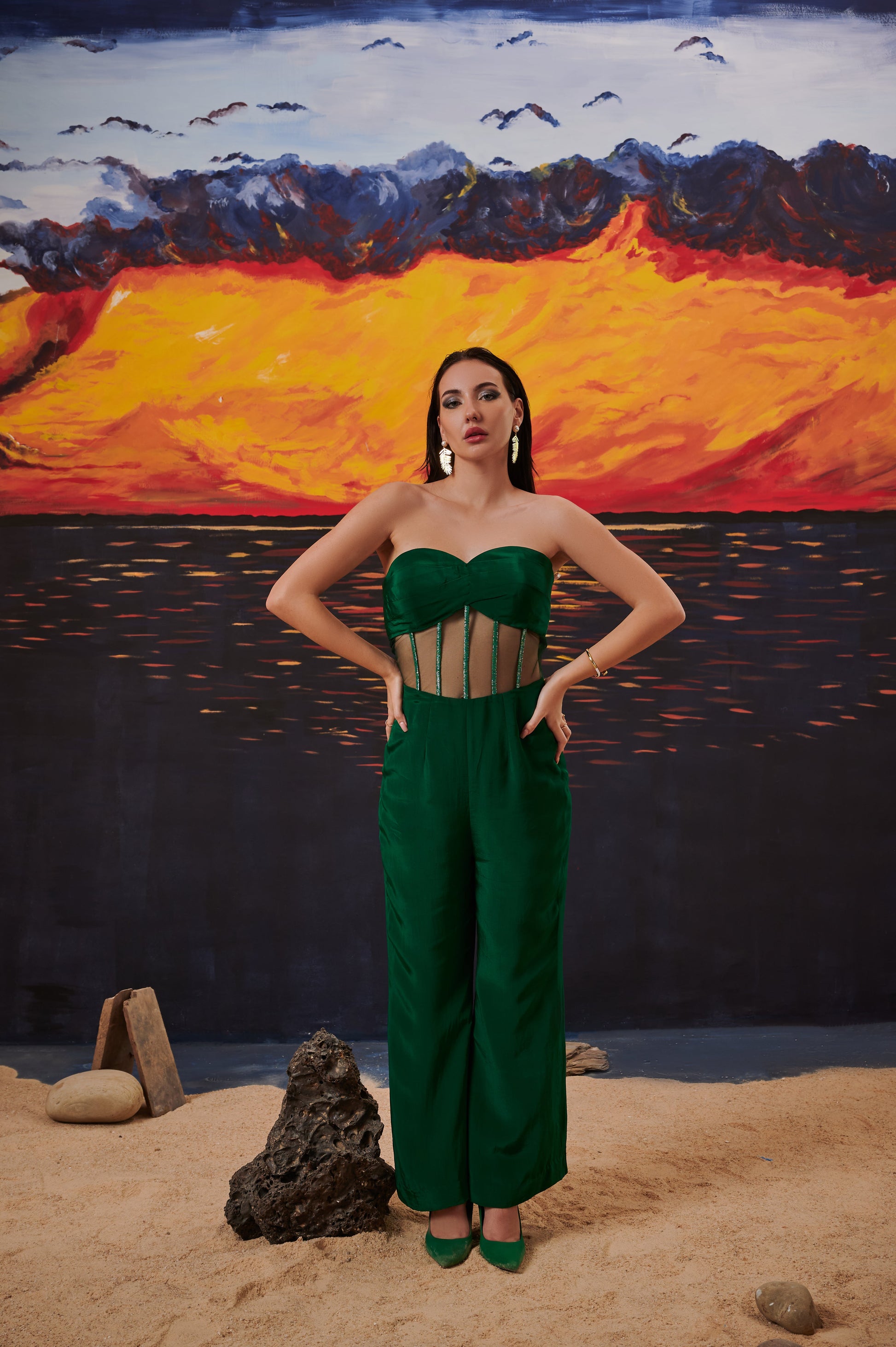 DETAILS- Tube jumpsuit with pleated sweetheart neckline and see through waist in net fabric featuring katdana handwork boning. Padded and Back zip.