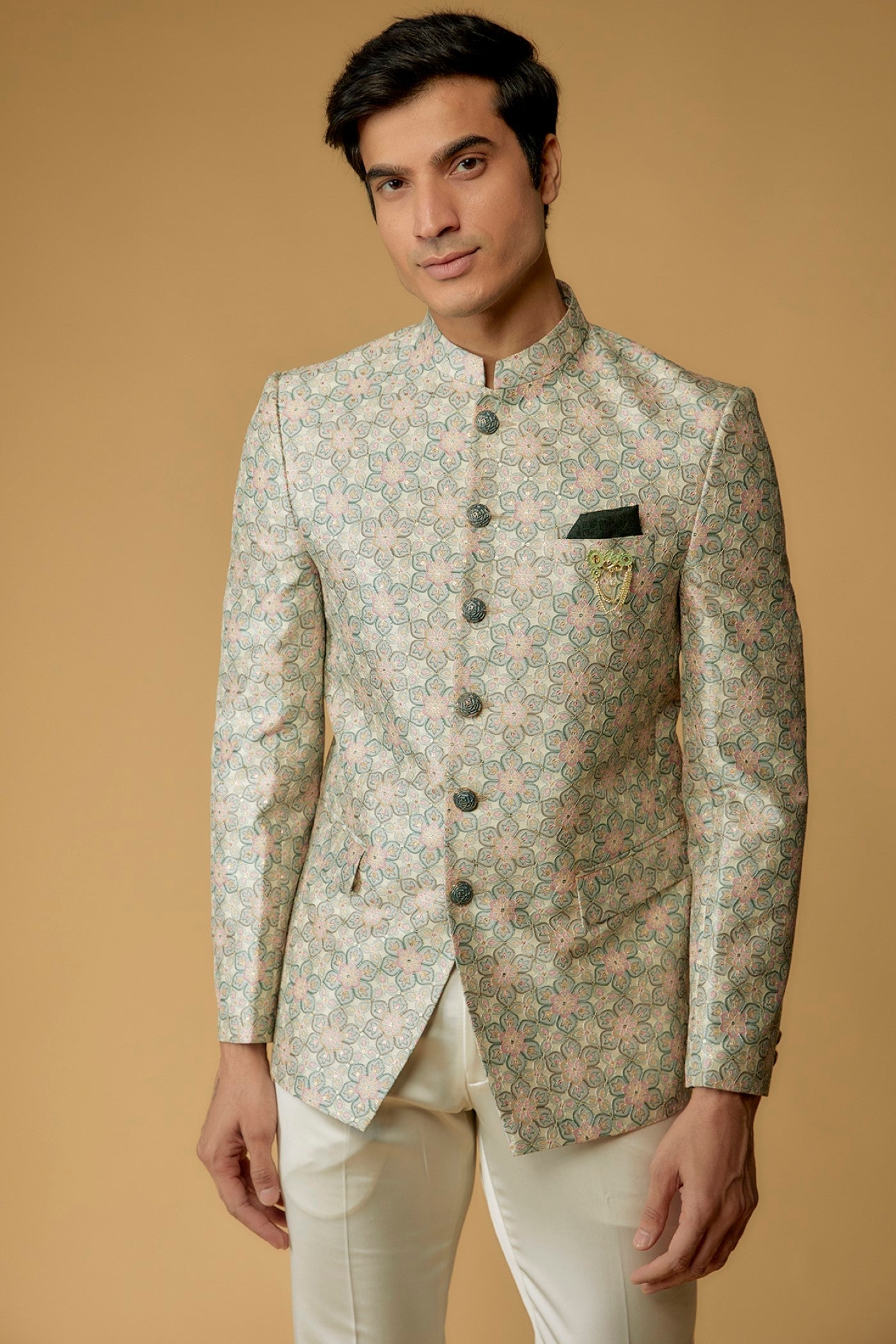 Sage Green Silk Printed Jodhpuri Bandgala Set