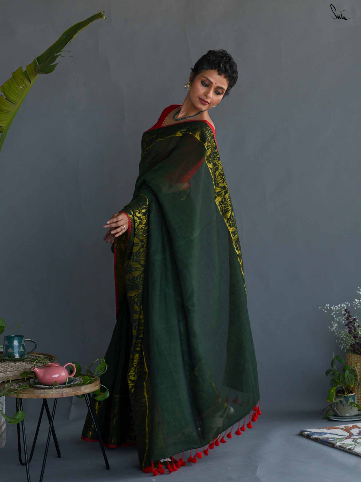 Cotton fabric dates back to some of the most ancient civilisations and it has a strong presence in the modern wardrobe as well. The softness and lightness of cotton combined with its strength and versatility makes it one of the most popular choices, especially for the Indian climate. We took this simple, elegant fabric and combined it with acrylic for that added sheen and voila! We love what we see and the saree falls so beautifully that it feels like second-skin!