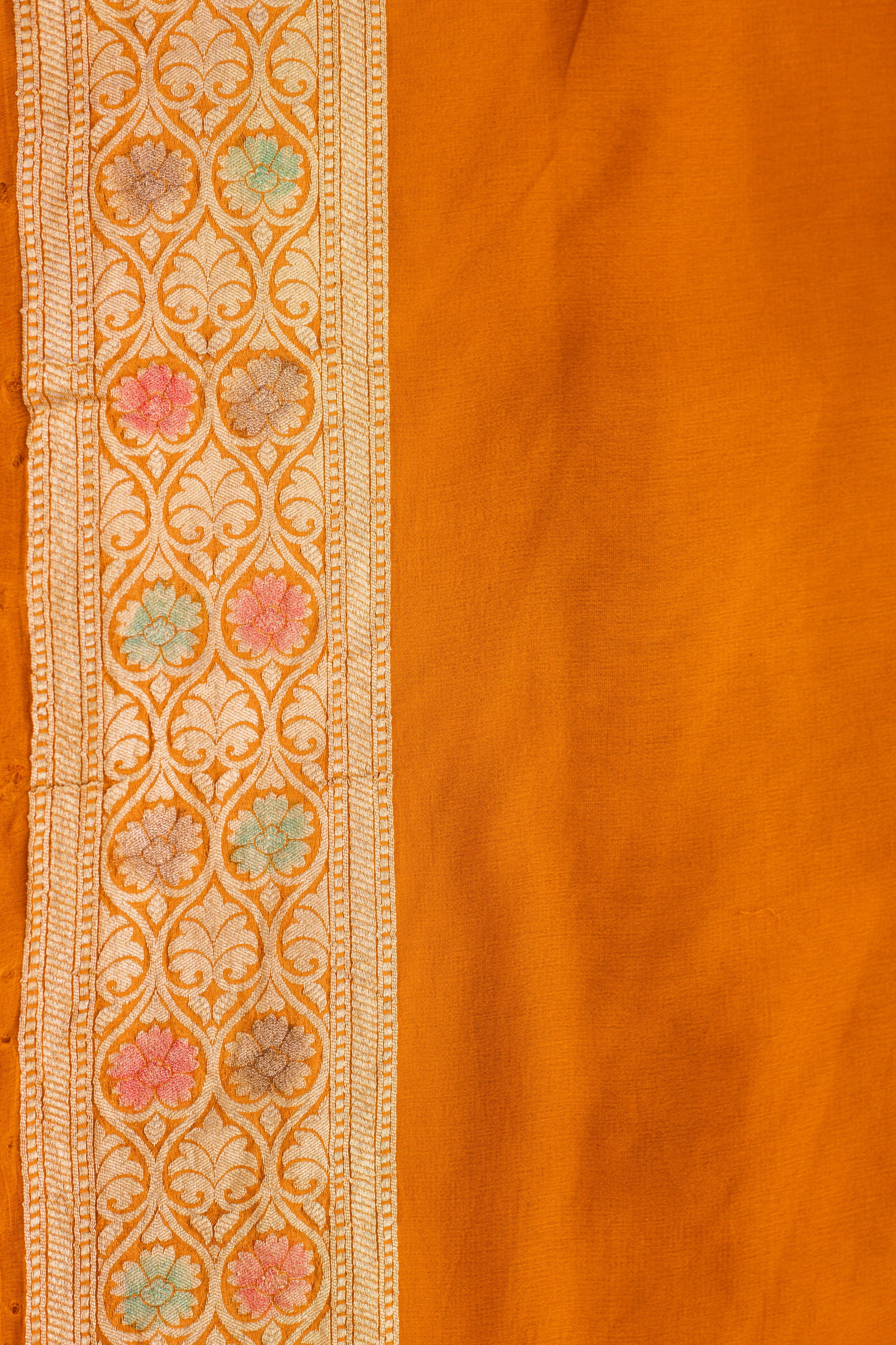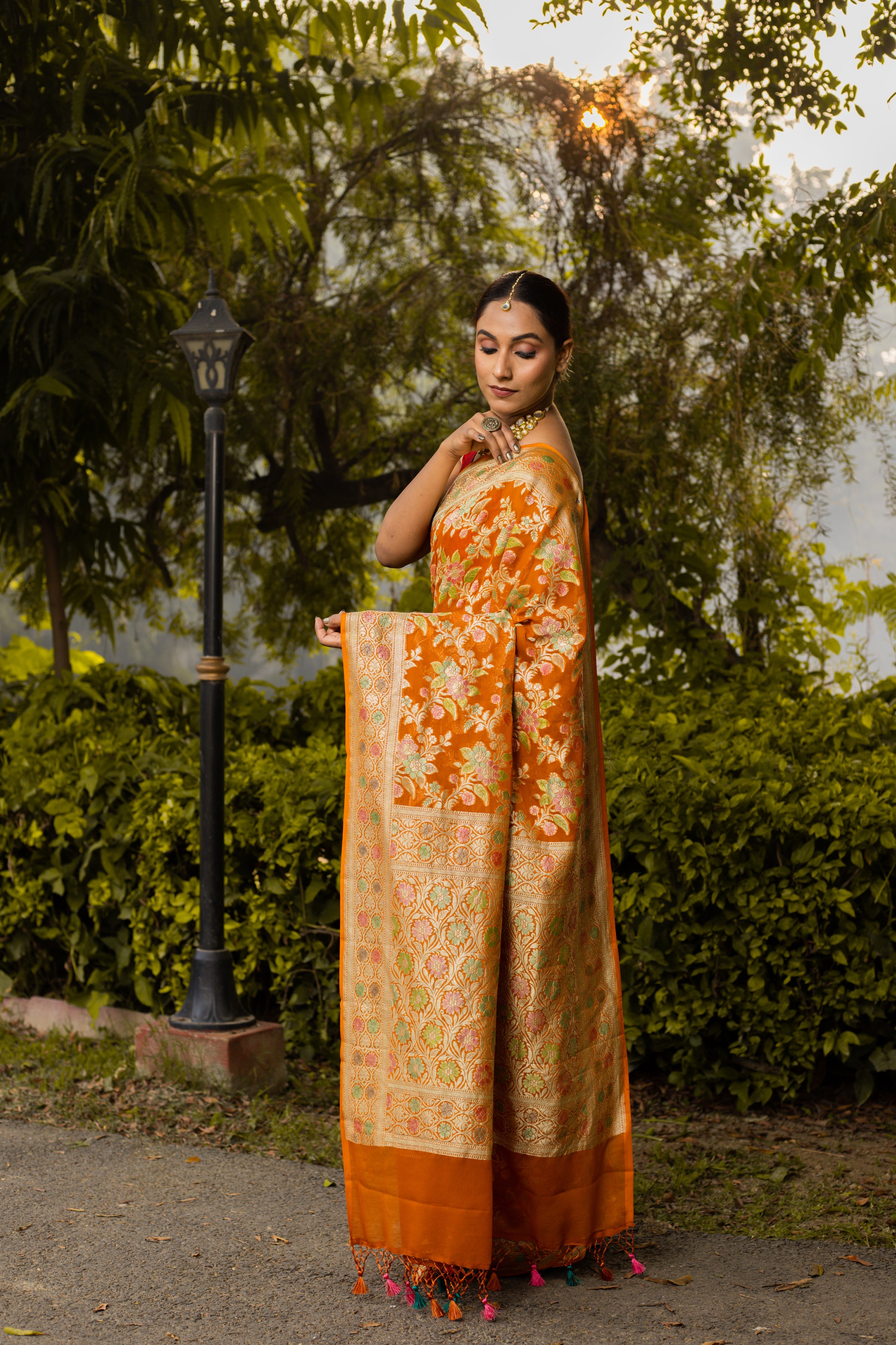 The Saree Georgette Khaddi Silk in Rust is a celebration of natural beauty and intricate detailing, making it an ideal choice for those who appreciate the richness of Banarasi handwoven sarees