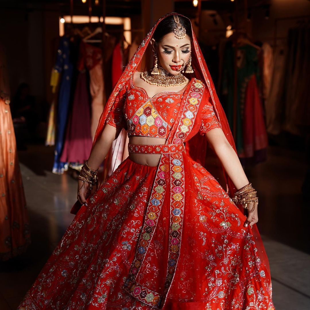 Featuring scarlet red lehenga with matching blouse and two tulle dupatta embroidered with colorful applique work would make you stand out among the crowd on you’re the Dday.