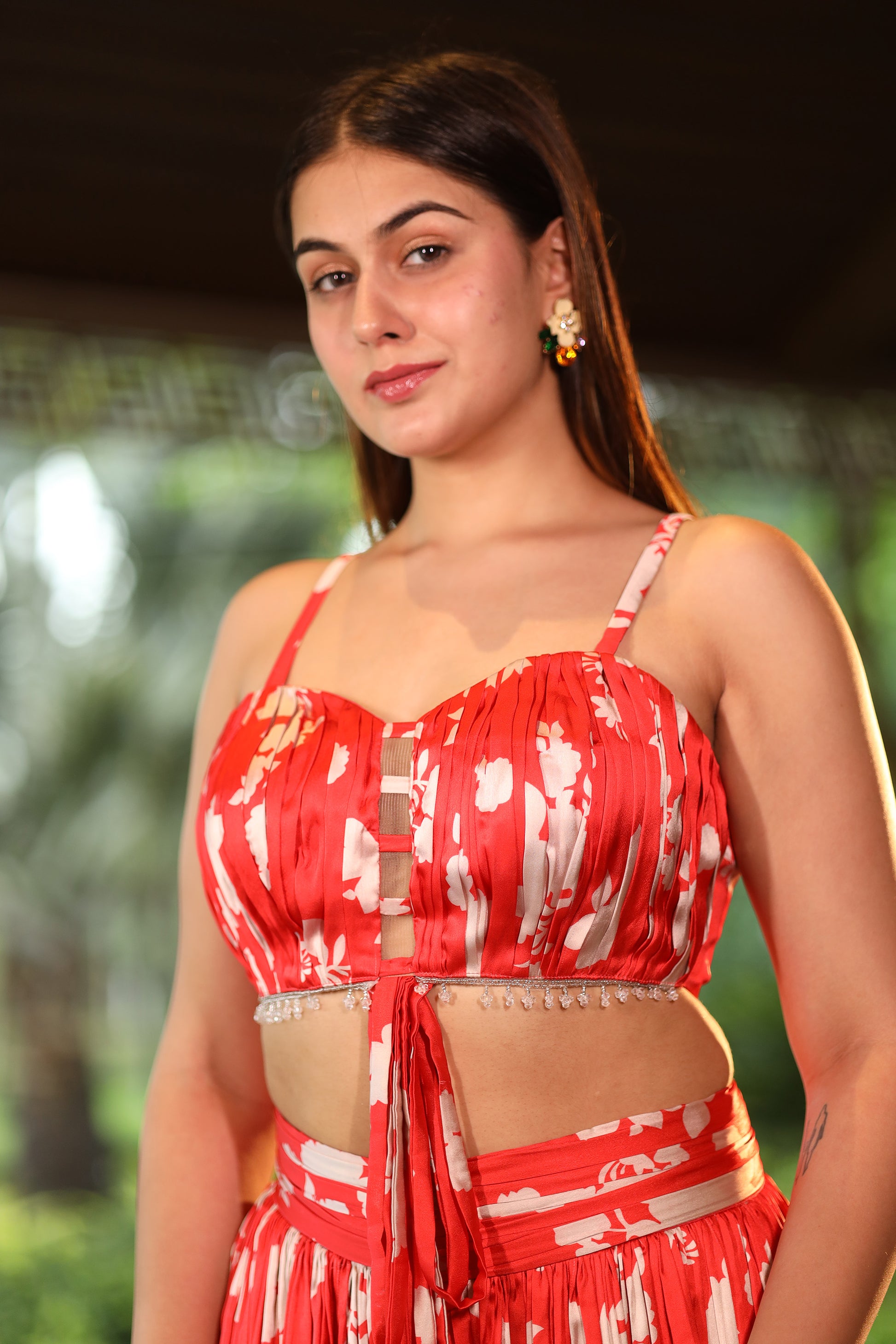 A pleated panache crop top & breazy flowy plazzo pants, adorned with touch of whimsy print & dangling lace.