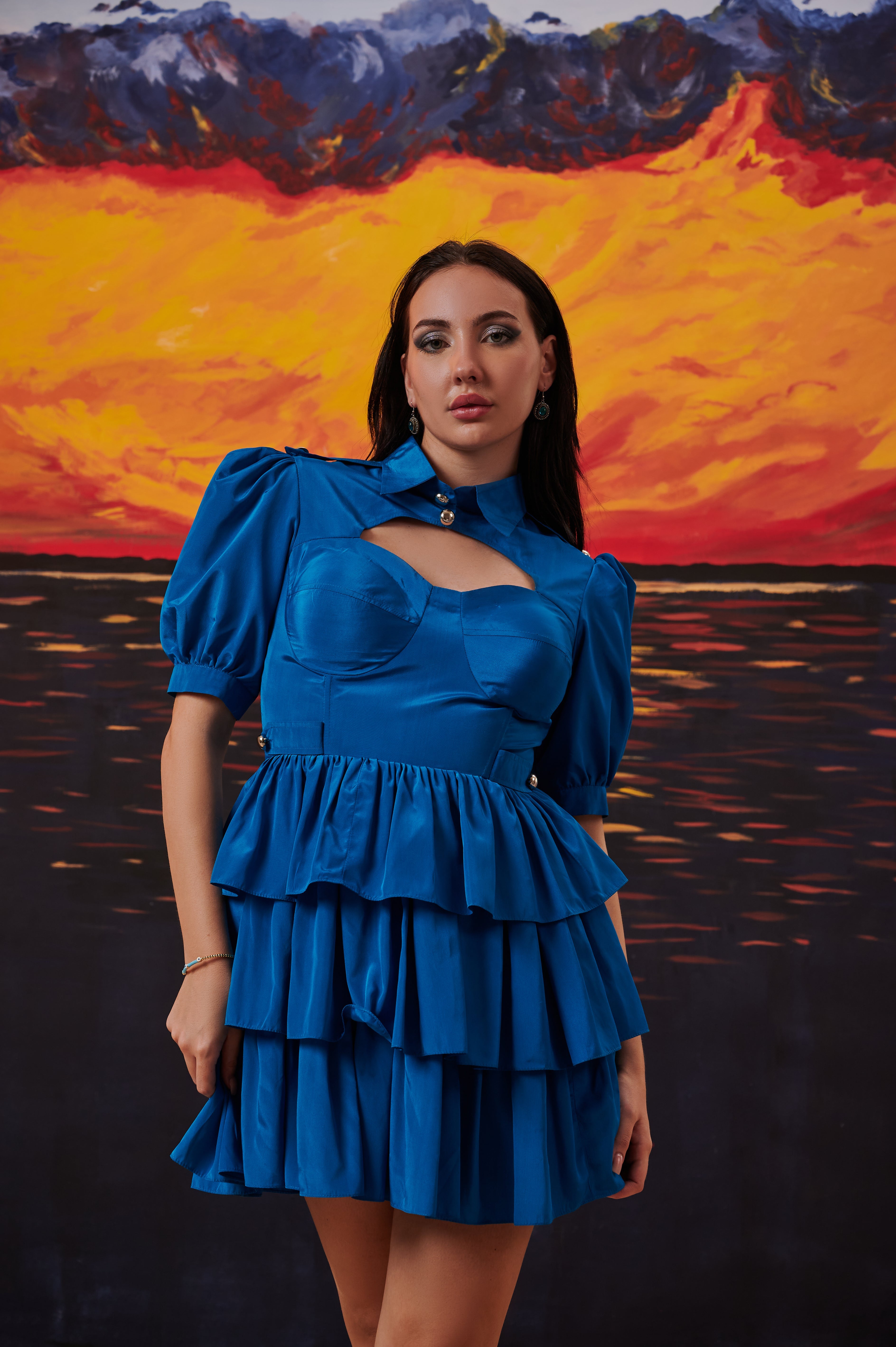 DETAILS- Short dress with fitted yok, puffy sleeves and frilled bottom. Padded, side zipper and button detailing.