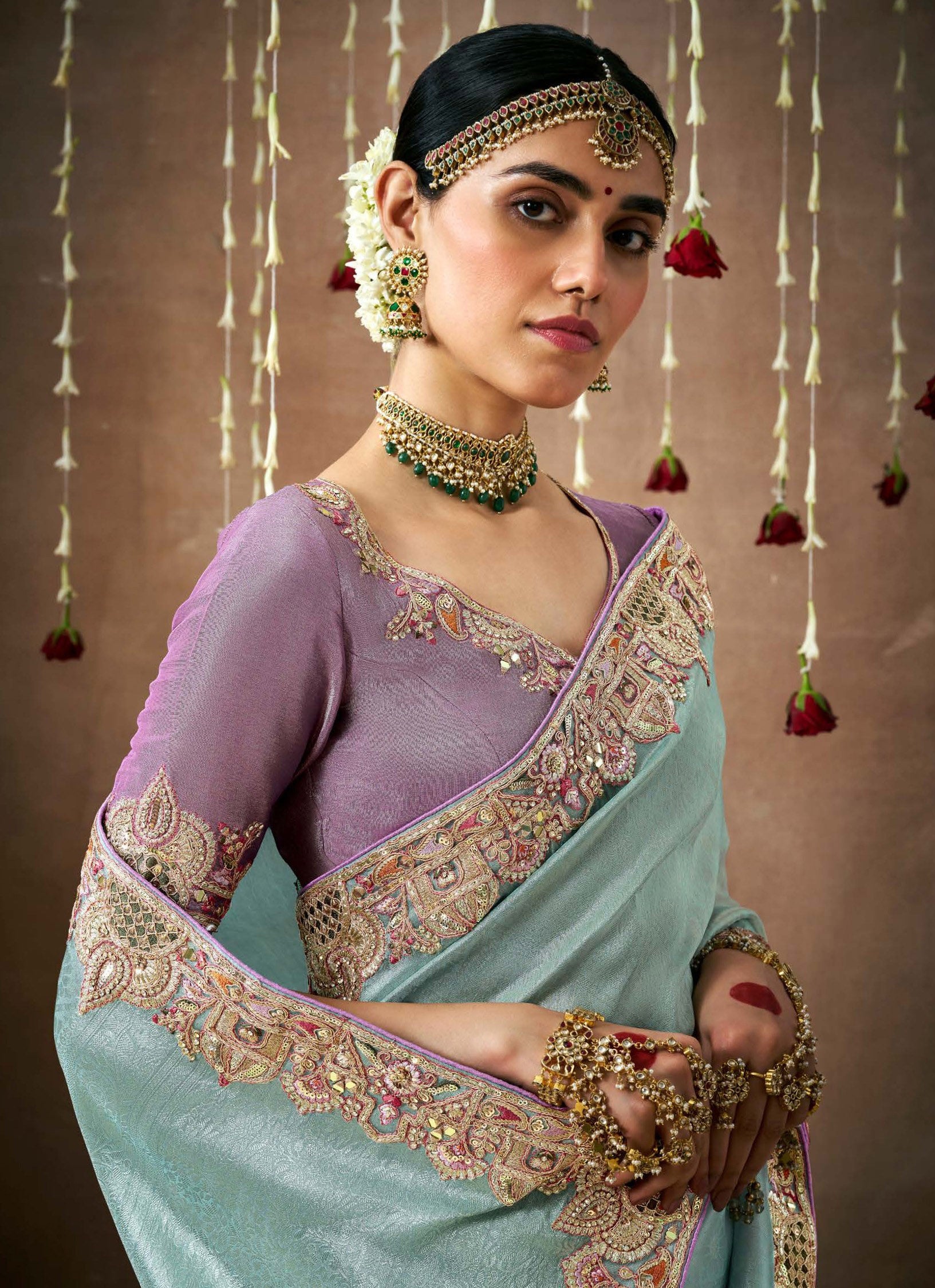Sea Blue Tissue Dola Silk Pearl & Mirror Embroidery Dulhan Saree