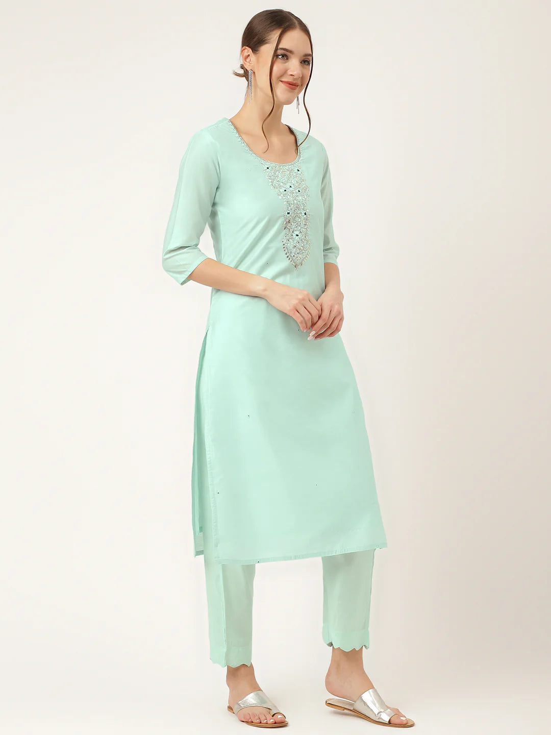 If You Are Looking For Exquisite Style in coming Festive Season And Comfort You Should Try This Awesome Outfit . Indulge in Style Sea Green Solid Printed Kurta Pants sets, Straight Hemline, and it has three-fourth sleeves . Best Suited for Formal and Informal Gatherings.