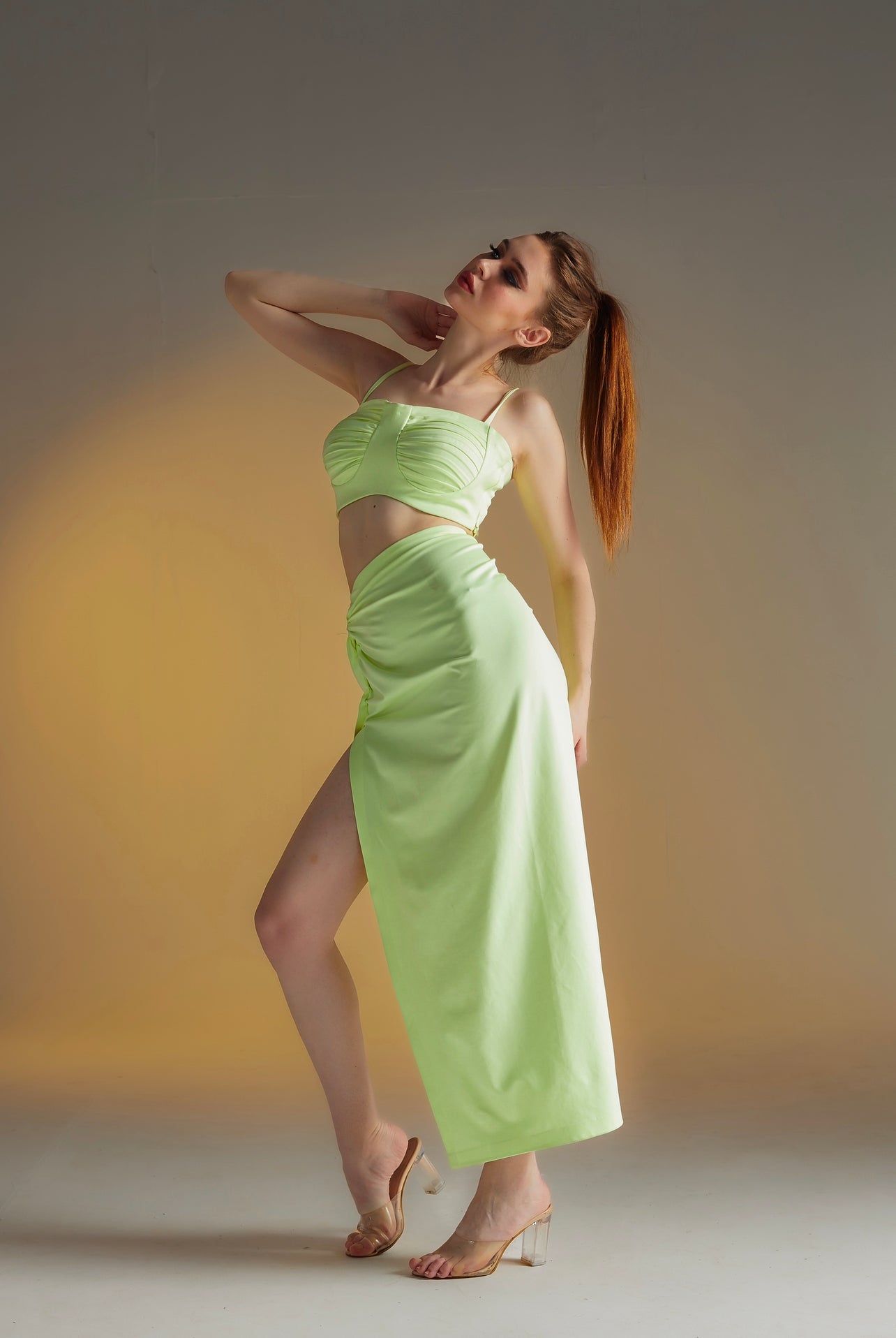 DETAIL- Neon yellow crop top with bust detailing paired with matching knotted thigh high slit skirt. Padded.