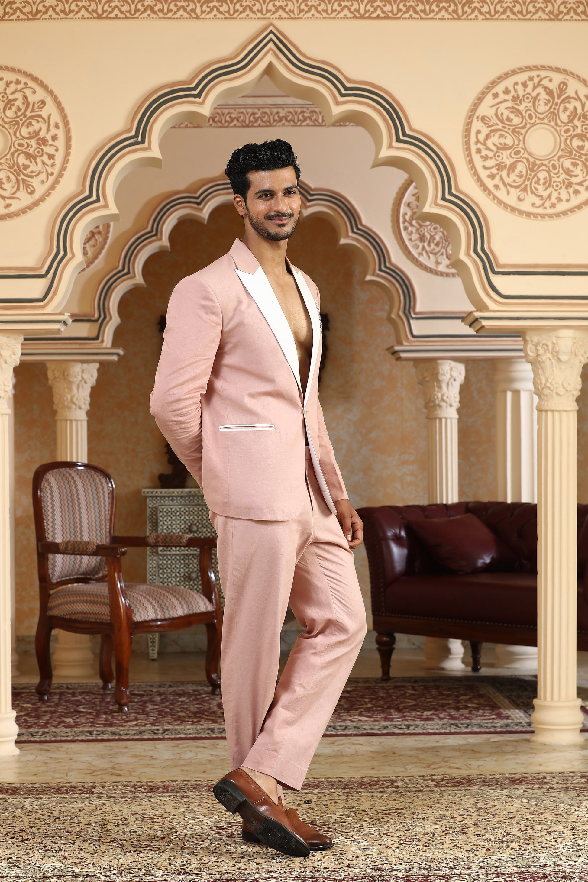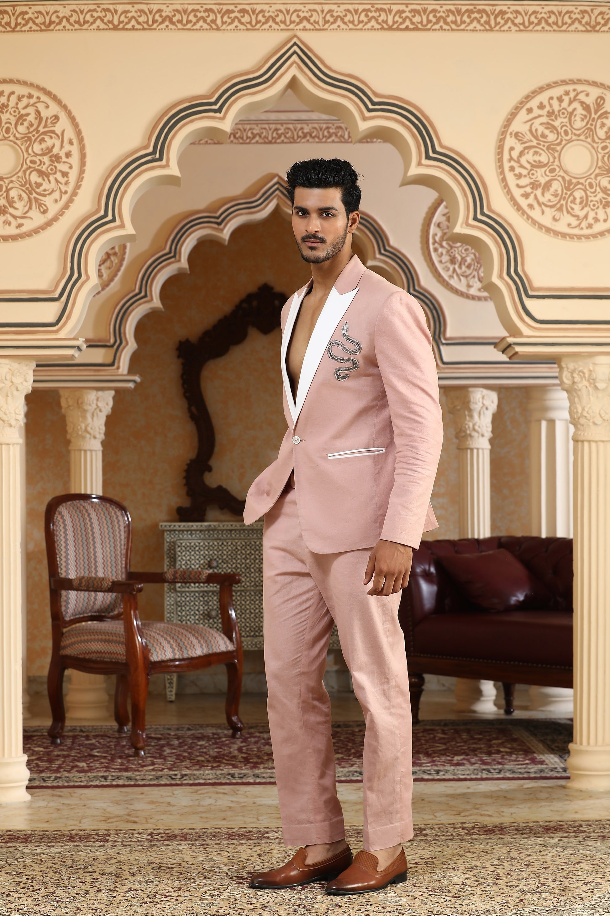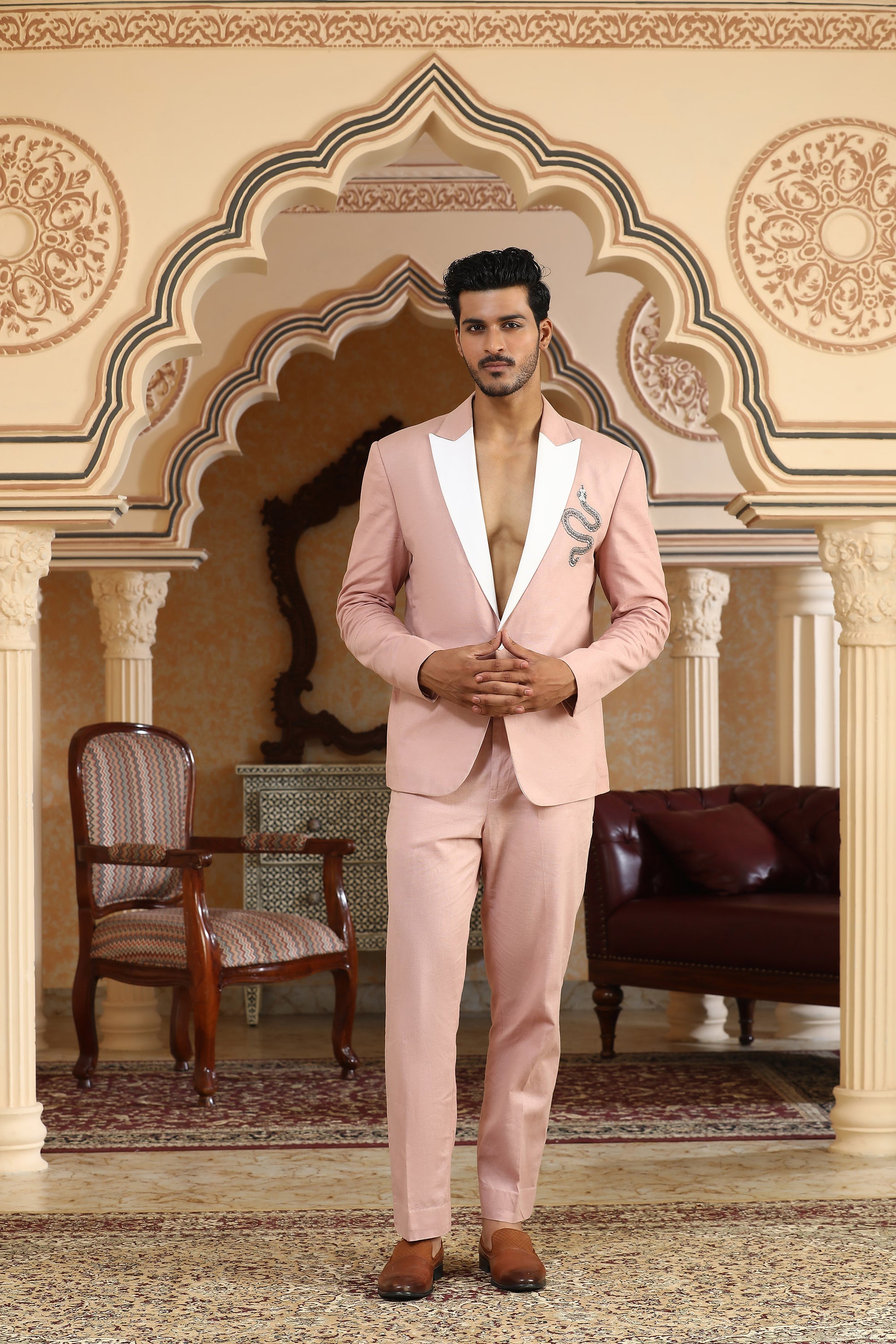 A bold conversation between softness and strength, this pink linen suit set redefines statement dressing. The back of the coat features a striking serpent motif—crafted entirely using safety pins and cutdana embroidery. A rare blend of rebellion and elegance, this piece is made for those who embrace power with subtlety and style with substance.