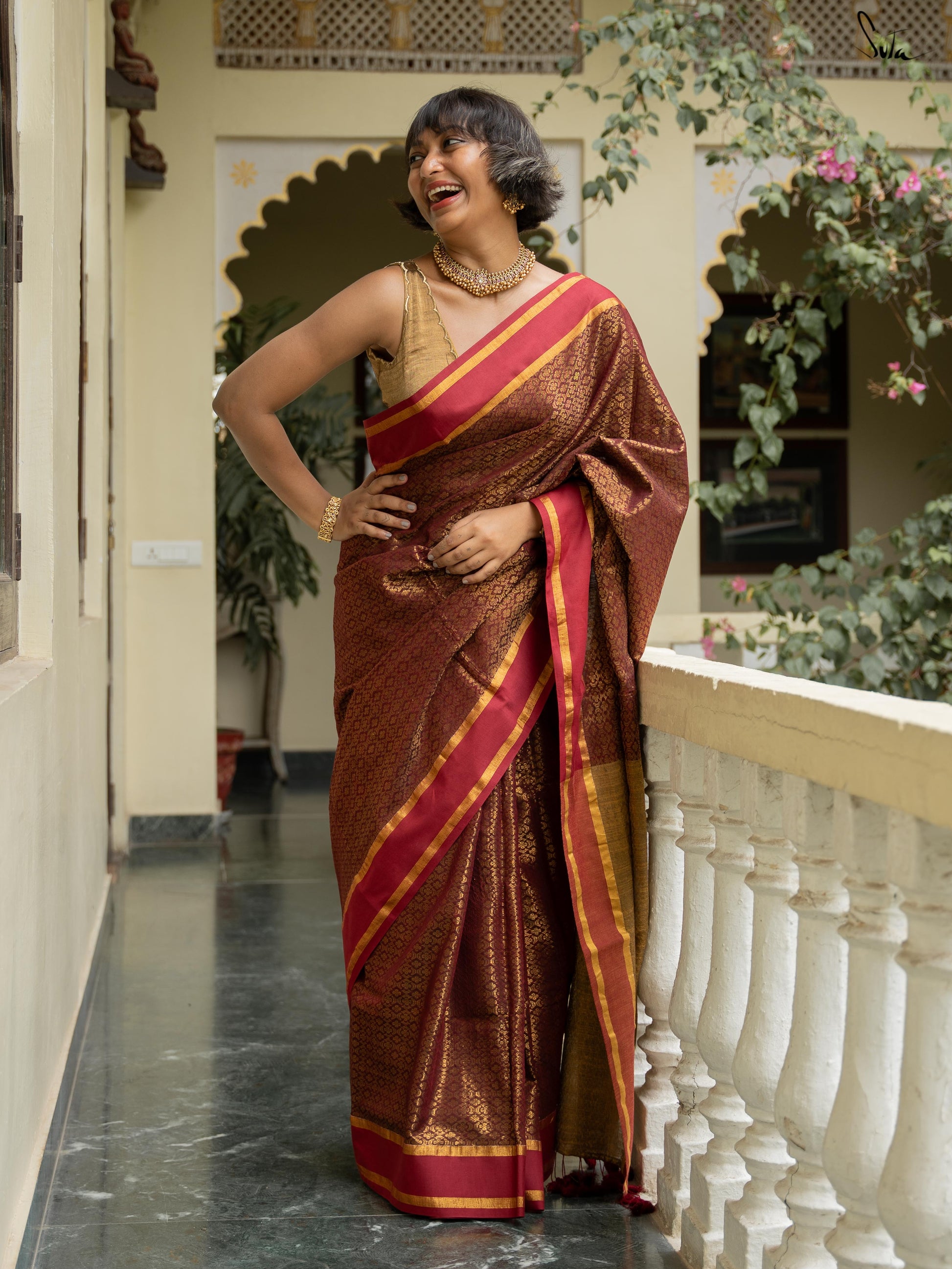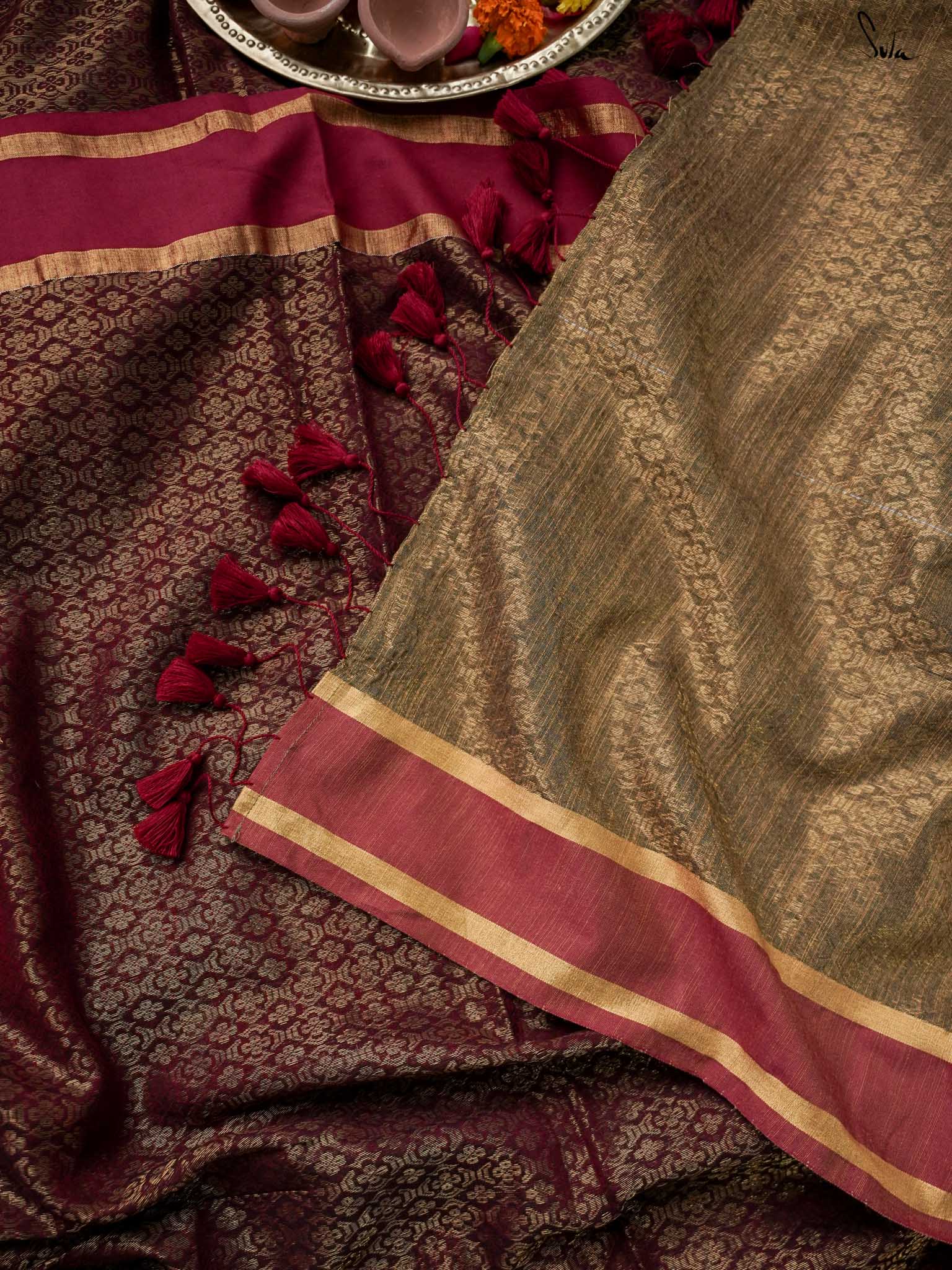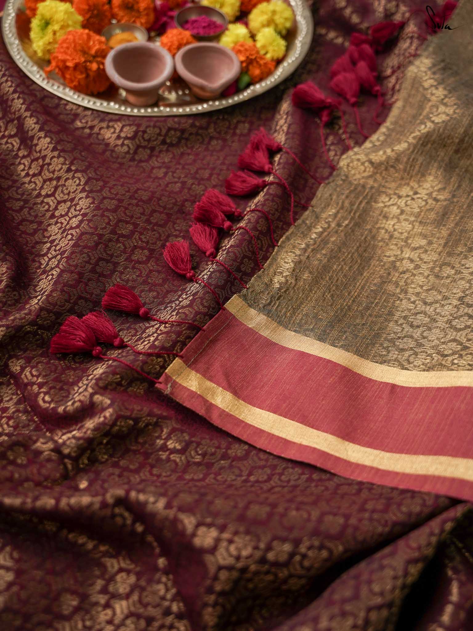 Delve into the dawn as you drape the mesmerizing Shahi Sona Saree in wine, illuminated by a rich maroon and gold border. This saree is crafted in cotton slub featuring intricate zari detailing throughout and a mustard pallu, making it the perfect festive attire.