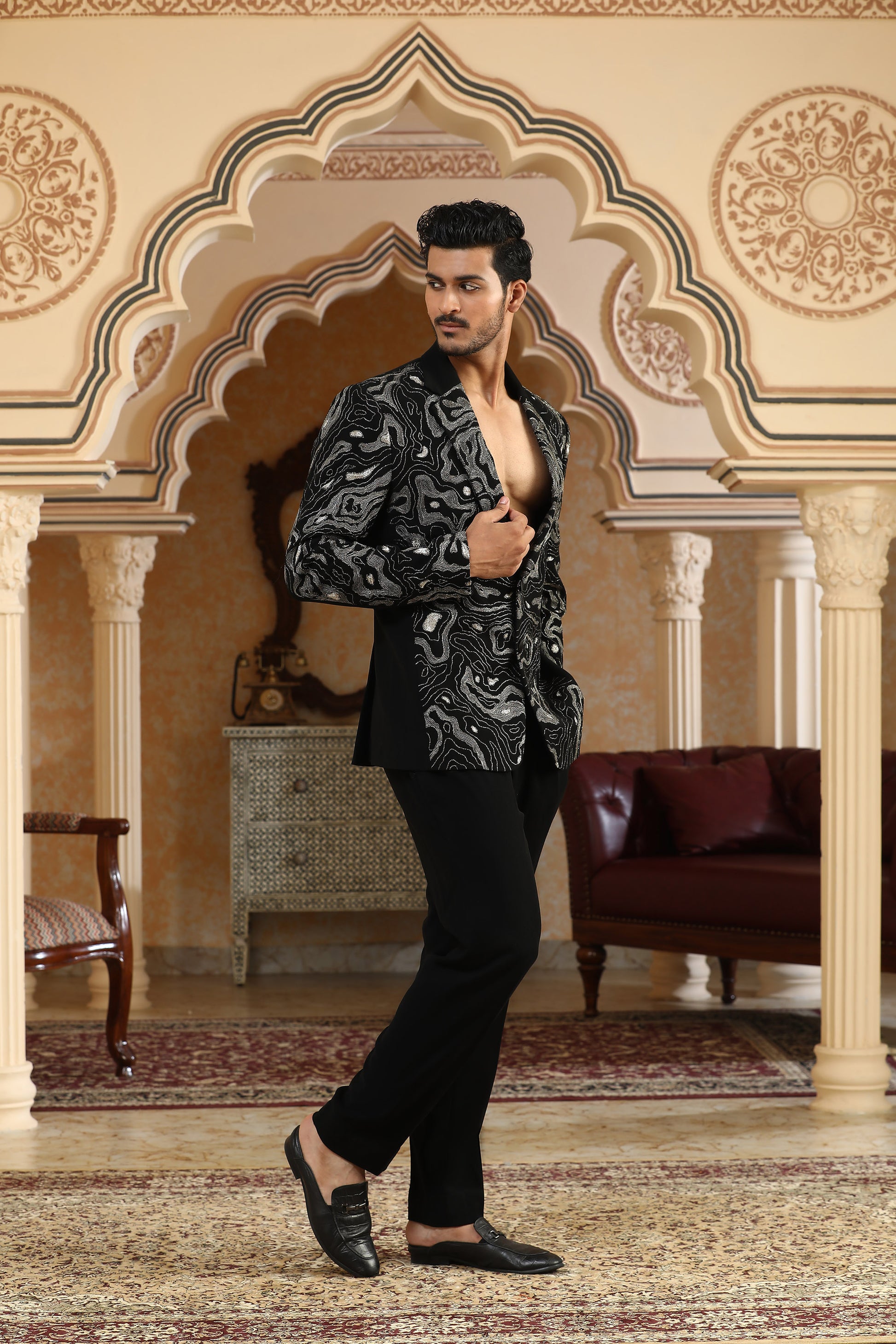 Rooted in depth and drama, the Sheersagar suit set in black Italian viscose is a regal expression of craftsmanship. The coat is adorned with fine dori work, resham threads, zari highlights, and delicate cutdana and zardozi embroidery, creating a fluid surface that reflects movement like gentle waves. Every detail is meticulously placed to evoke the mystique of moonlit waters. The set comes with coordinating tailored trousers, making it the ideal choice for evening affairs where elegance meets artistry.