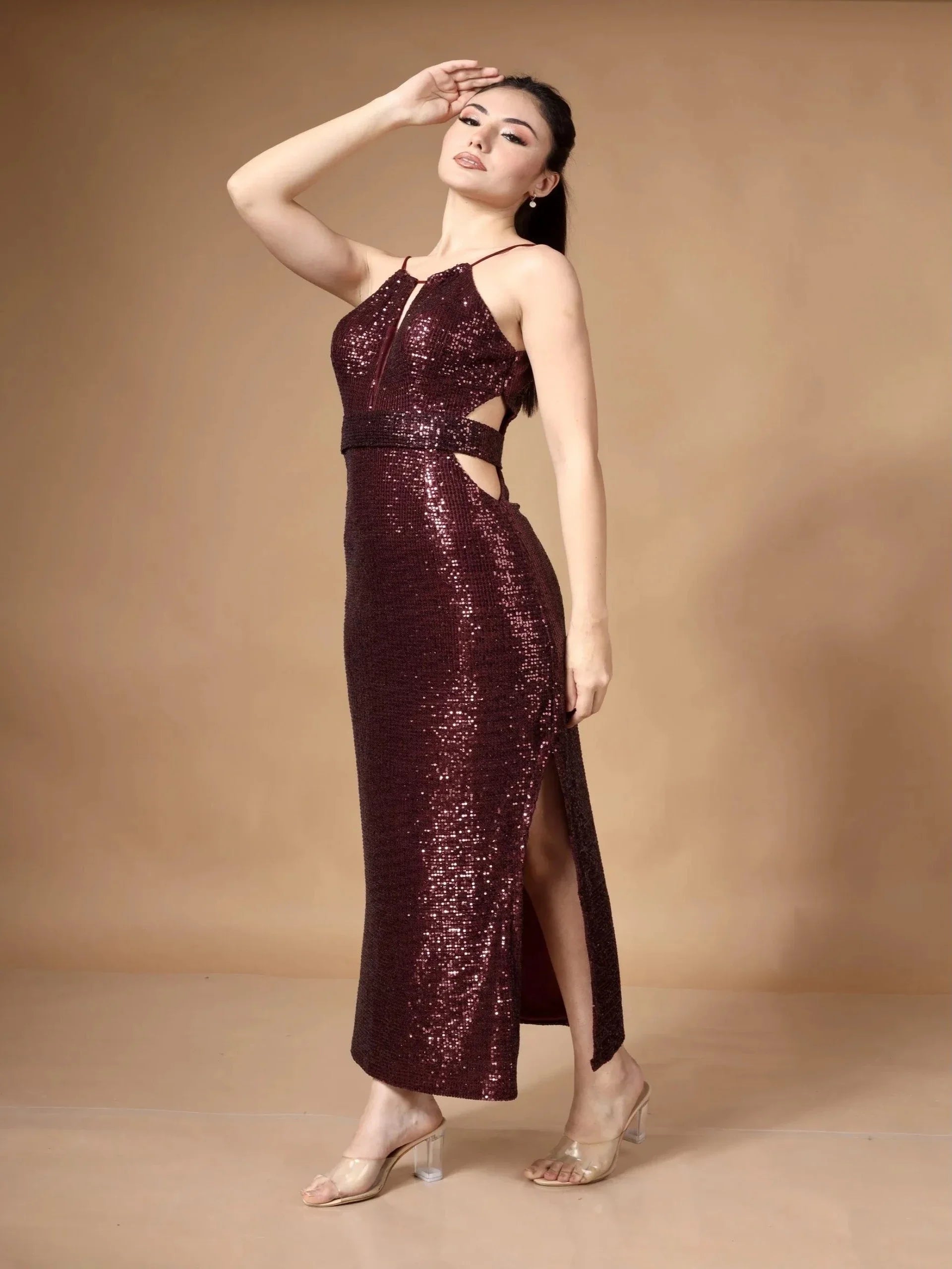 DETAIL- Wine sequin halter neck long dress with slits at both sides and a matching belt.