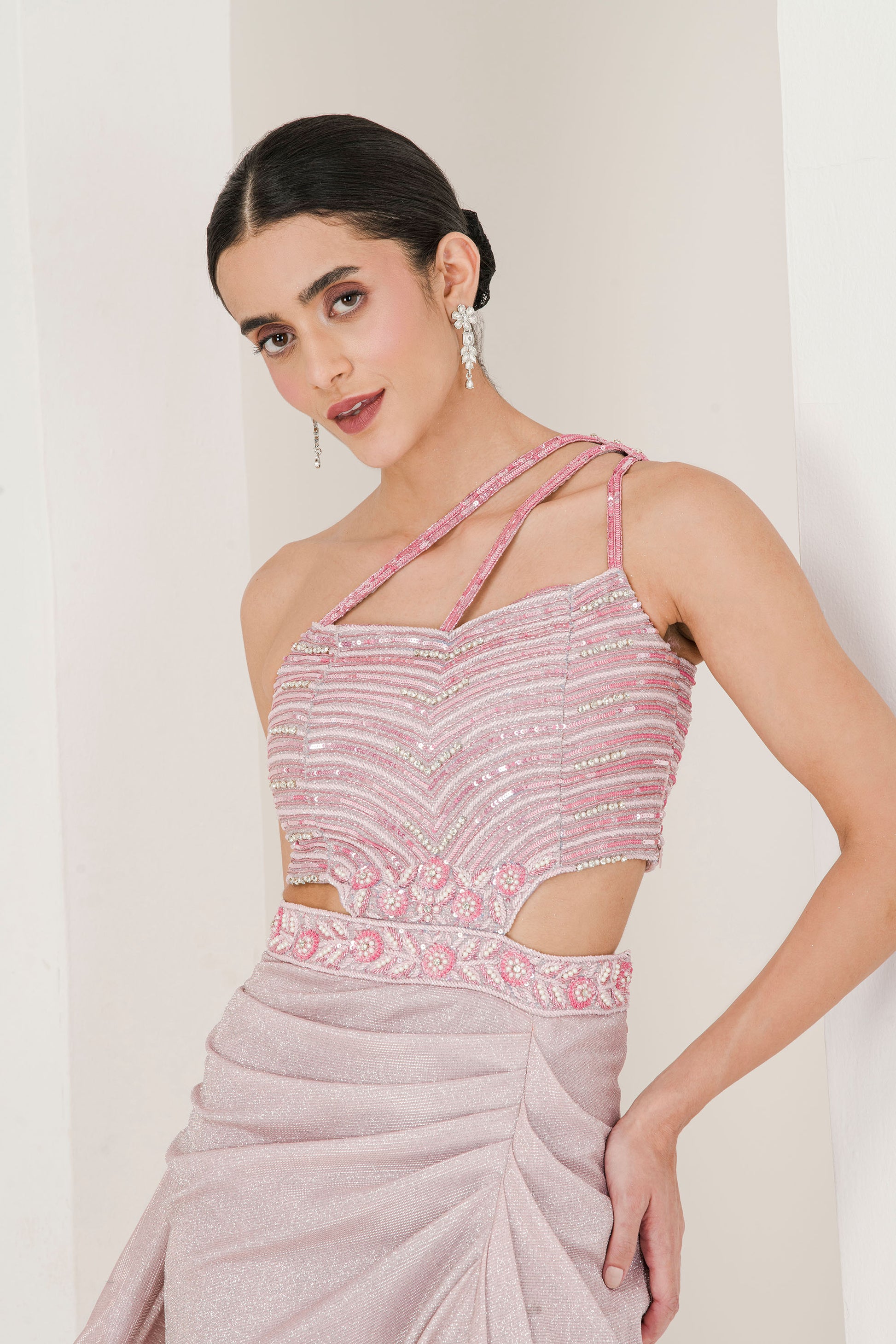 Get ready to stun the crowd with this exquisite and fancy ready-to-wear embroidered draped saree gown. The saree is attached with blouse with intricate pearls,beads,sequins and swarovski embroidery that shimmers beautifully in the light. The saree is made with imported shimmer fabric and has a high slit to add glam to the overall outfit.