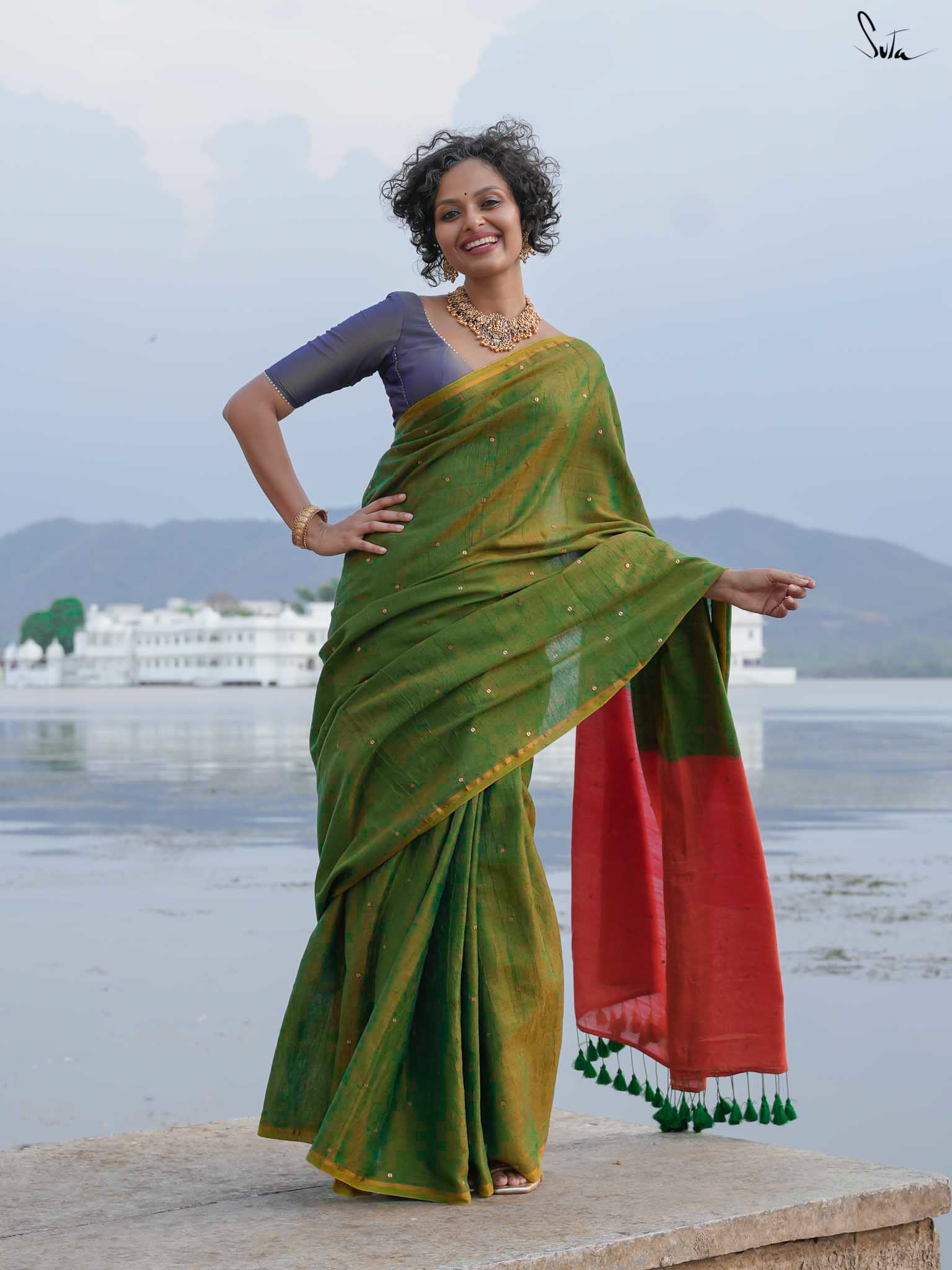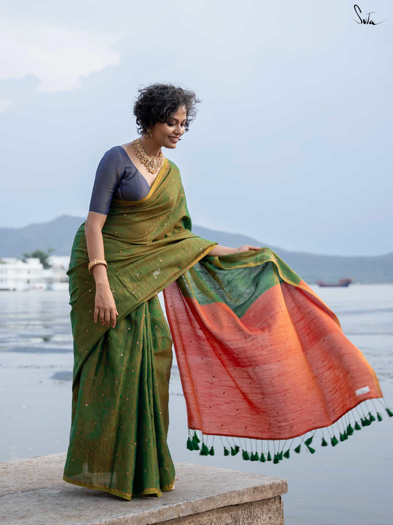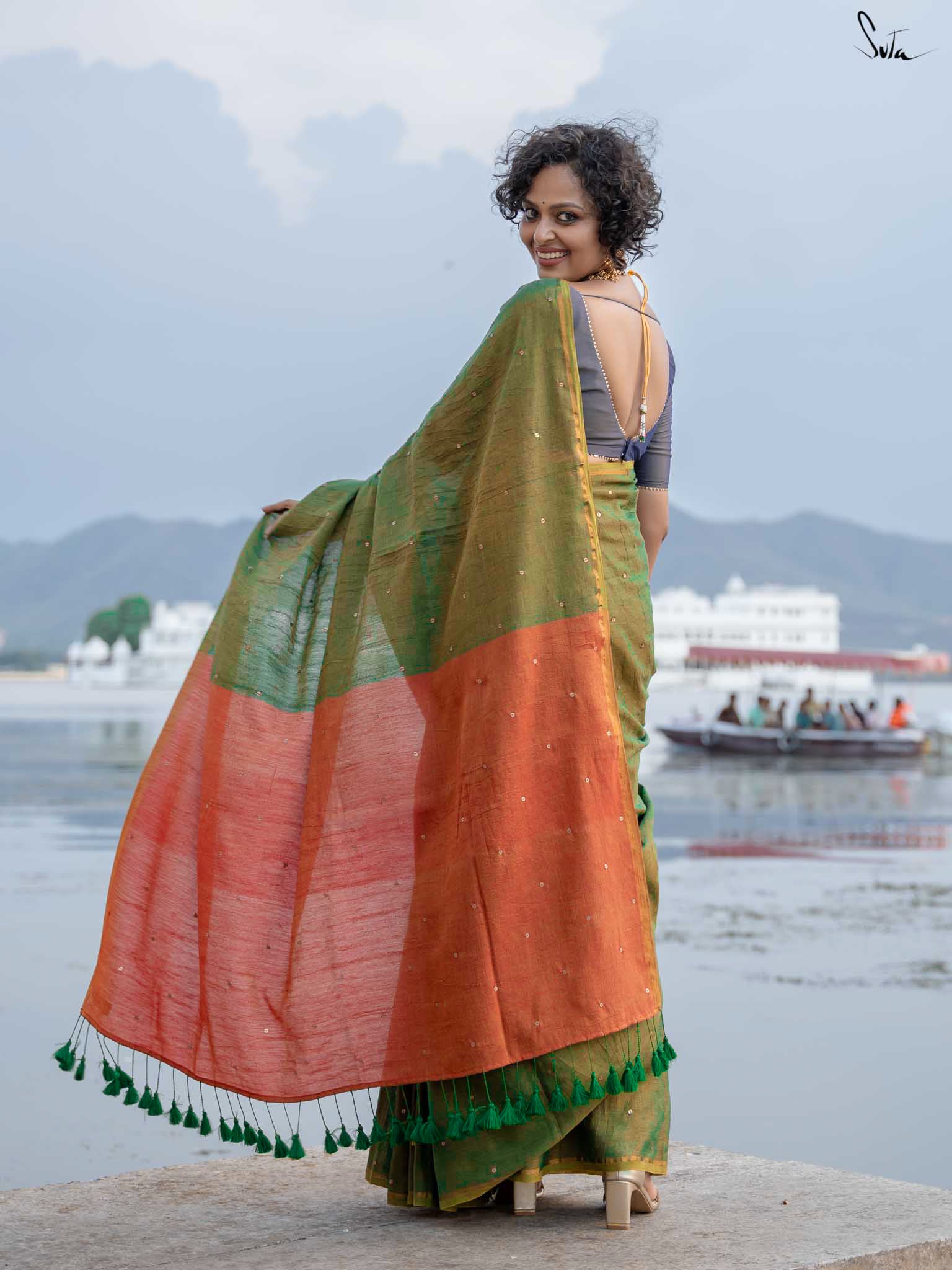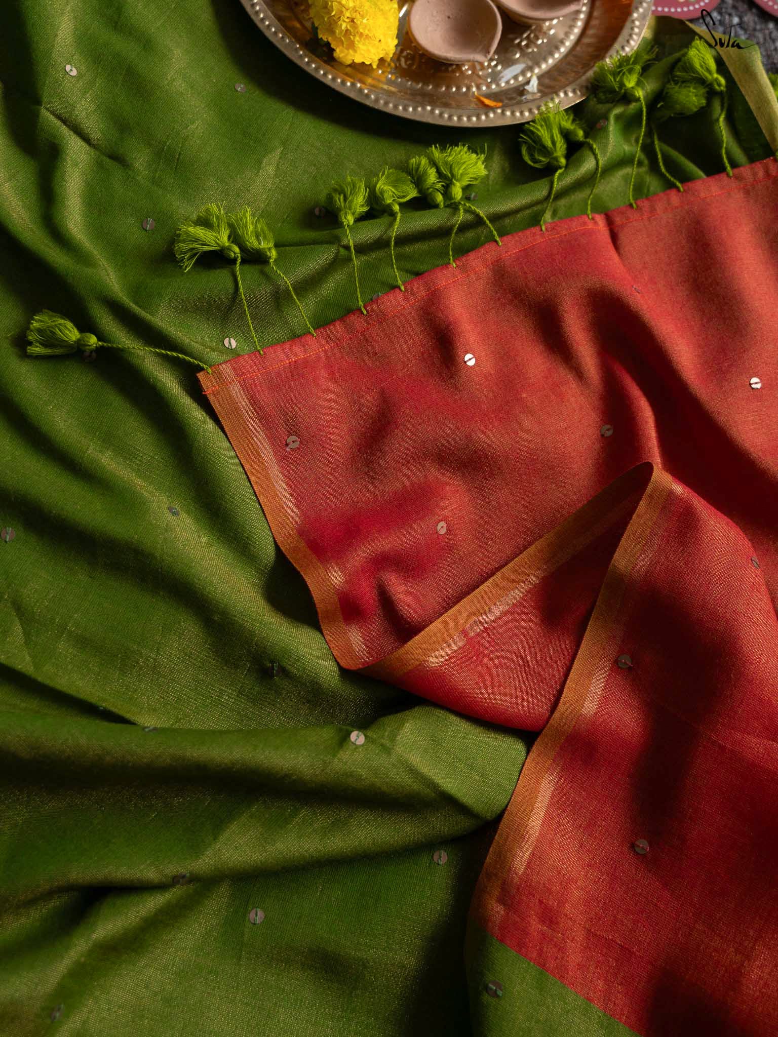 Shubra, meaning radiant, captures the magic of a starry night just before dawn. The green saree, crafted from rich acrylic cotton with zari, is brought to life by a delicate hand-embellished chumki work throughout and a gold zari border. A contrast rust-orange pallu adds warmth, capturing the essence of the rising sun and transforming your simple moments into something extraordinary. The saree also comes with an attached rust-orange blouse piece, which can be easily styled into any design or pattern you prefer, making it a versatile addition to your wardrobe. With this mesmerizing piece, let your inner light shine gracefully.