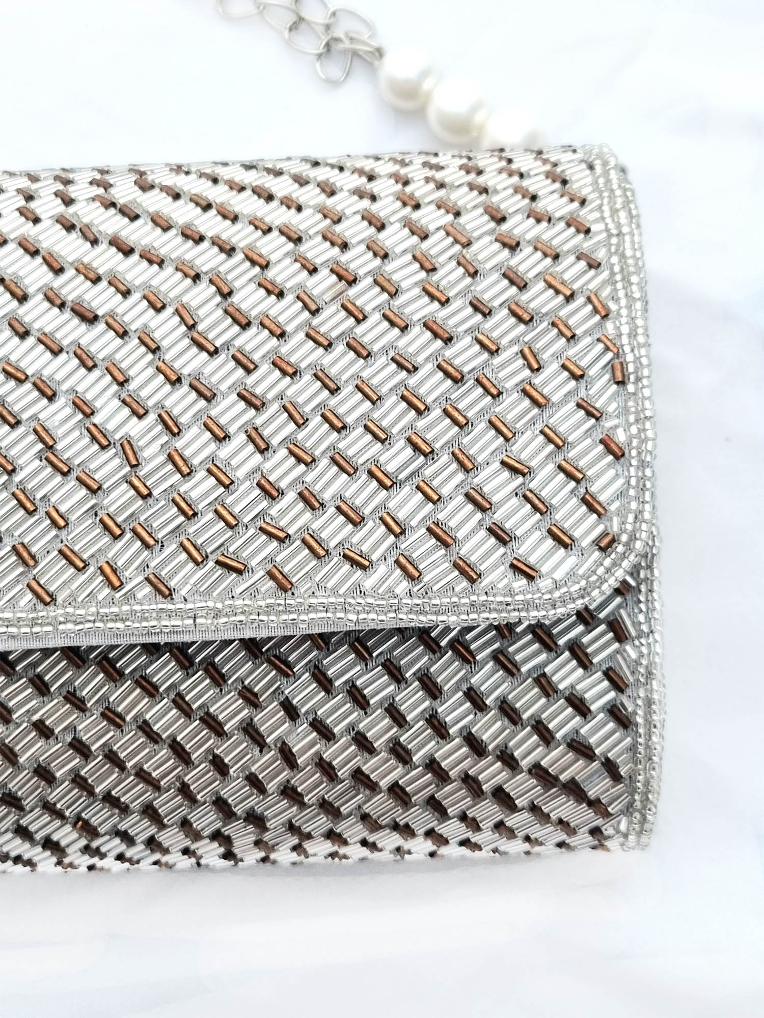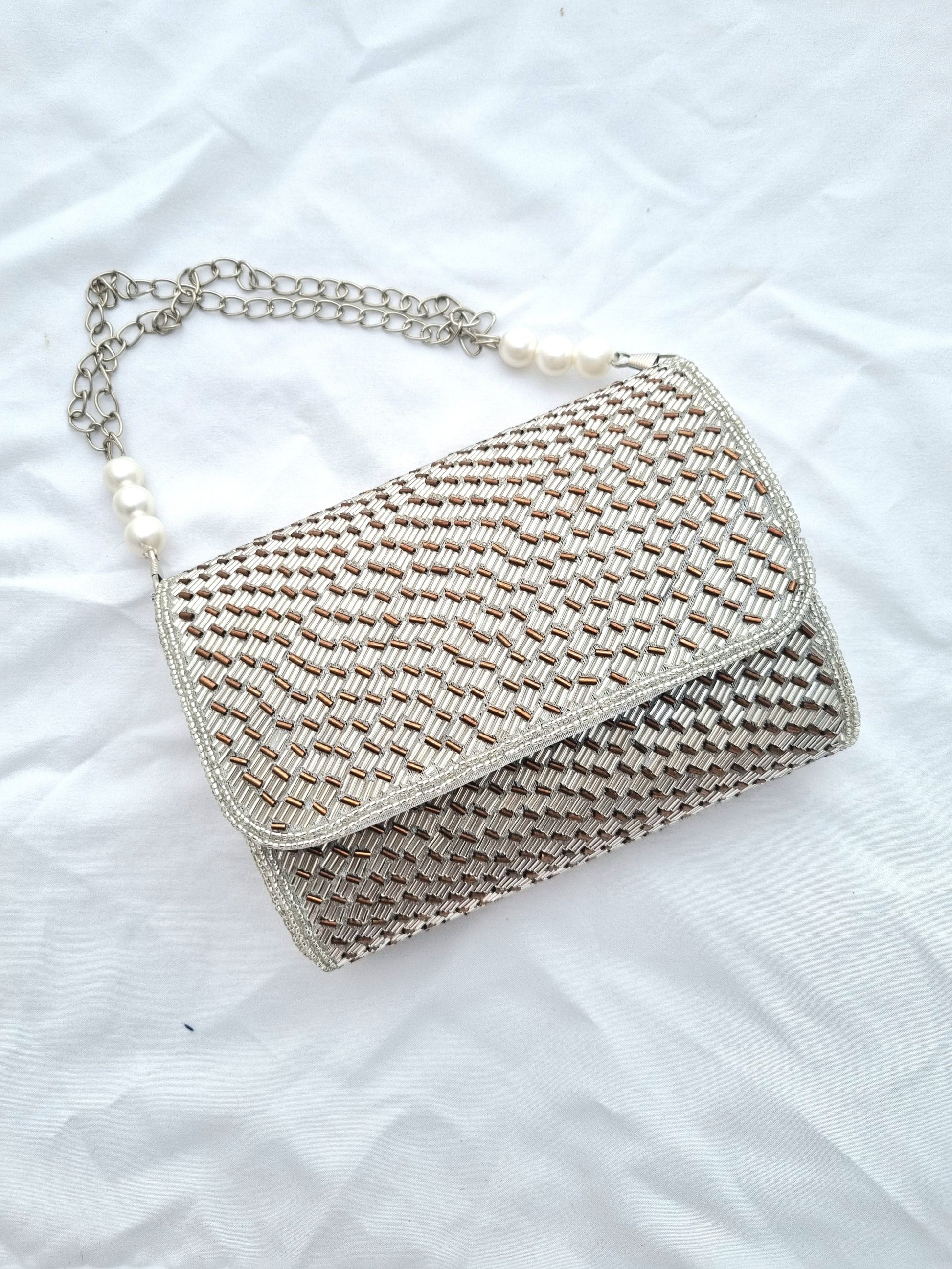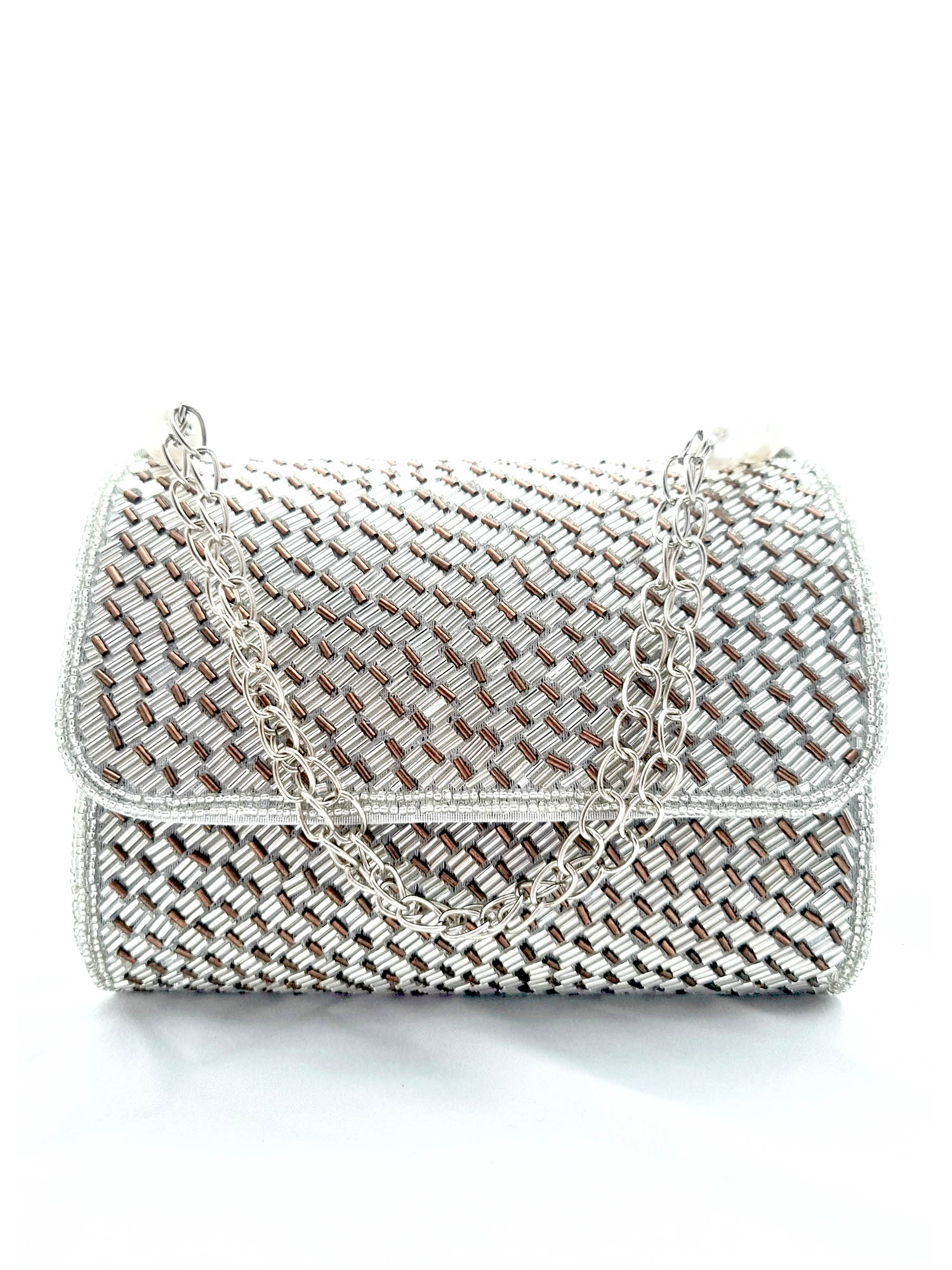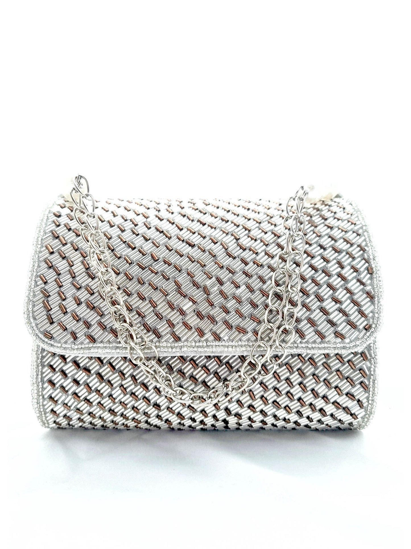 Flopover clutch with beaded handwork in a weave pattern on all sides. Clutch comes with a chain handle