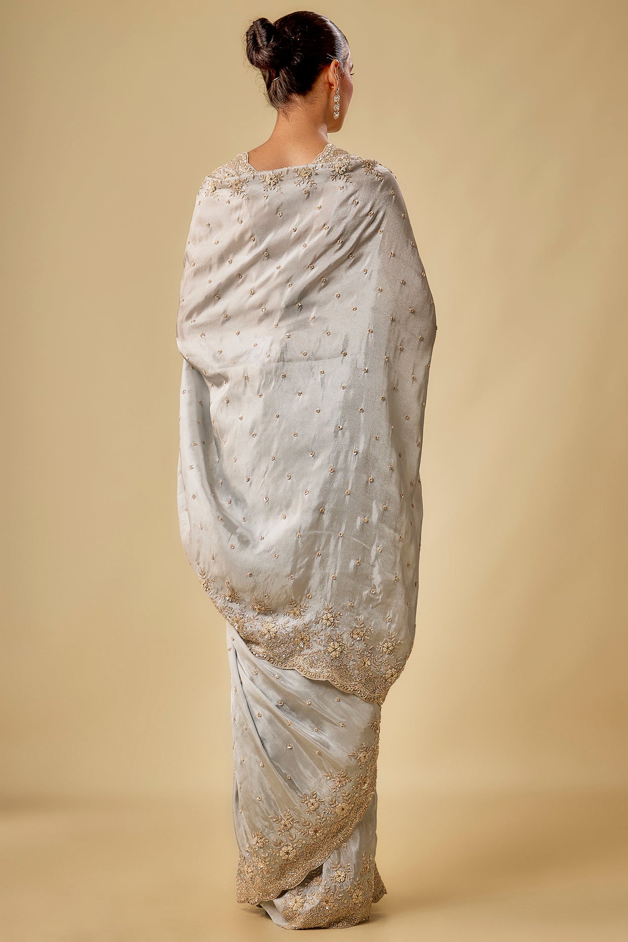 A Mesmerizing Silver Saree Set That Captivates With Its Elegance. The Eye-Catching Saree Is Crafted In Tissue Organza With Sequins Embellishments. It Is Paired With An Unstitched Blouse Fabric. Accessorize It With Statement Earrings And Heels For Weddings Or Engagement Ceremonies.