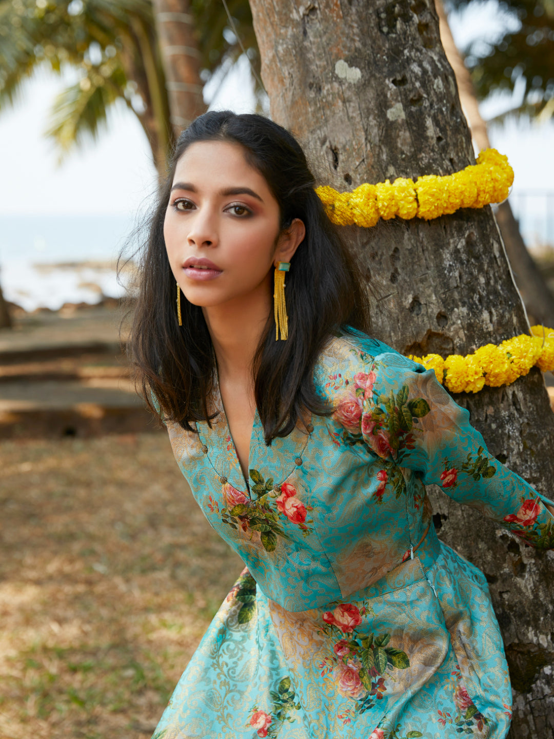 Sky Blue Printed Jacquard Flaired Skirt Top
