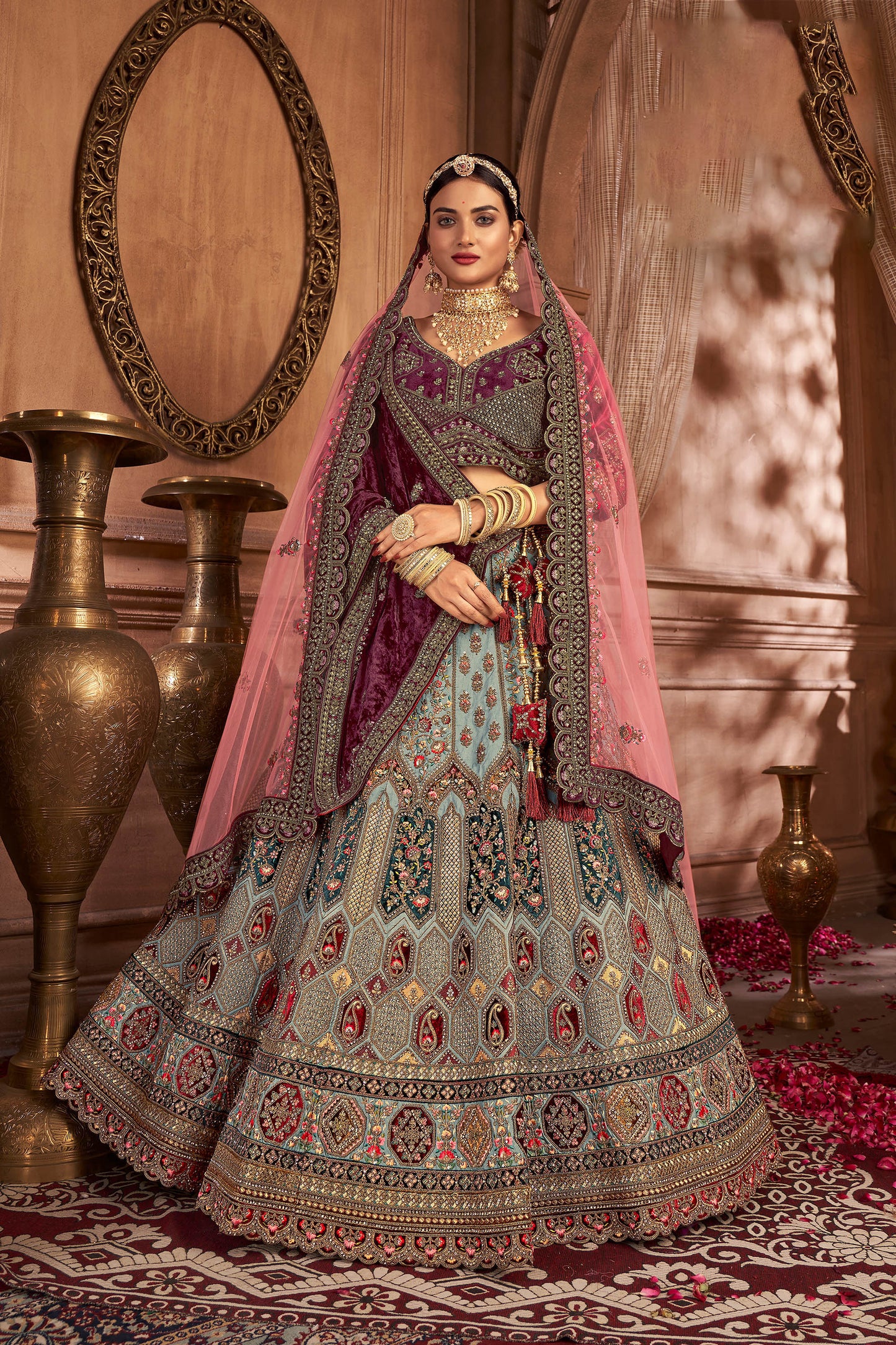 Sky Blue Velvet Hand Embroidered Heavy Bridal Lehenga