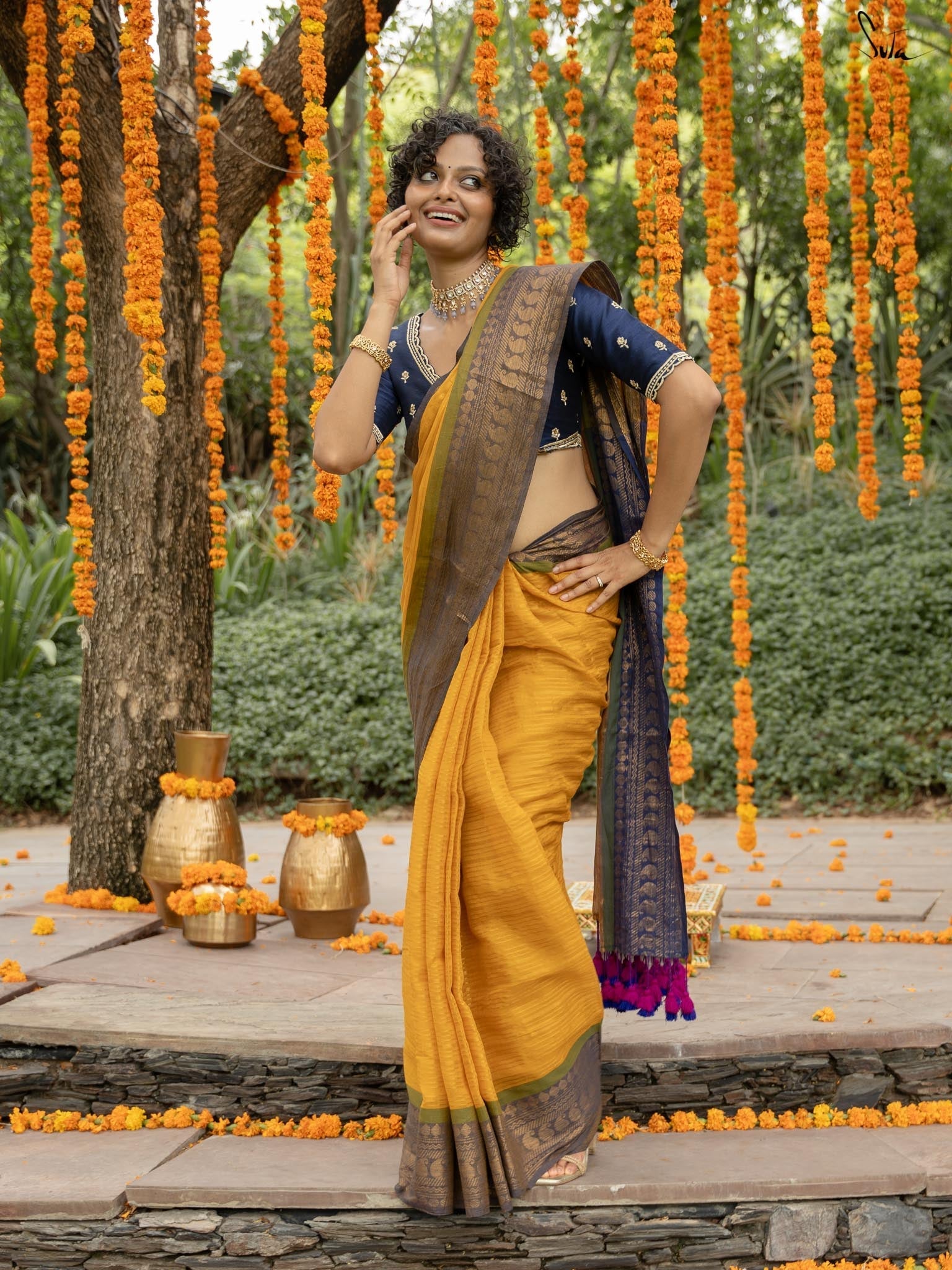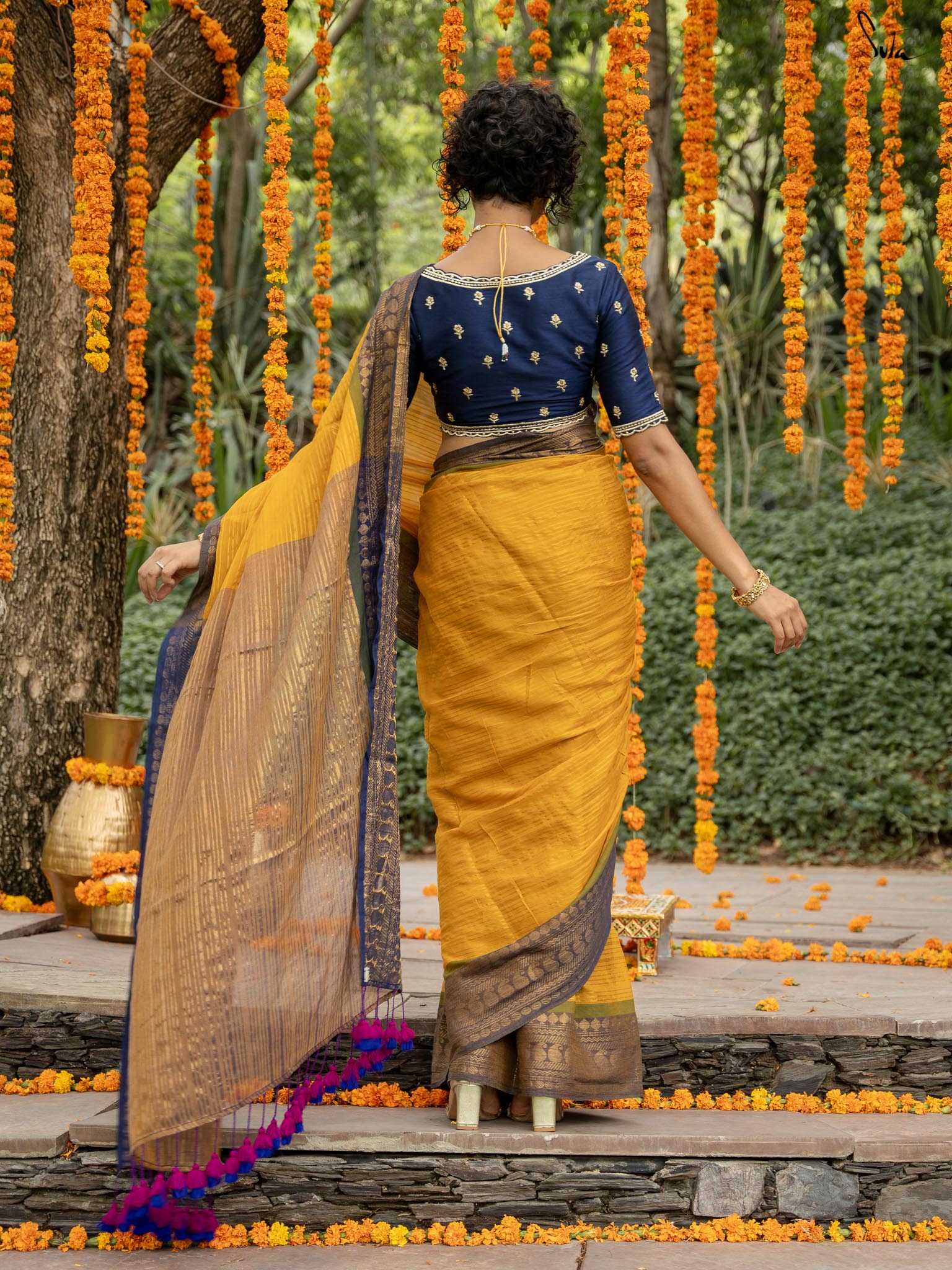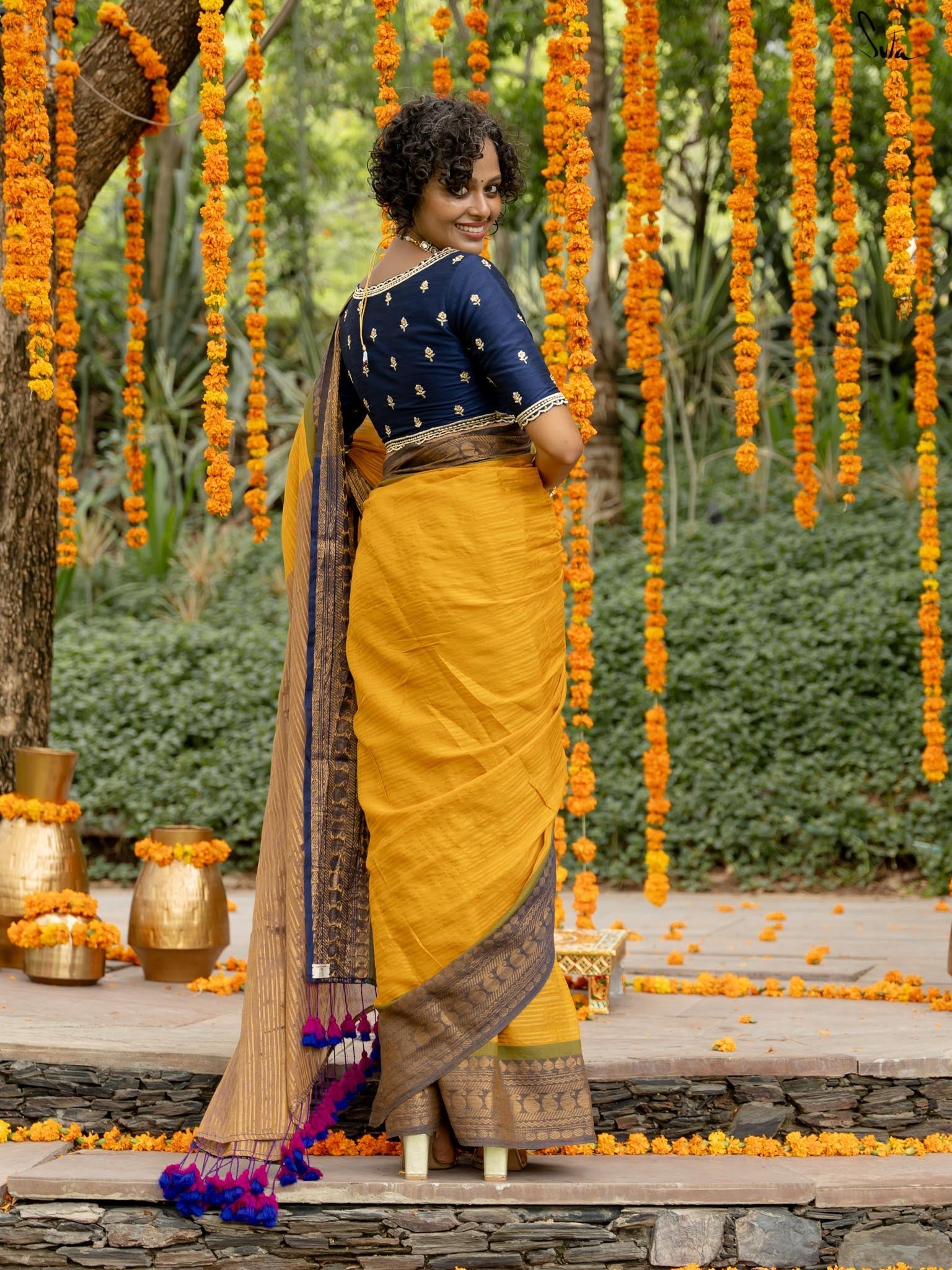 The "Sone ka rang' saree is a handwoven masterpiece crafted from heavenly mul cotton zari. Featuring a beautiful mustard hue which is complemented by a contrasting border, colorful tassels playfully adorn the pallu and make it a stunning ensemble! Drape the saree up with Suta's 'Neelam Madhu' blouse and transmit a glorious charm with every step.