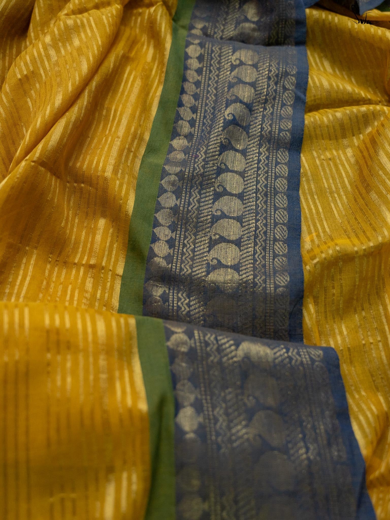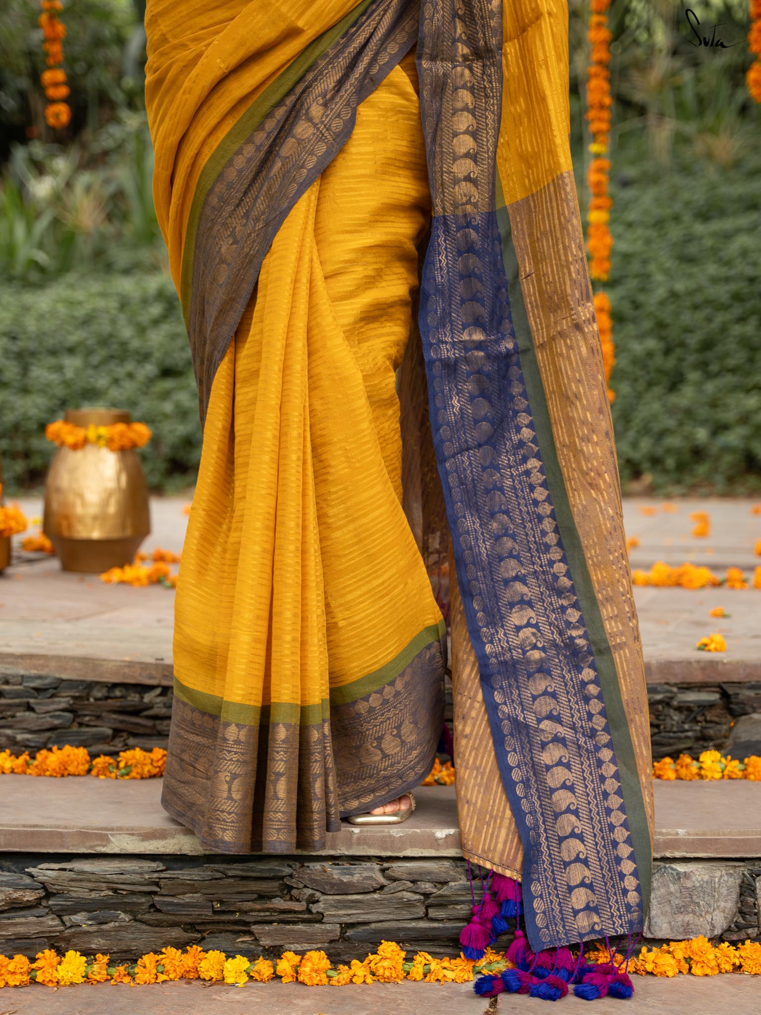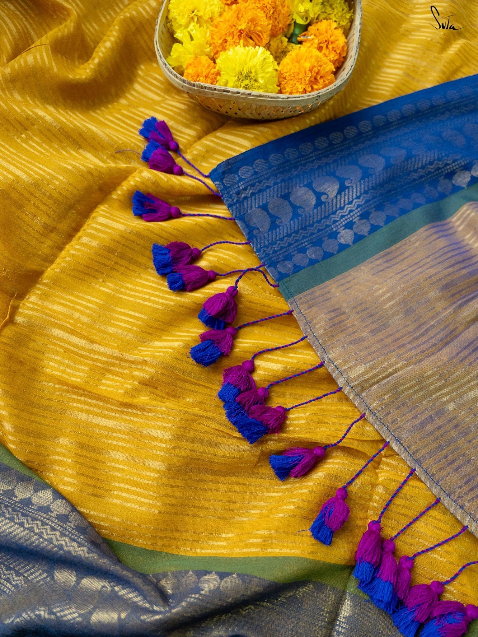 The "Sone ka rang' saree is a handwoven masterpiece crafted from heavenly mul cotton zari. Featuring a beautiful mustard hue which is complemented by a contrasting border, colorful tassels playfully adorn the pallu and make it a stunning ensemble! Drape the saree up with Suta's 'Neelam Madhu' blouse and transmit a glorious charm with every step.