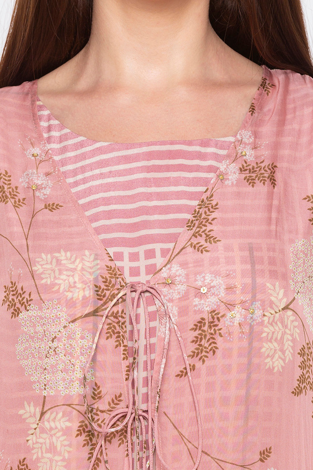 Pink Winddance Printed Jumpsuit In Satin Paired With Jacket With Neck Tie-Up In Chiffon