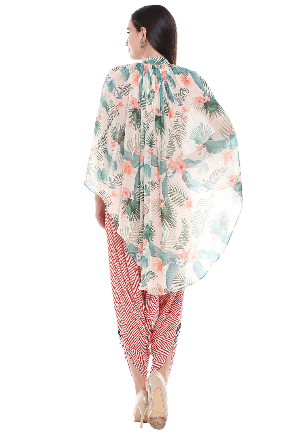 Tropical Printed Cape With Printed Red Dhoti Jumpsuit