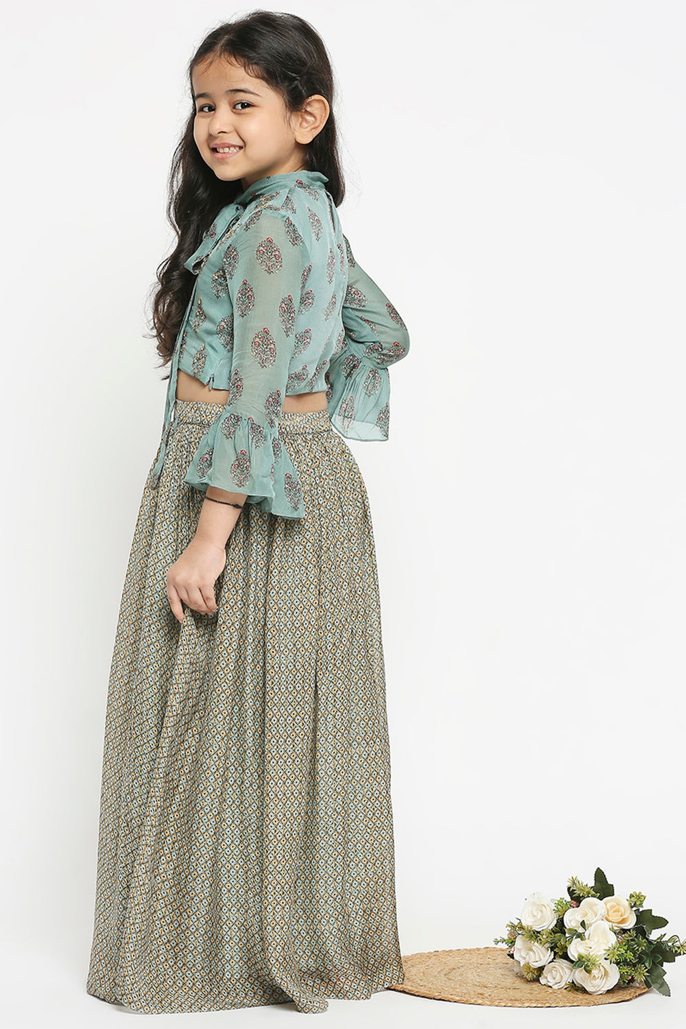 Printed Skirt Paired With Crop Top Which Has Bell Sleeves And Neck Tie Up