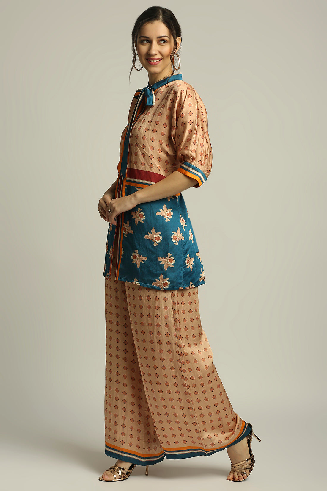 Peach Orchid Bloom Printed Shirt Top With Neck Tie-Up Paired With Peach Pant In Satin