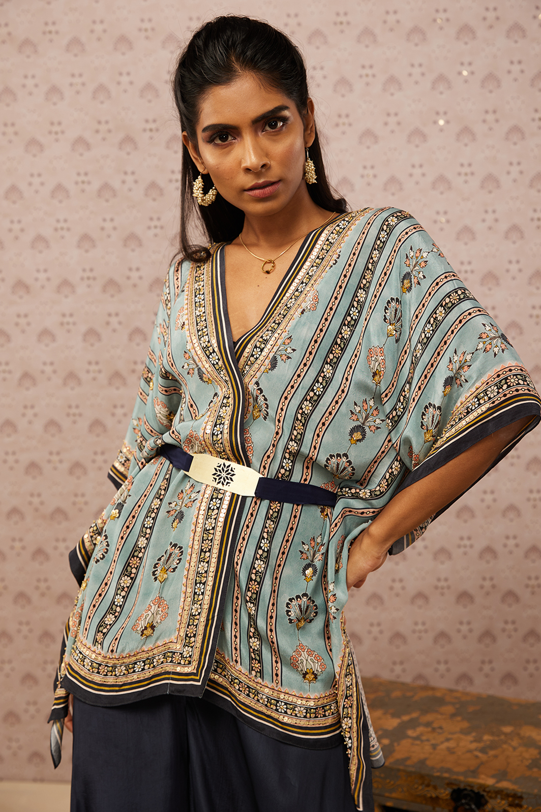 Ice Blue Sarouk Embroidered Kaftan Kurta And Solid Colored Pants Paired Metal Belt