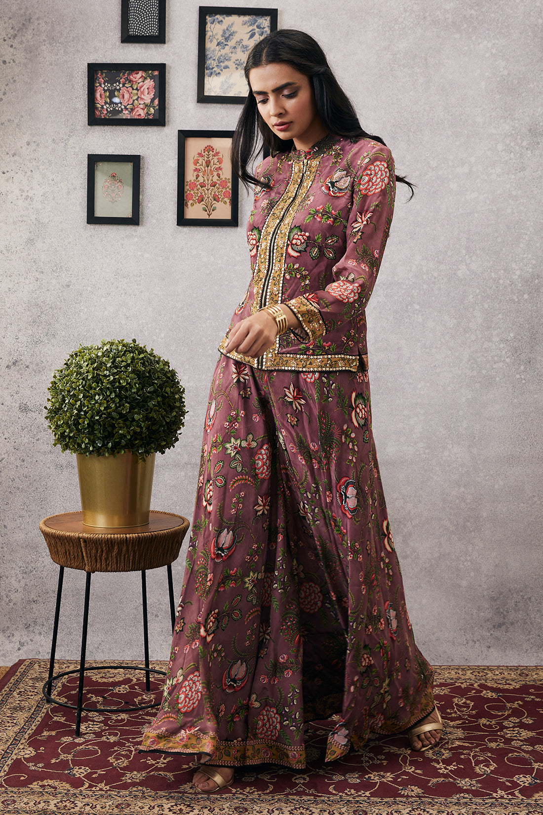 Pink Mehr Embroidered Jacket With Flared Pants In Crepe.
