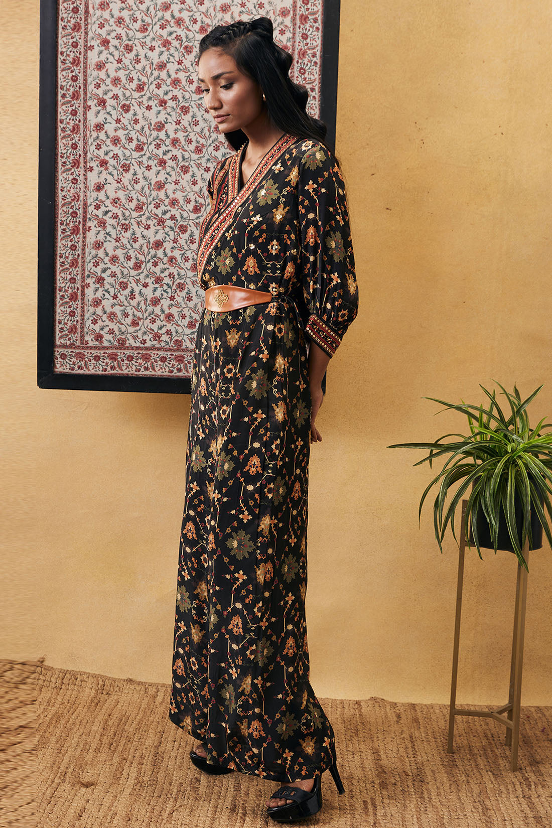 Black Zahra Embroidered Overlap Jumpsuit With Statement Leather Belt.