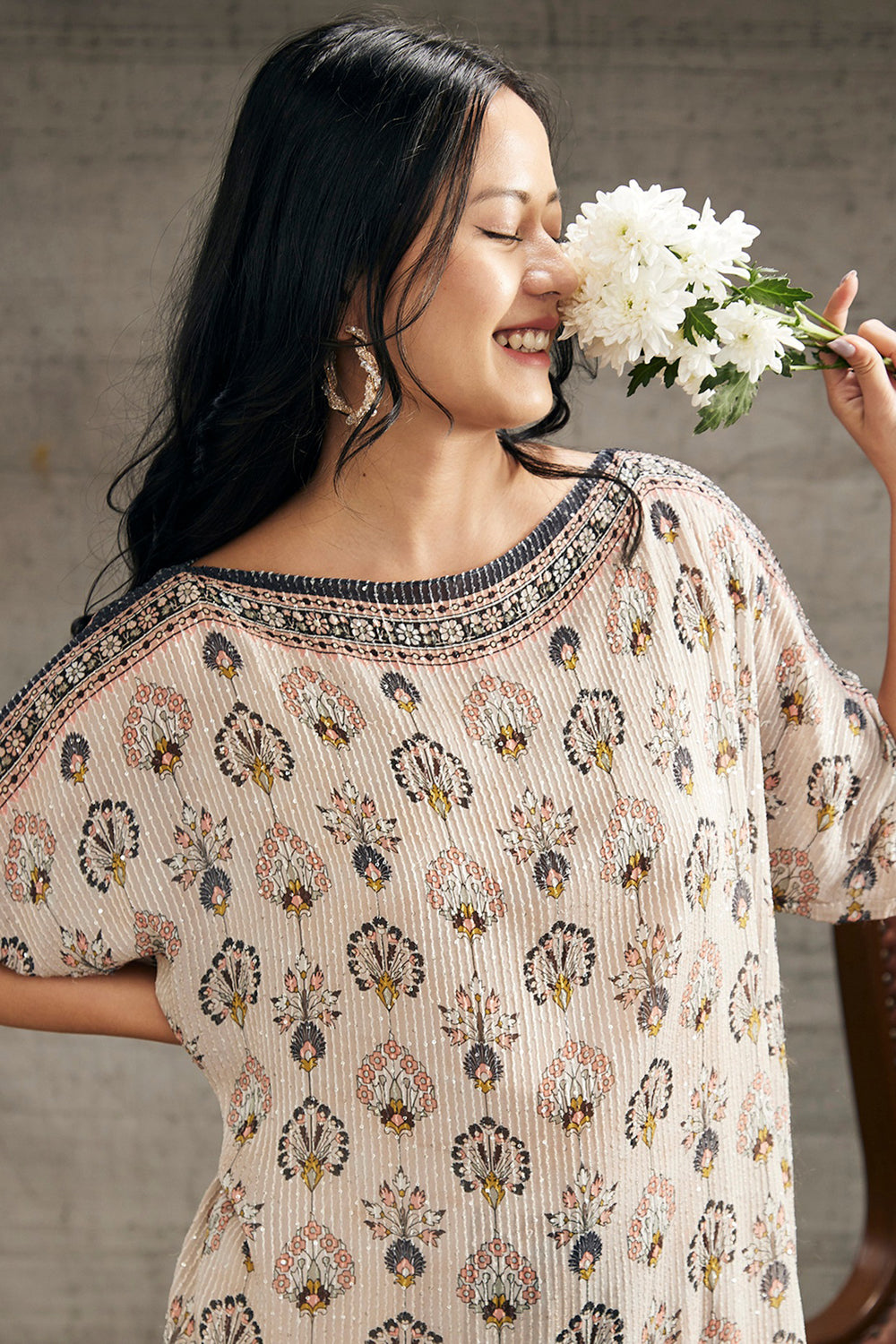 Beige Sarouk Kimono Top And Pants In Sequin.